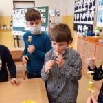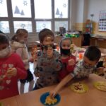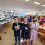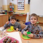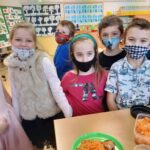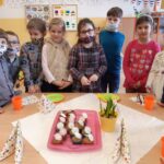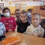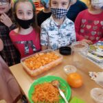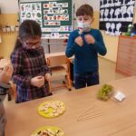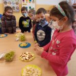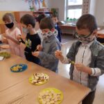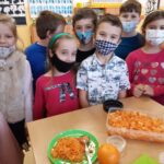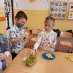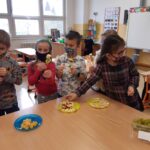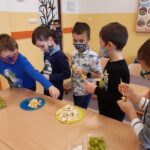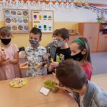 A tak si prvňáčci užívali den od samého rána, kdy se ostatním spolužákům chlubili se svými zdravými svačinkami, které jim maminky na tento den připravily. V průběhu dne se pak seznámili s pyramidou potravin, třídili ovoce, zeleninu, mléčné výrobky i ostatní potraviny, vyzkoušeli si připravit slavnostní tabuli na oslavu svých narozenin, připravili si ovocné špízy a mrkvový salát s ananasem. Celý projektový den si náležitě užili!