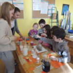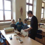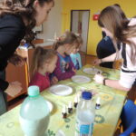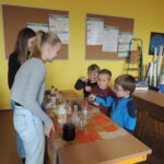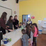 Nejprve jsme rozdělili děti do dvou skupin a předvedli jsme jim pokusy – sloní zubní pastu a nasátí vajíčka natvrdo do skleněné lahve od mléka. Poté se děti rozdělily do čtyř skupinek a sami, pouze za pomoci našich deváťáků, dělali pokusy – určení pH např. mýdla, sody, citronové šťávy atd. Děti měly za úkol přidat indikátor do látky a uhodnout jaká barvička ve zkumavce vznikne.