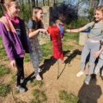 Po této hře jsme byli podle barevných bonbónů rozděleni do týmů. V těch jsme pak plnili různé úkoly (hledali jsme zadané přírodniny, vázali co nejdelší provaz z oblečení apod.). Následně jsme došli až na Strážné, kde paní učitelky rozdělaly oheň, zatímco my jsme měli 20 minut na stavění čarodějnice. Každý tým pak svou čarodějnici představil poutavým popisem ostatním. Pak jsme začali opékat špekáčky. Když jsme dojedli, čarodějnice jsme velmi neradi upálili. Pak si každý napsal na papírek své starosti, problémy, špatné vlastnosti a tento papírek jsme také nechali shořet, abychom se těchto těžkostí zbavili. Tuto akci jsme zakončili hrou na schovávanou.
