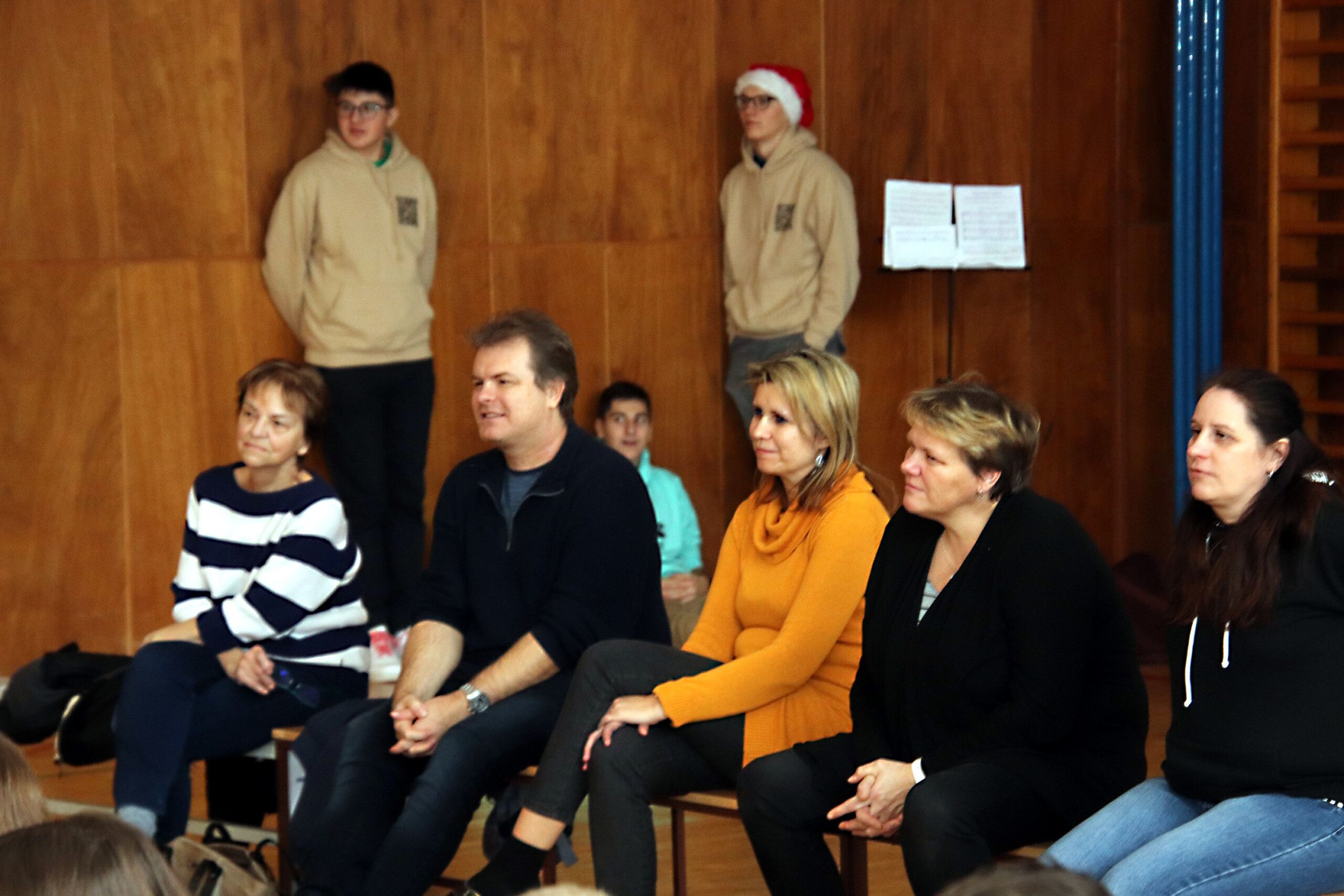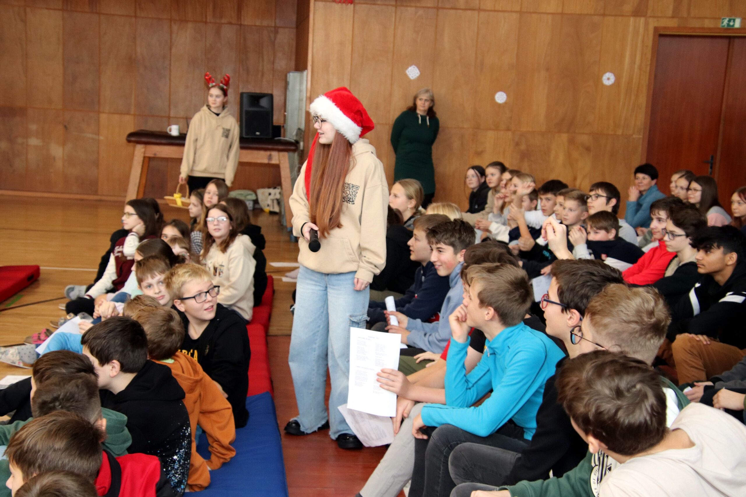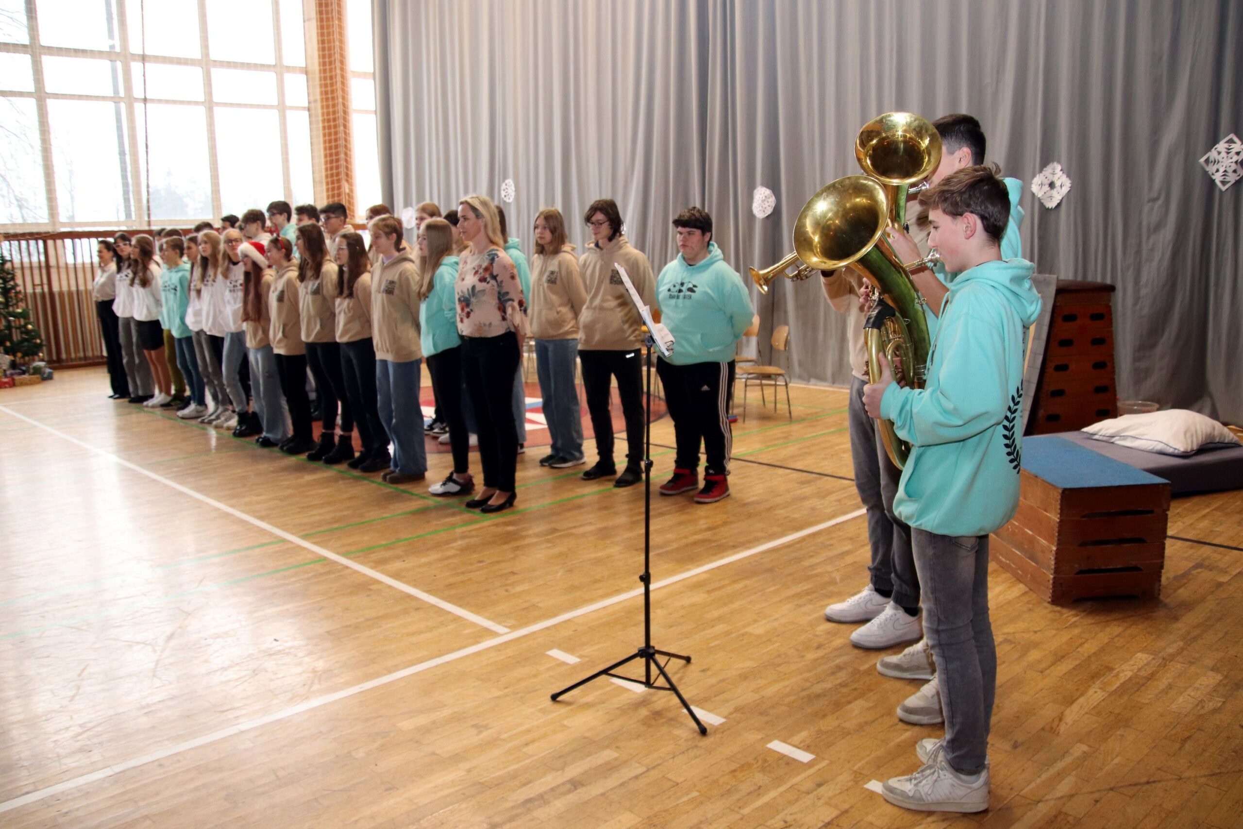 Na úvod zazněla známá vánoční písnička, a protože např. starší žáci měli k dispozici texty všech písniček, které měli účinkující připravené, mohli se se svým zpěvem přidat taky. A opravdu zpívali, takže celou přístavbou se nesl docela silný zpěv. Koledy dokonce doprovodili tři hráči na dechové nástroje. Šlo jim to moc hezky.