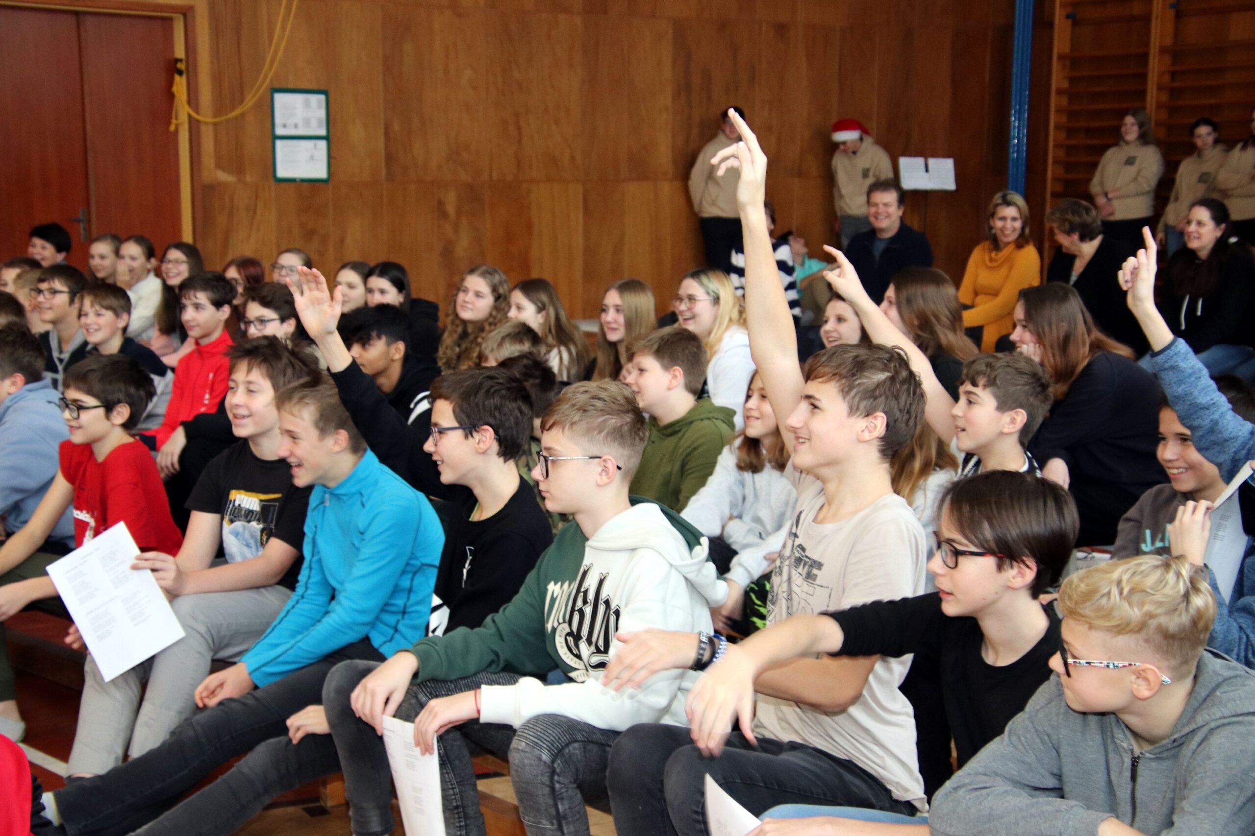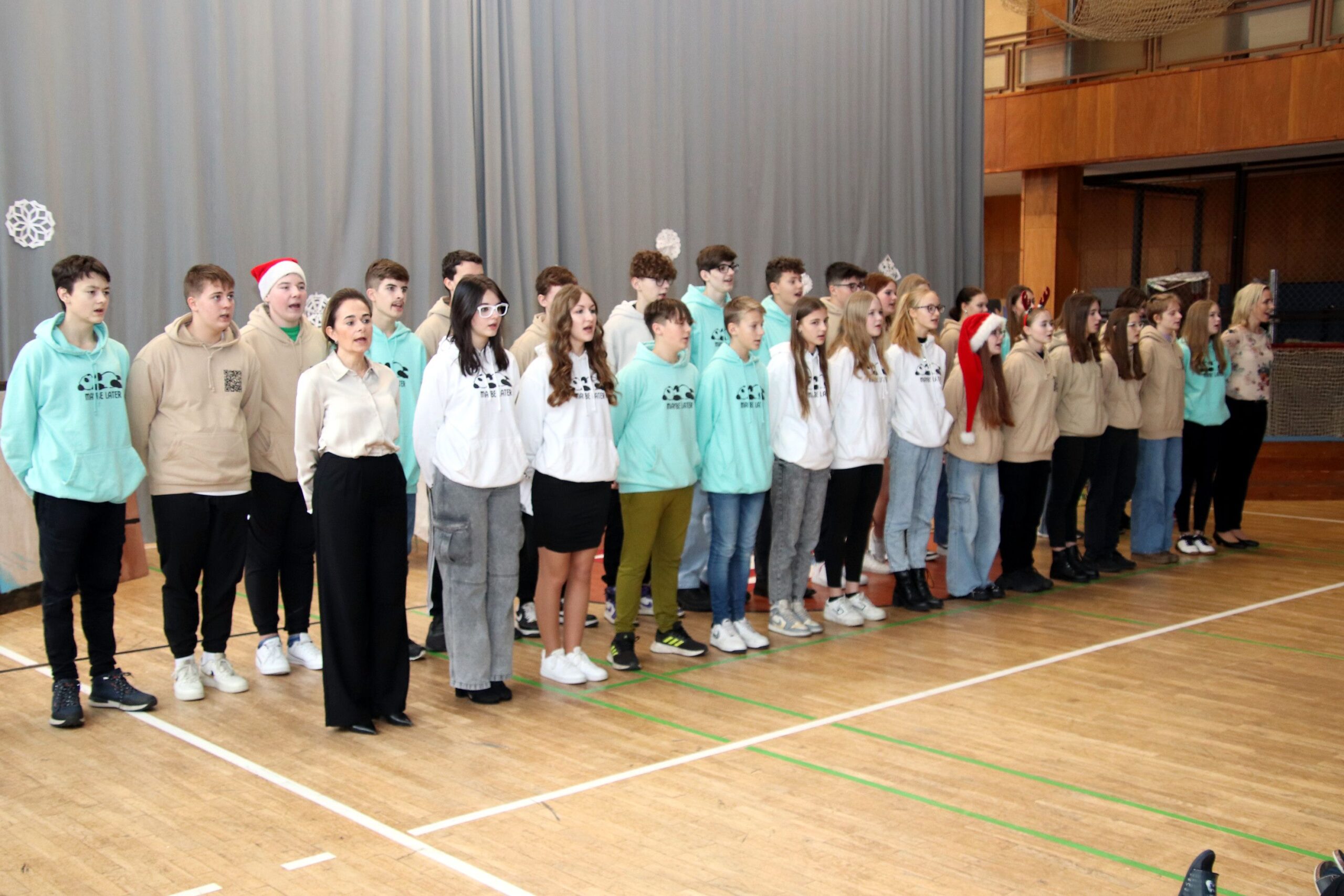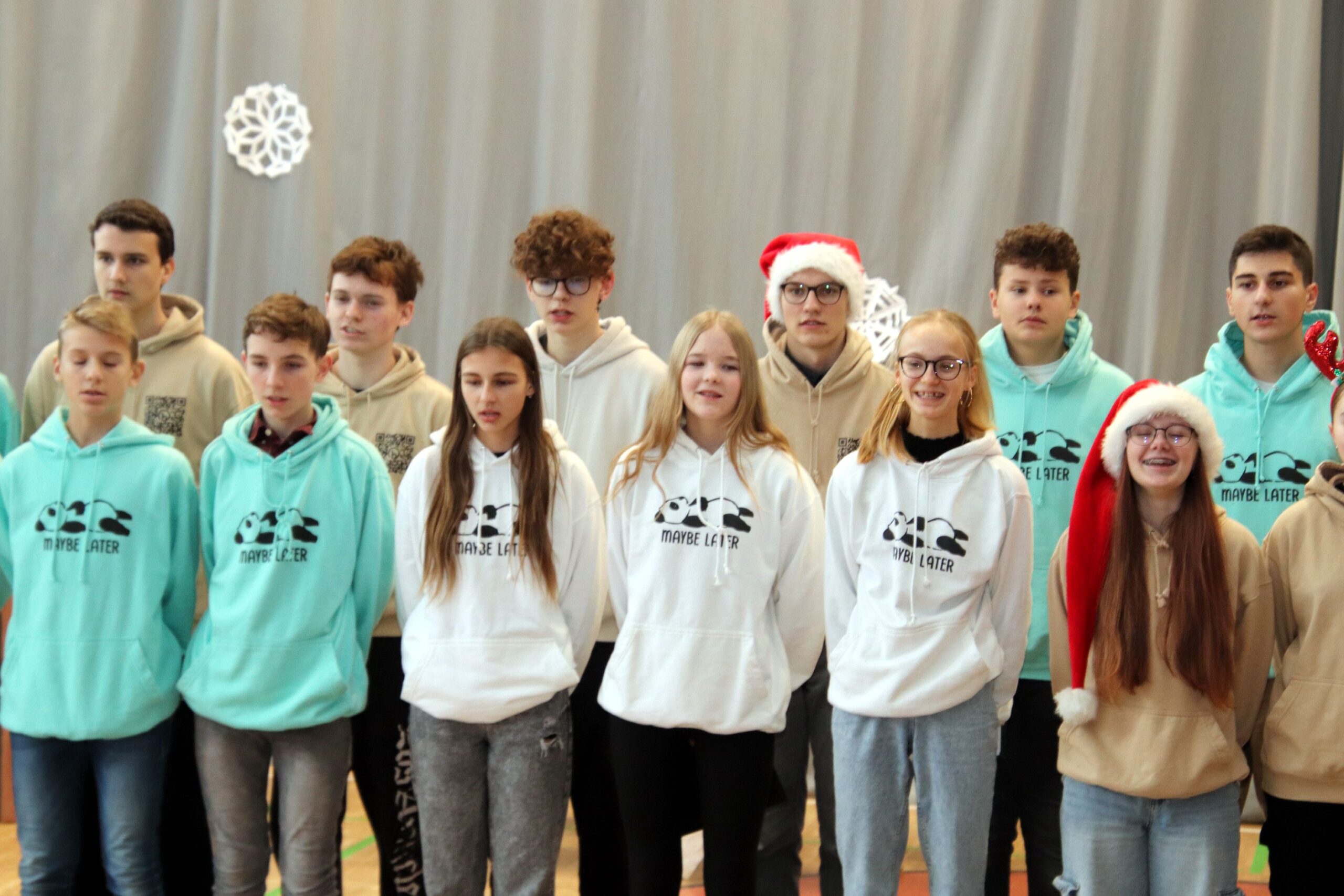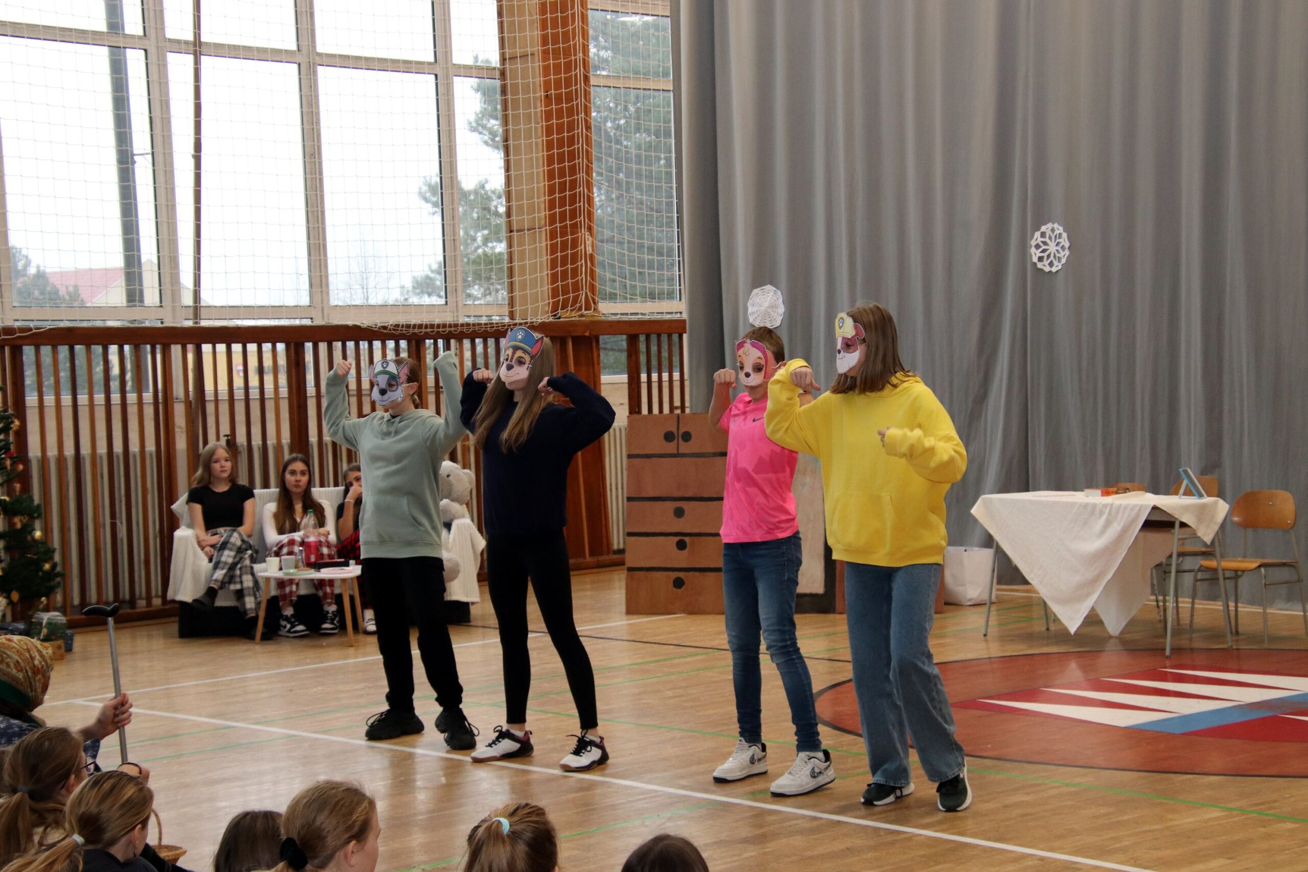 Na úvod zazněla známá vánoční písnička, a protože např. starší žáci měli k dispozici texty všech písniček, které měli účinkující připravené, mohli se se svým zpěvem přidat taky. A opravdu zpívali, takže celou přístavbou se nesl docela silný zpěv. Koledy dokonce doprovodili tři hráči na dechové nástroje. Šlo jim to moc hezky.
