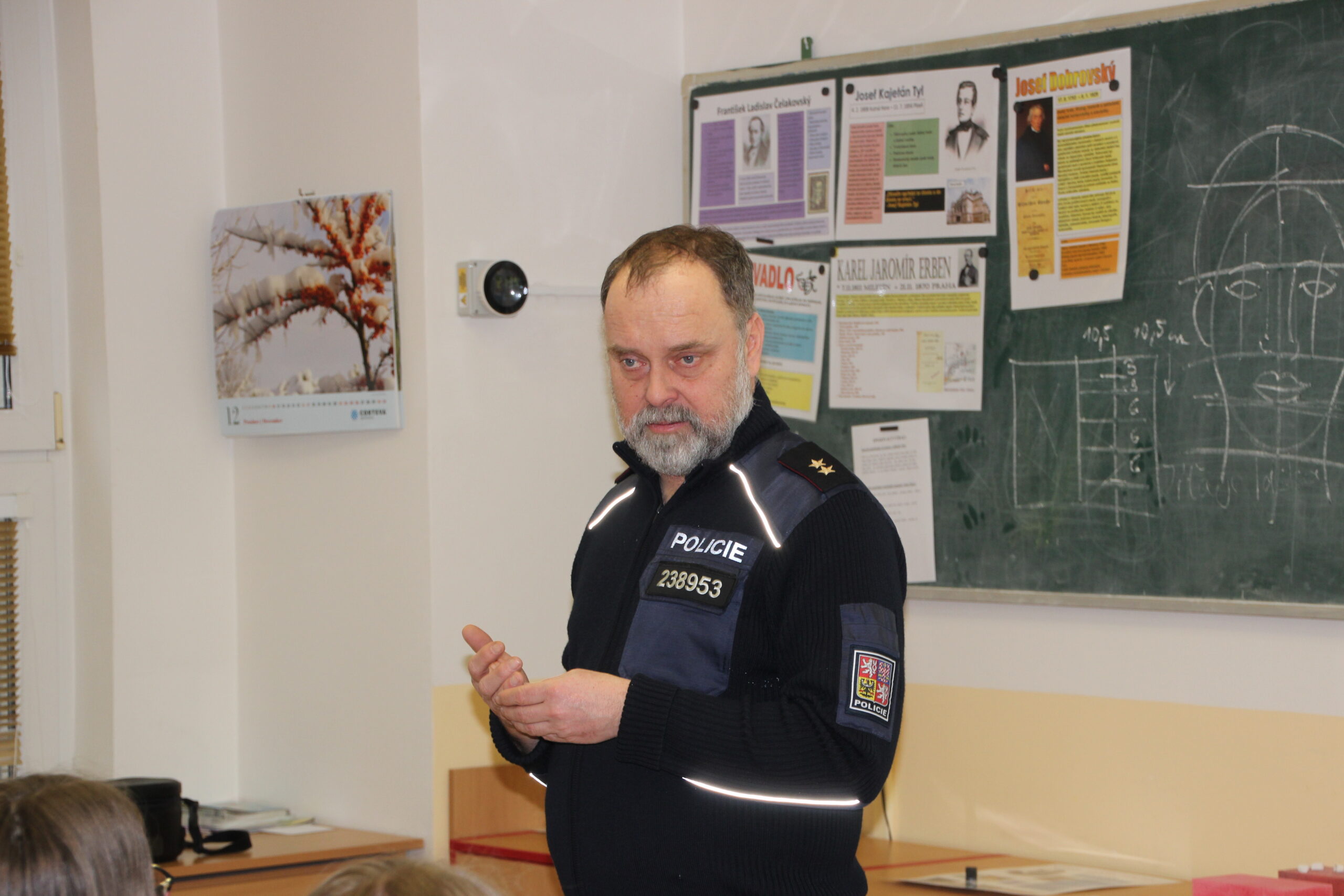 Por., Bc.Vladislav Malcharczyk žákům druhého ročníku vysvětloval, jak poznají příslušníka Policie ČR, jaký je rozdíl mezi pořádkovým, dopravním policistou a kriminalistou, a ukázal jim jejich výstroj. Dále se soustředil na pravidla bezpečného chování, např. chování v silničním provozu a setkání s cizí osobou. Žáci si společně s ním připomněli linky tísňového volání a jak na ně správně zavolat.