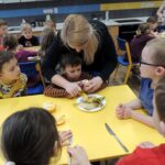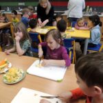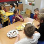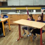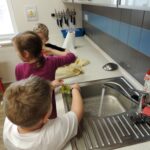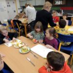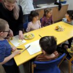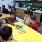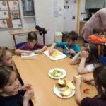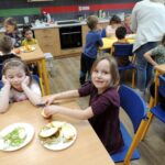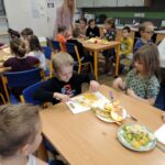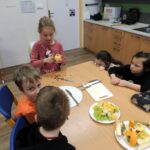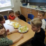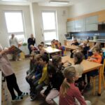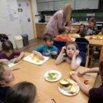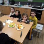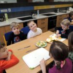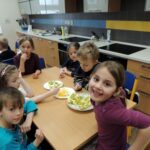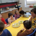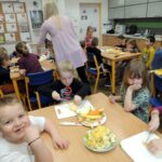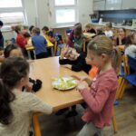 Část úterního dopoledne 19. března 2024 strávily děti z mateřské školky ve školní kuchyňce, aby si vyzkoušely svou šikovnost při přípravě ovocných špízů. Než se ale dostaly k samotné přípravě, seznámily se s prostředím kuchyňky, dozvěděly se, co jsou to recepty a kde je mohou najít, prohlédli si knihu – kuchařku. A pak už nastala praktická část programu. Donesené ovoce (banány, hroznové víno, jablka, pomeranč, kiwi) děti umyly, oloupaly a nakrájely na malé kousky. Ty pak napichovaly na špejle a hotový špíz položily na talíř. Paní asistentka mezitím rozpustila čokoládu a tou hotové ovocné špízy polévala. Děti se s nadšením pustily do ochutnávání. A jejich nadšení bylo znát nejen na obličejích, ale i na oblečení – všude čokoláda! Odcházely spokojené a s novými dojmy a zážitky.
