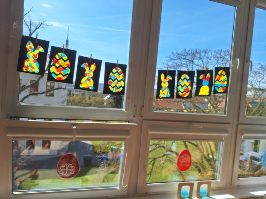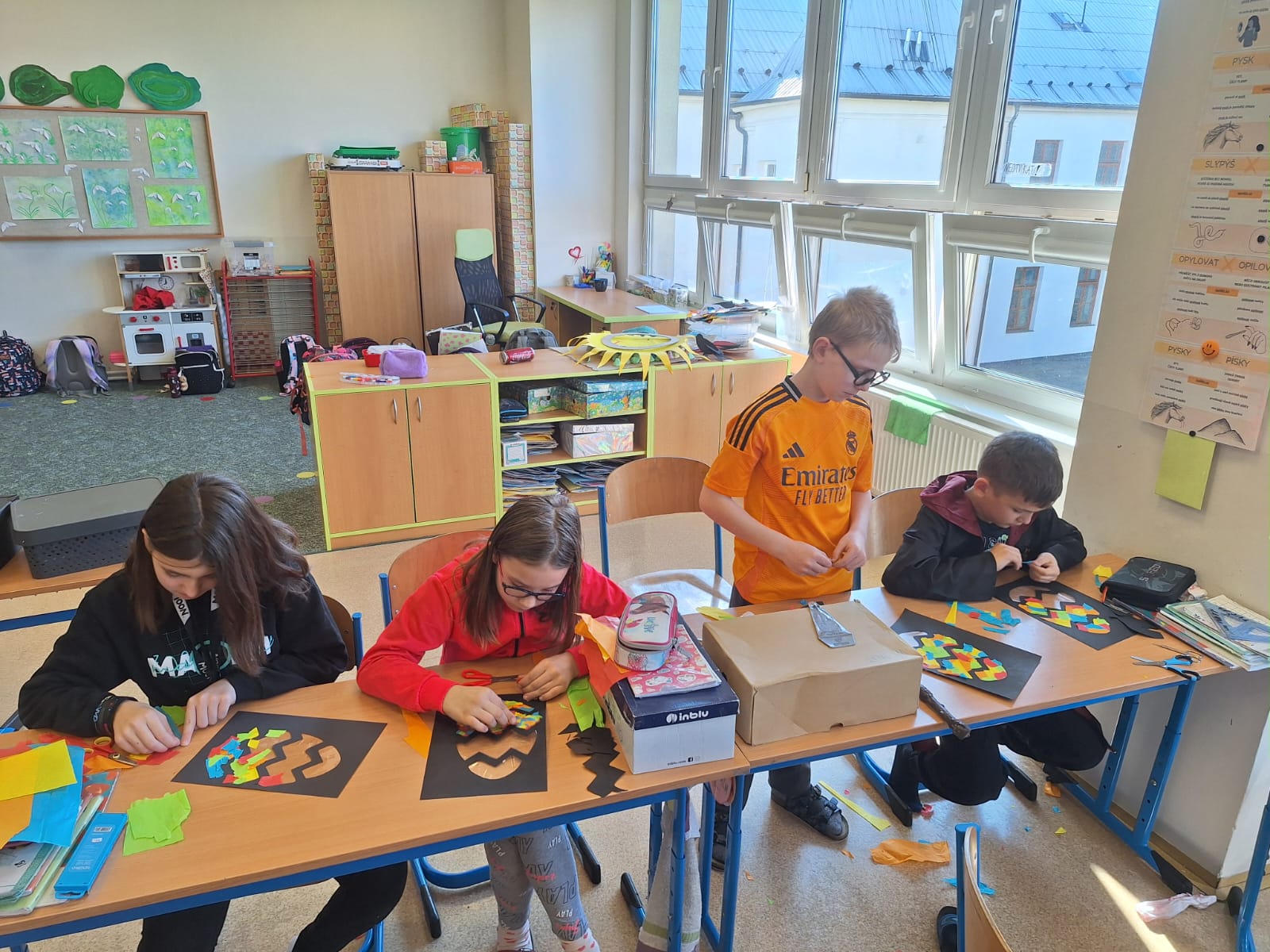 Výtvarná výchova se nesla ve znamení vitráží. Ukazovali jsme si příklady vitrážového umění a nakonec jsme se sami pustili do tvoření. Pomocí barevných průhledných papírů děti vytvořily krásnou velikonoční výzdobu, která nám rozzářila třídu.