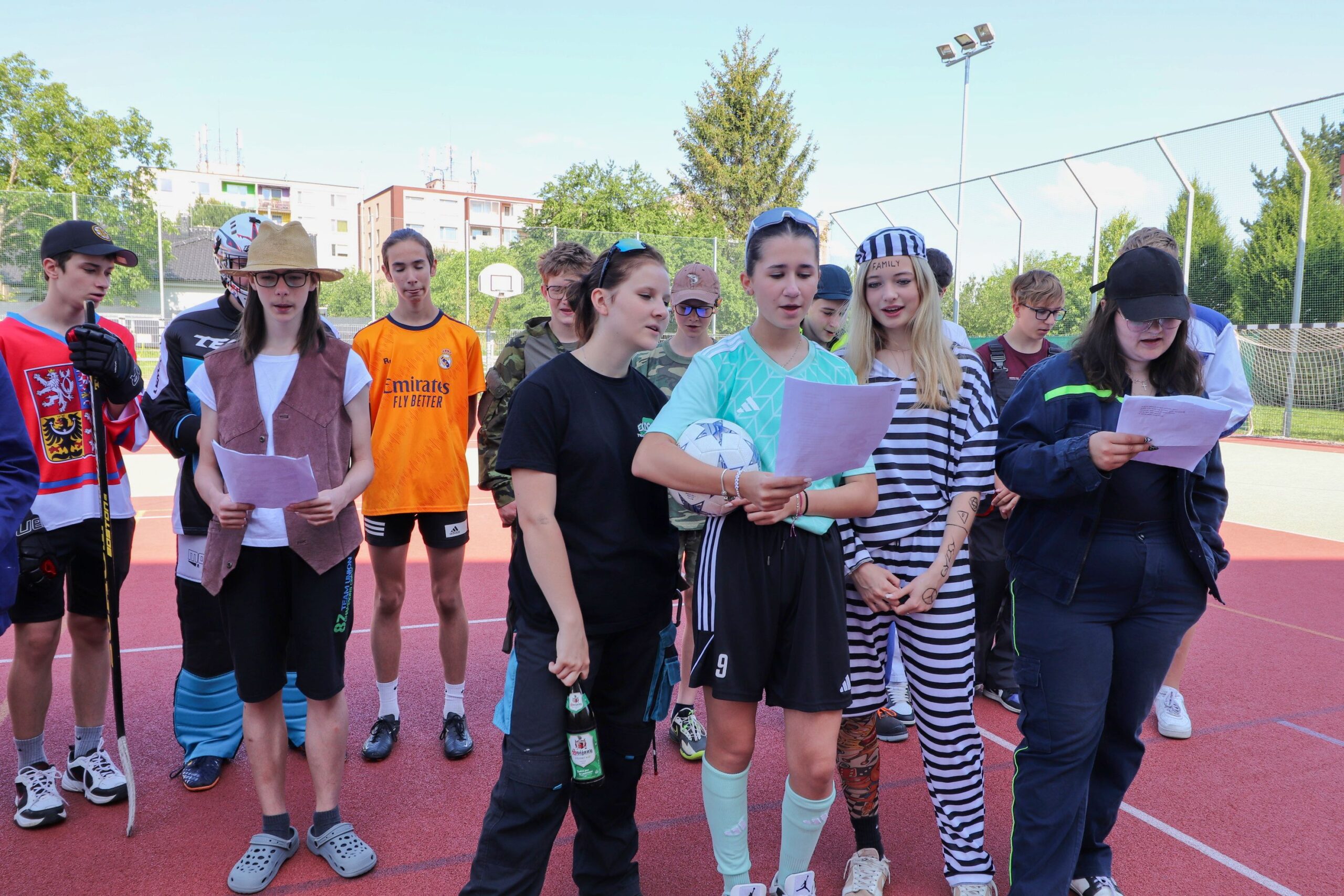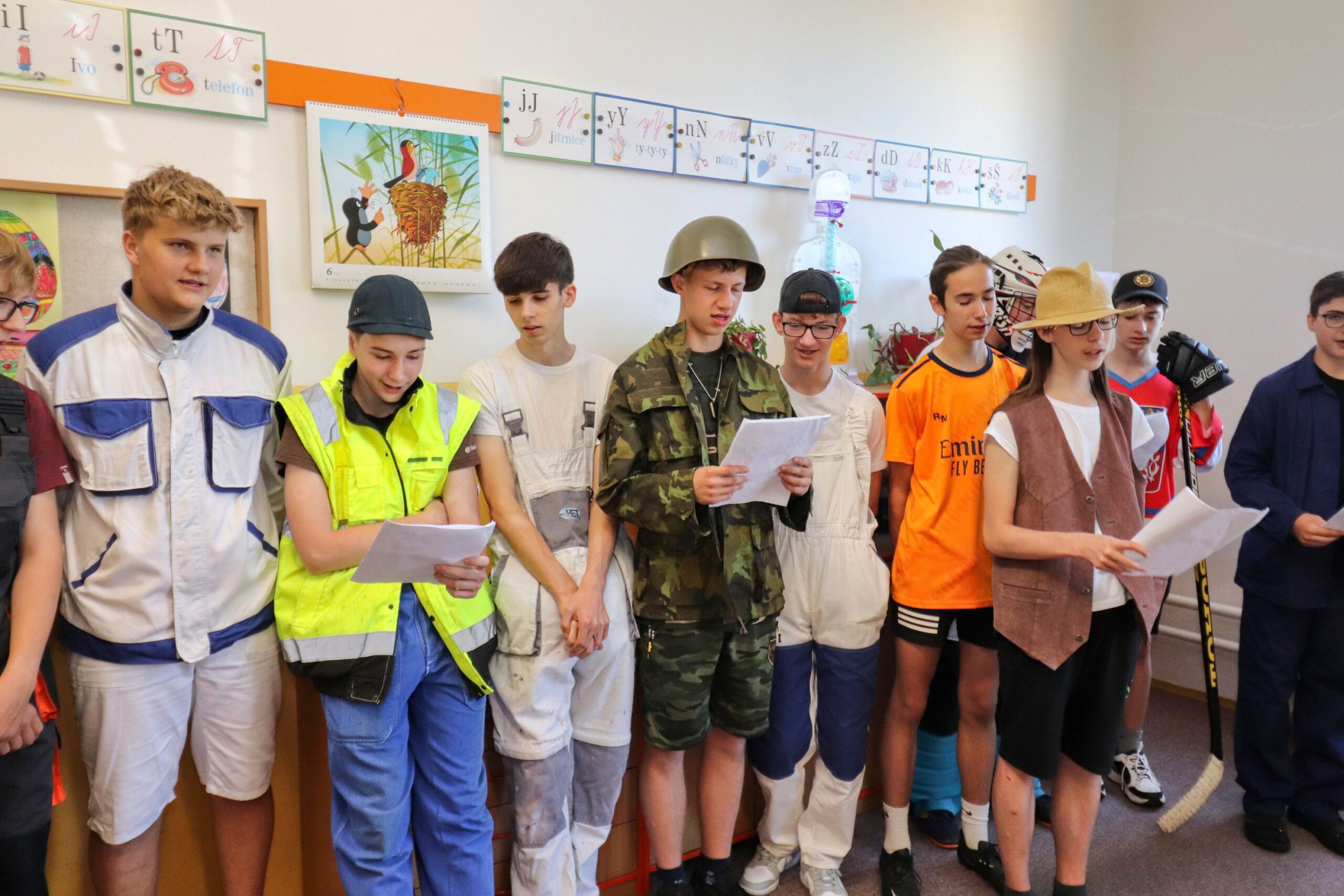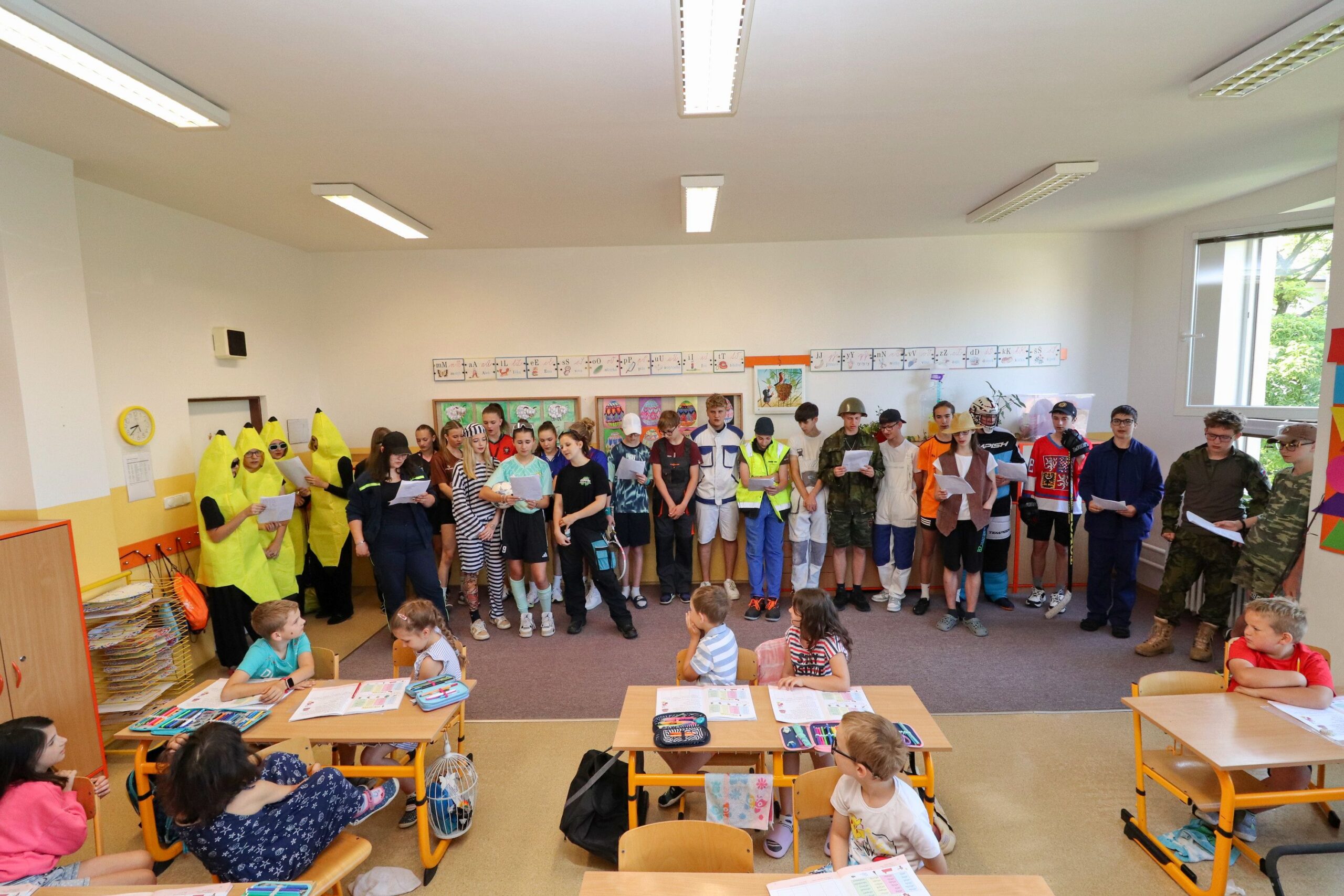 24. 6. 2025 Pavel Čučka Poslední zvonění Deváťáci se poctivě připravovali, „zpěv páteční“ s texty o učitelích pak předvedli opravdu v každé třídě, navštívili i Městský úřad v Kelči.