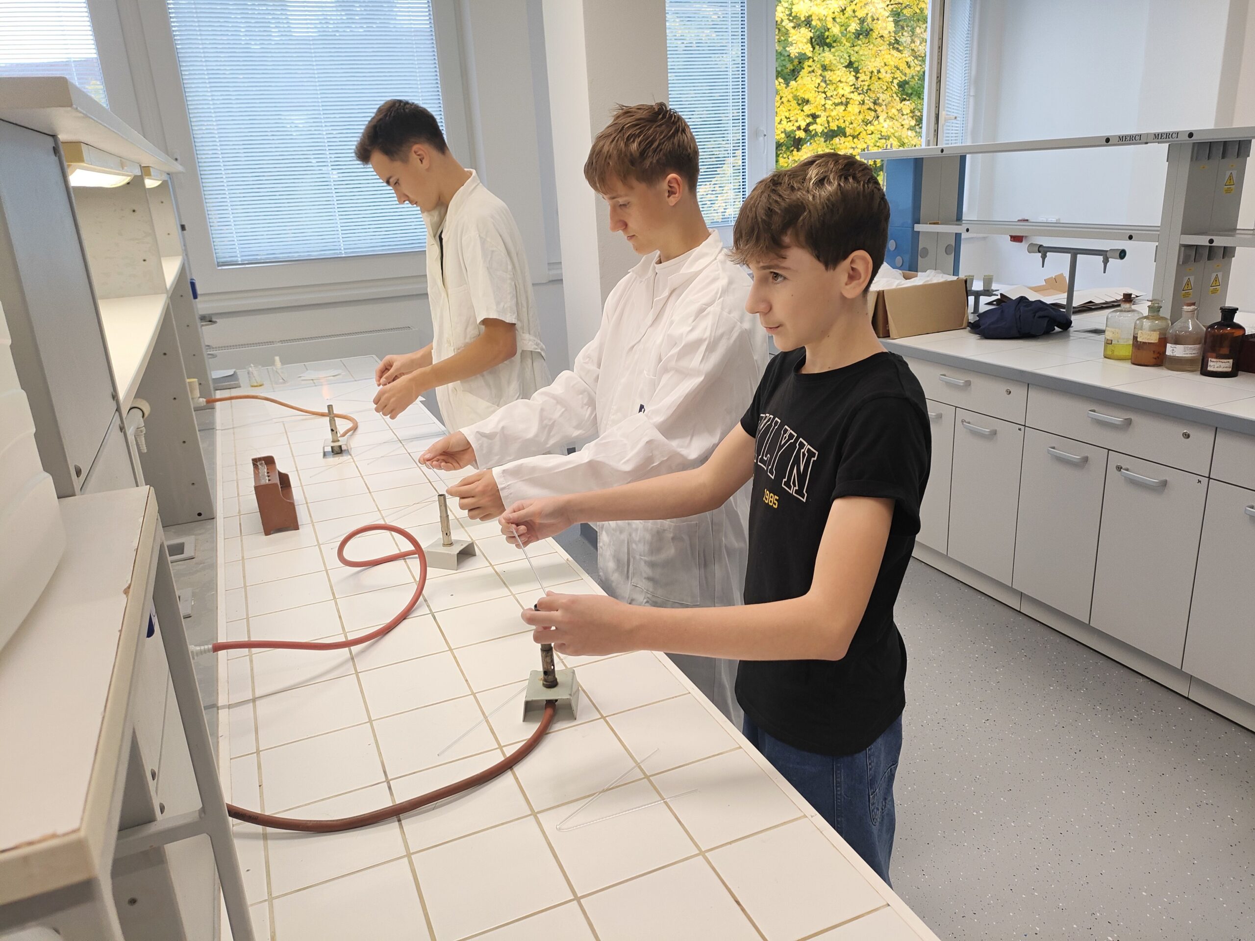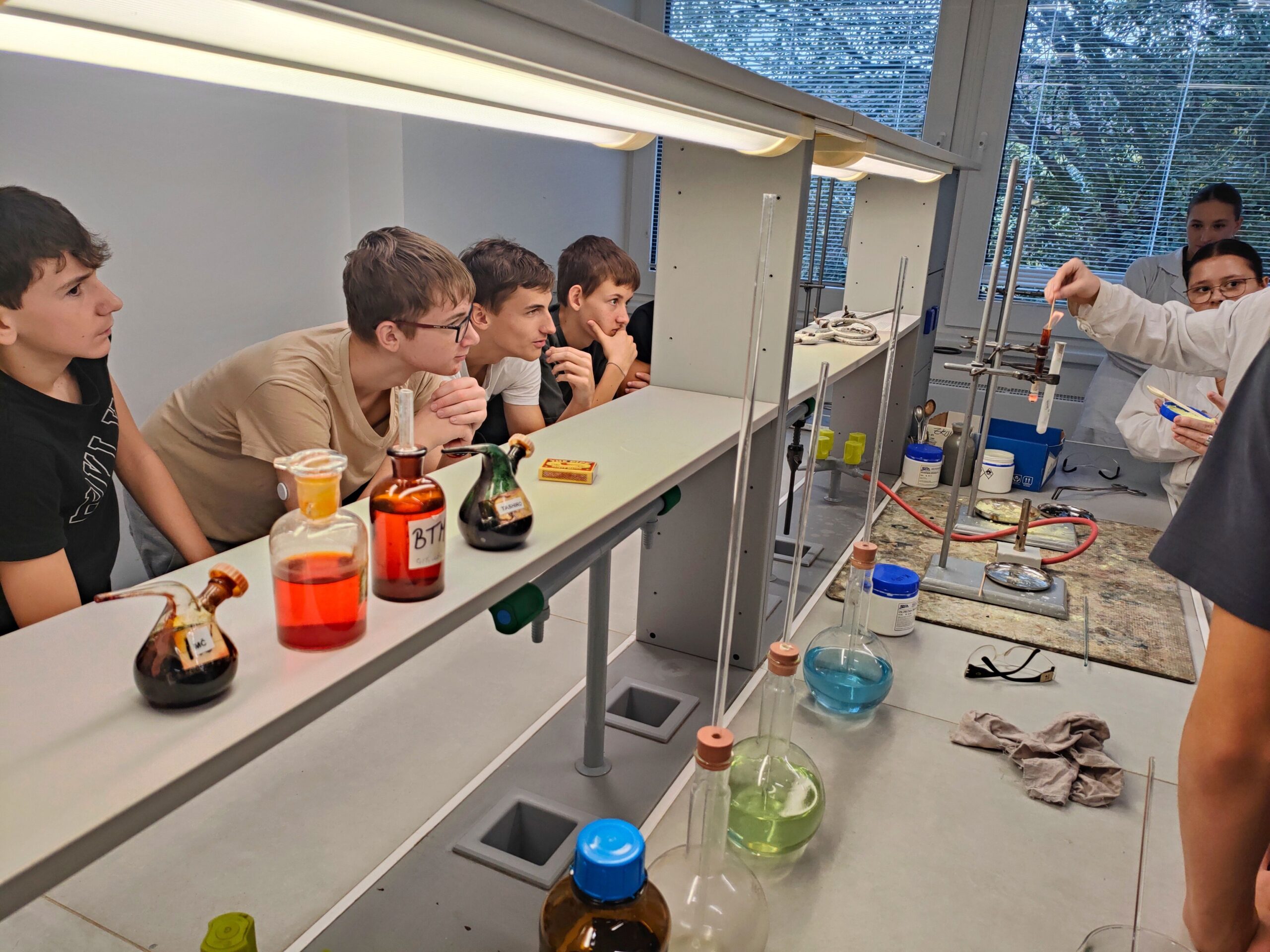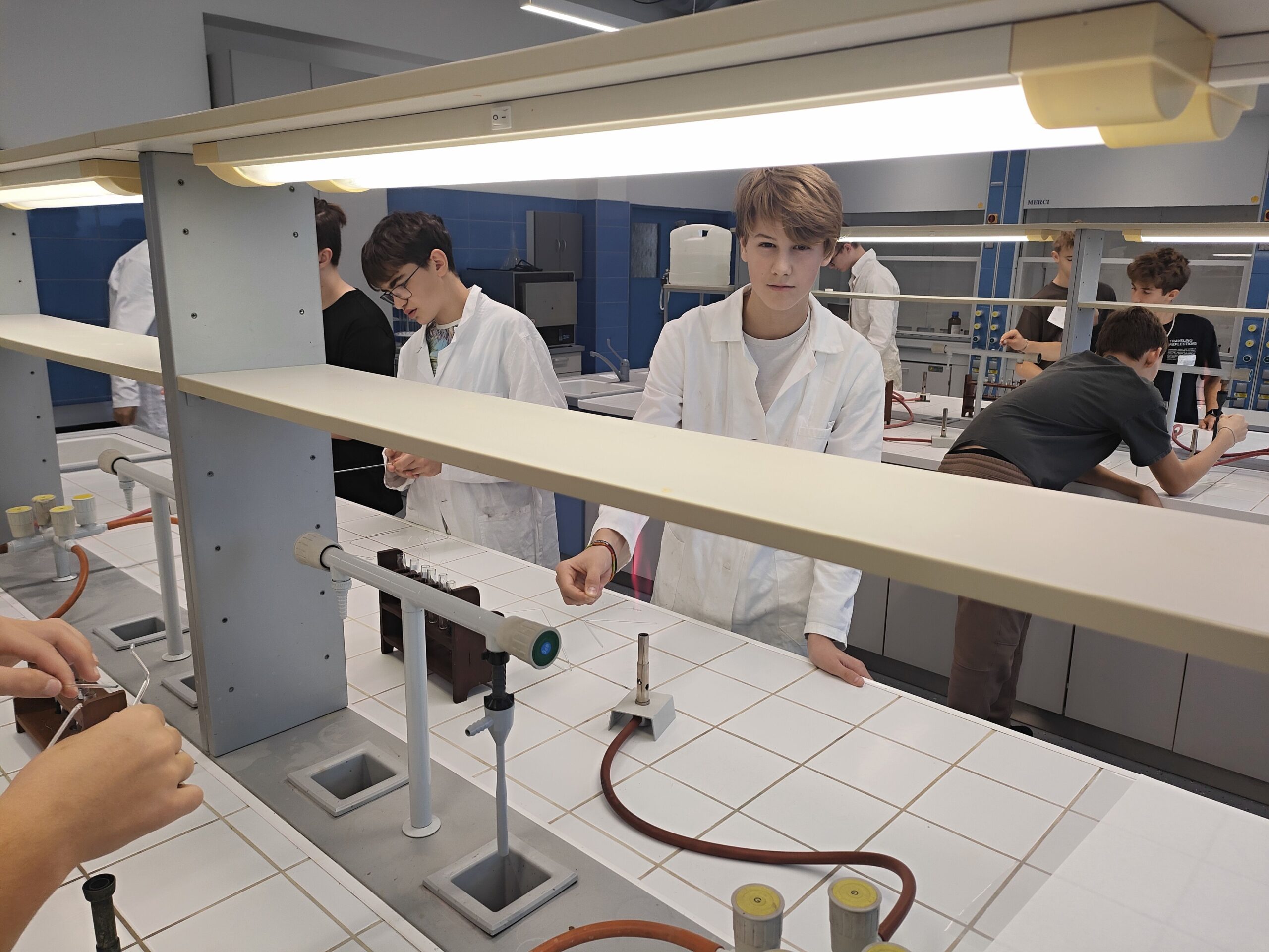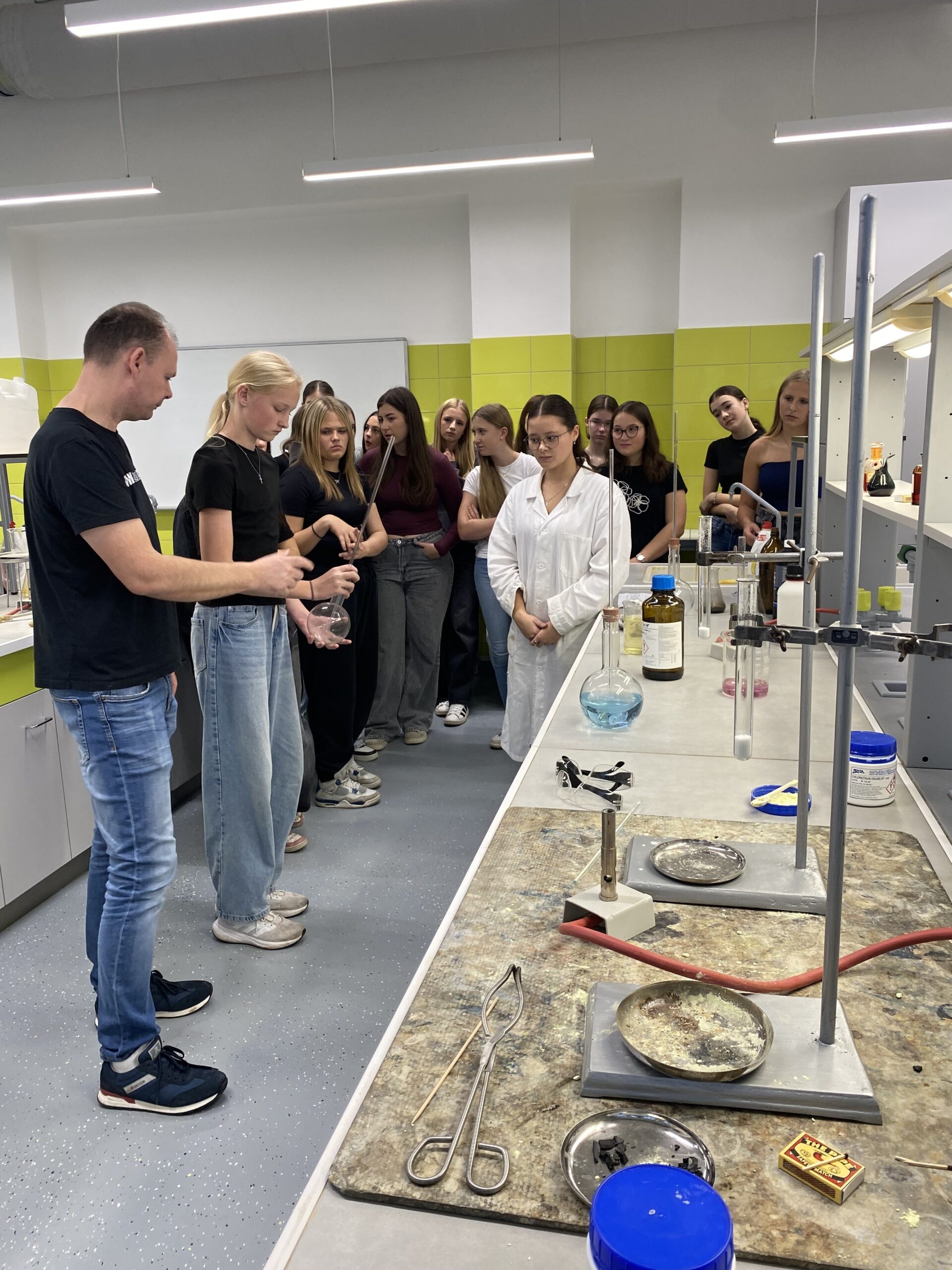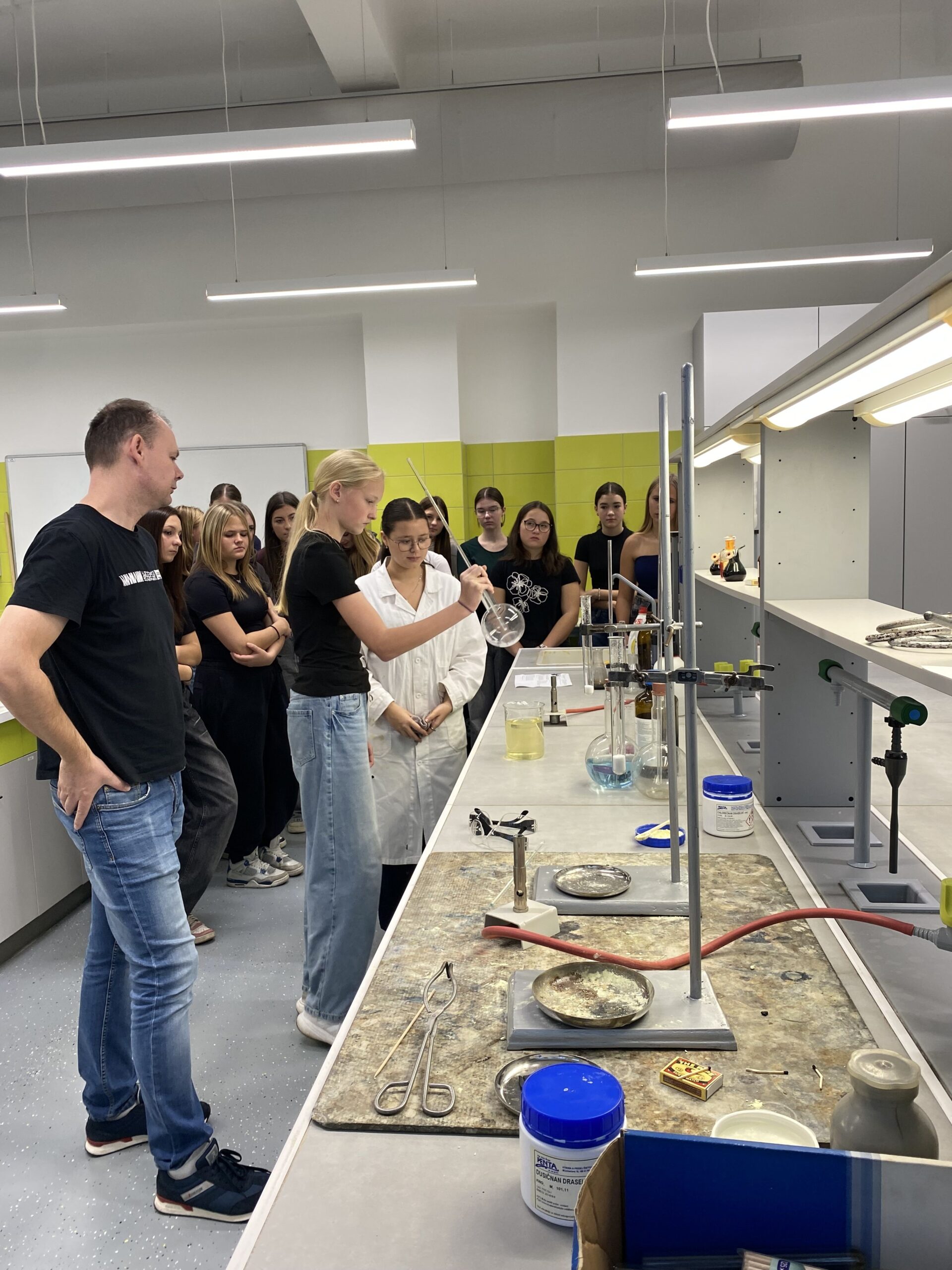 Dne 10.10.2025 se žáci 9. ročníku zapojili na SPŠ v Hranicích do projektového dne věnovaného chemii. Pracovali ve dvou skupinách a postupně navštívili a pracovali ve dvou laboratořích. V jedné laboratoři mohli shlédnout spoustu efektních pokusů, které jim předvedli studenti SPŠ oboru Aplikovaná chemie. Mezi tyto pokusy patřily např. Peklo ve zkumavce, čpavkový vodotrysk, zlatý déšť, sloní zubní pasta a další. Ve druhé laboratoři si mohli naši žáci sami vyzkoušet ohýbání skleněných tyčinek, barvení plamene kationty alkalických kovů a kovů alkalických zemin a psaní tajným inkoustem.