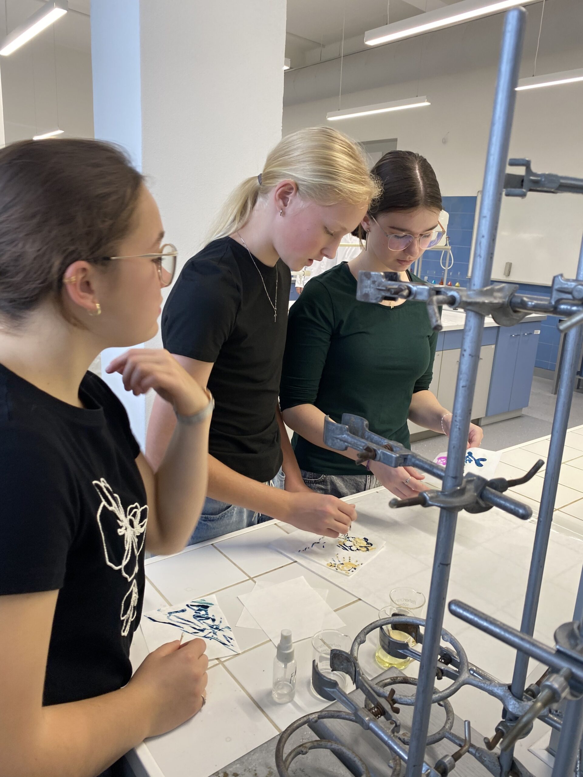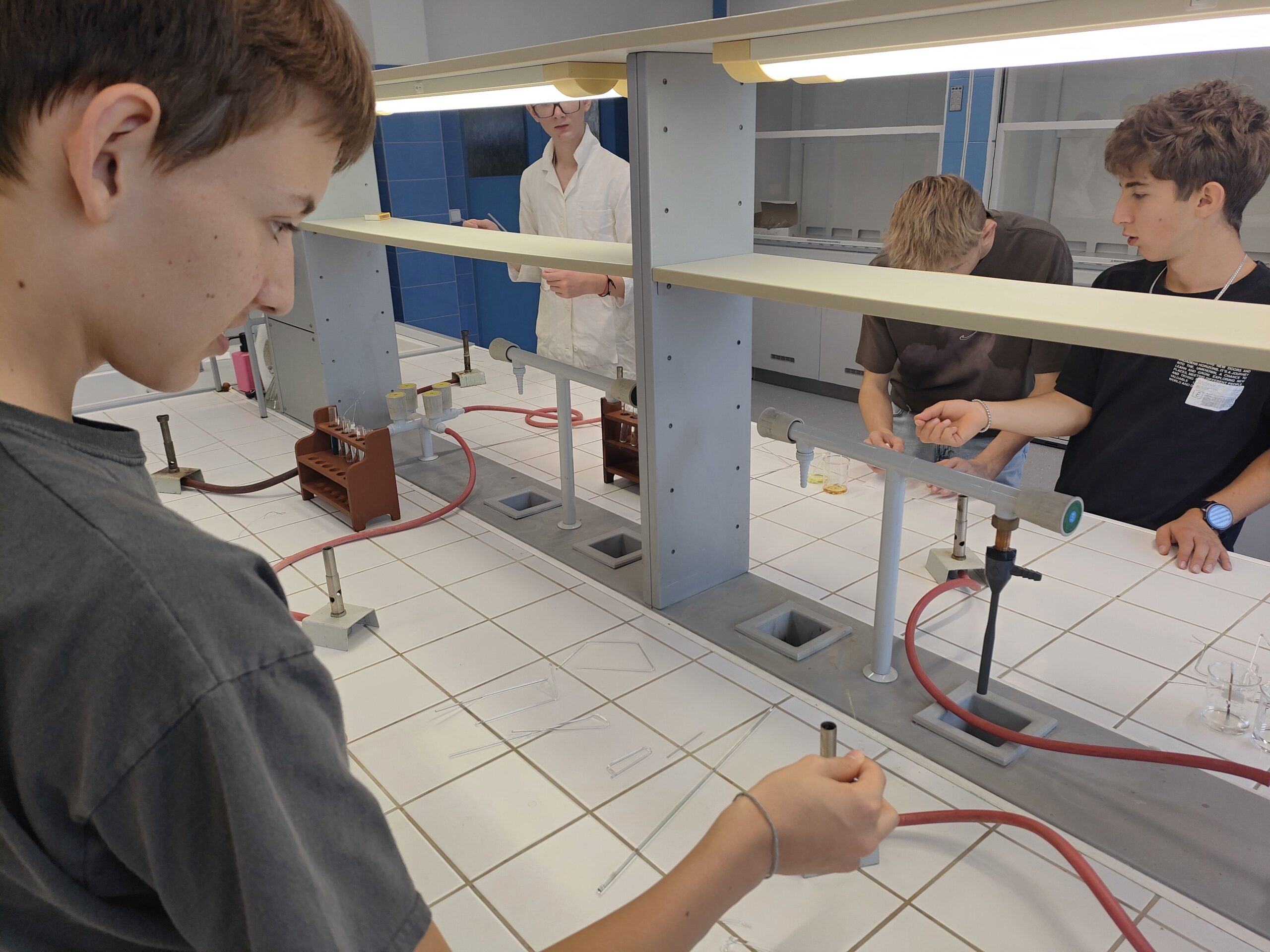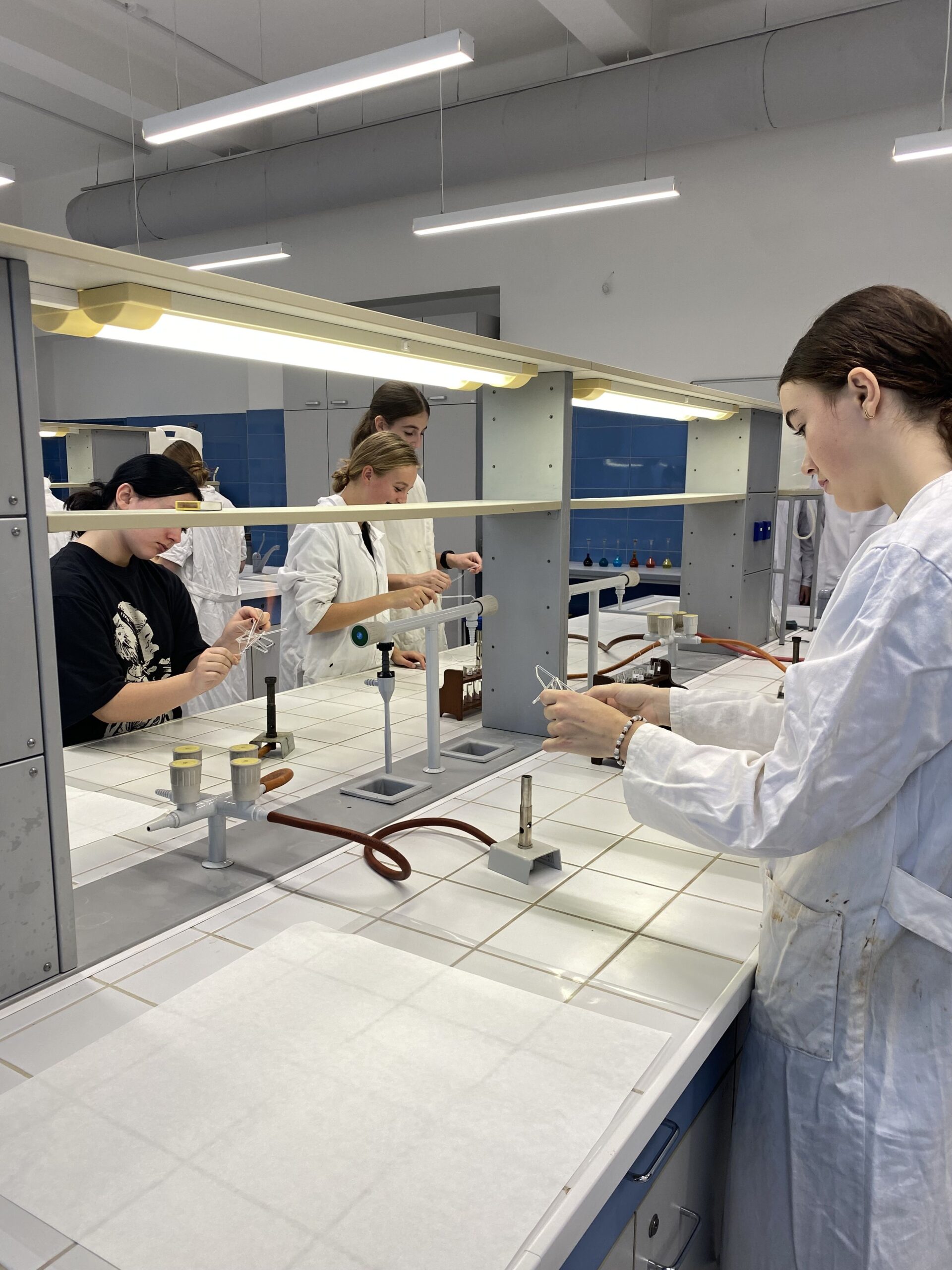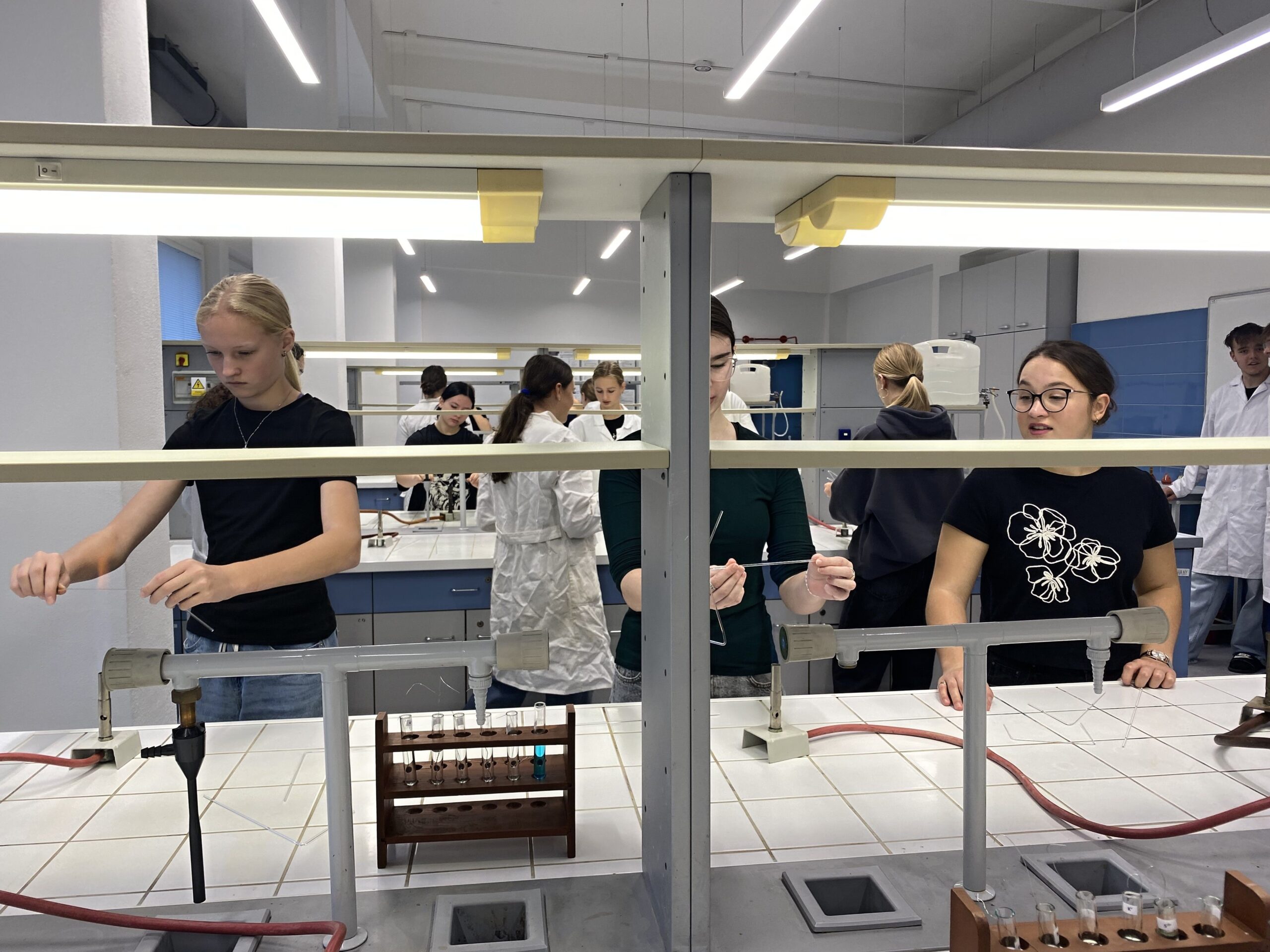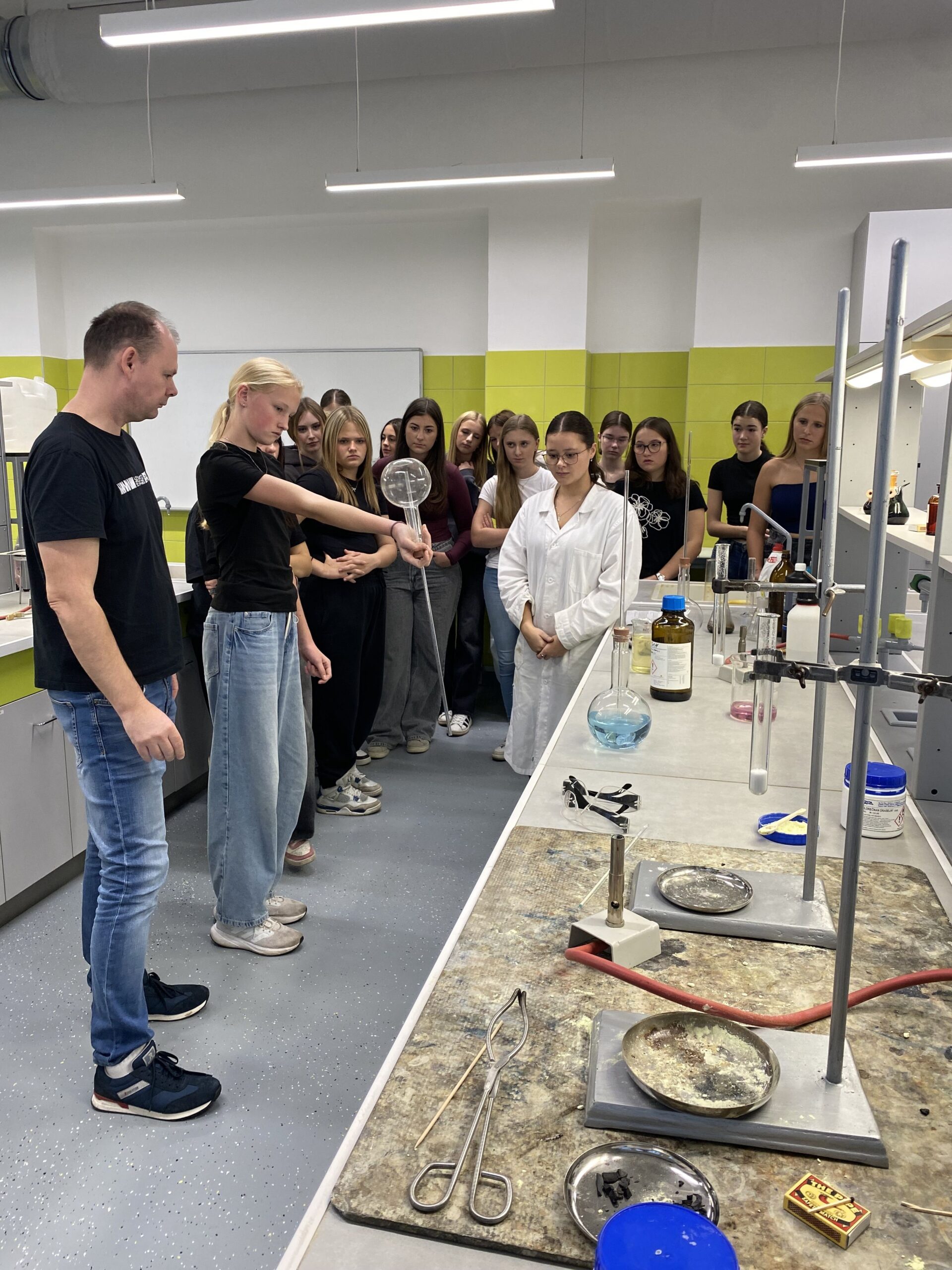 Dne 10.10.2025 se žáci 9. ročníku zapojili na SPŠ v Hranicích do projektového dne věnovaného chemii. Pracovali ve dvou skupinách a postupně navštívili a pracovali ve dvou laboratořích. V jedné laboratoři mohli shlédnout spoustu efektních pokusů, které jim předvedli studenti SPŠ oboru Aplikovaná chemie. Mezi tyto pokusy patřily např. Peklo ve zkumavce, čpavkový vodotrysk, zlatý déšť, sloní zubní pasta a další. Ve druhé laboratoři si mohli naši žáci sami vyzkoušet ohýbání skleněných tyčinek, barvení plamene kationty alkalických kovů a kovů alkalických zemin a psaní tajným inkoustem.