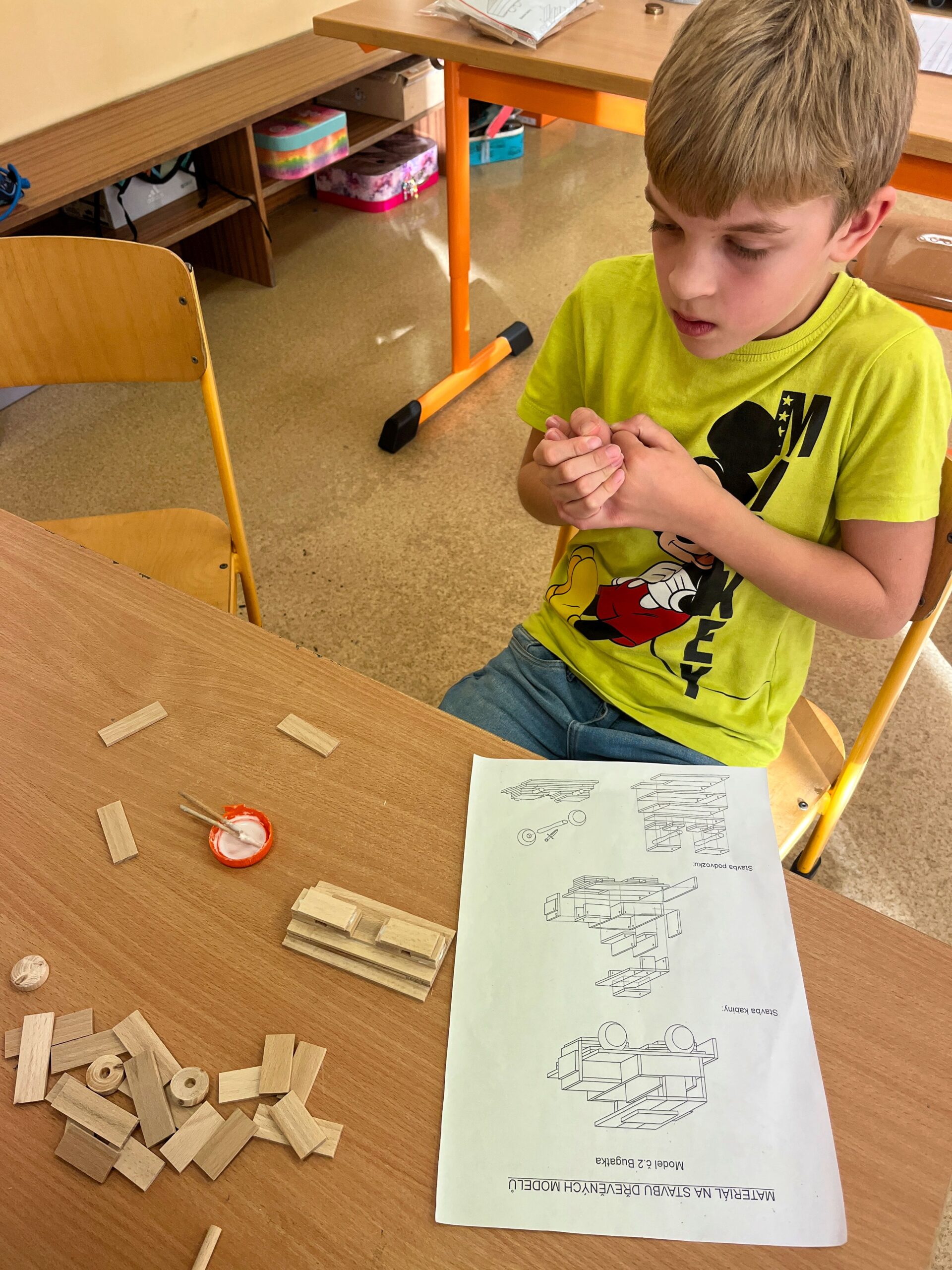 Žákům školní družiny přijel ve středu 5. listopadu 2025 představit a ukázat práci se dřevem a dřevěnými modely truhlář a modelář Samuel Fojtů ze Zubří. Ten pravidelně jezdí do škol učit děti pracovat s návodem a jak podle něj sestavit či slepit určitý výrobek. Žáci si nejprve napočítali potřebný počet určitých dílků a podle plánku je postupně slepovali lepidlem.