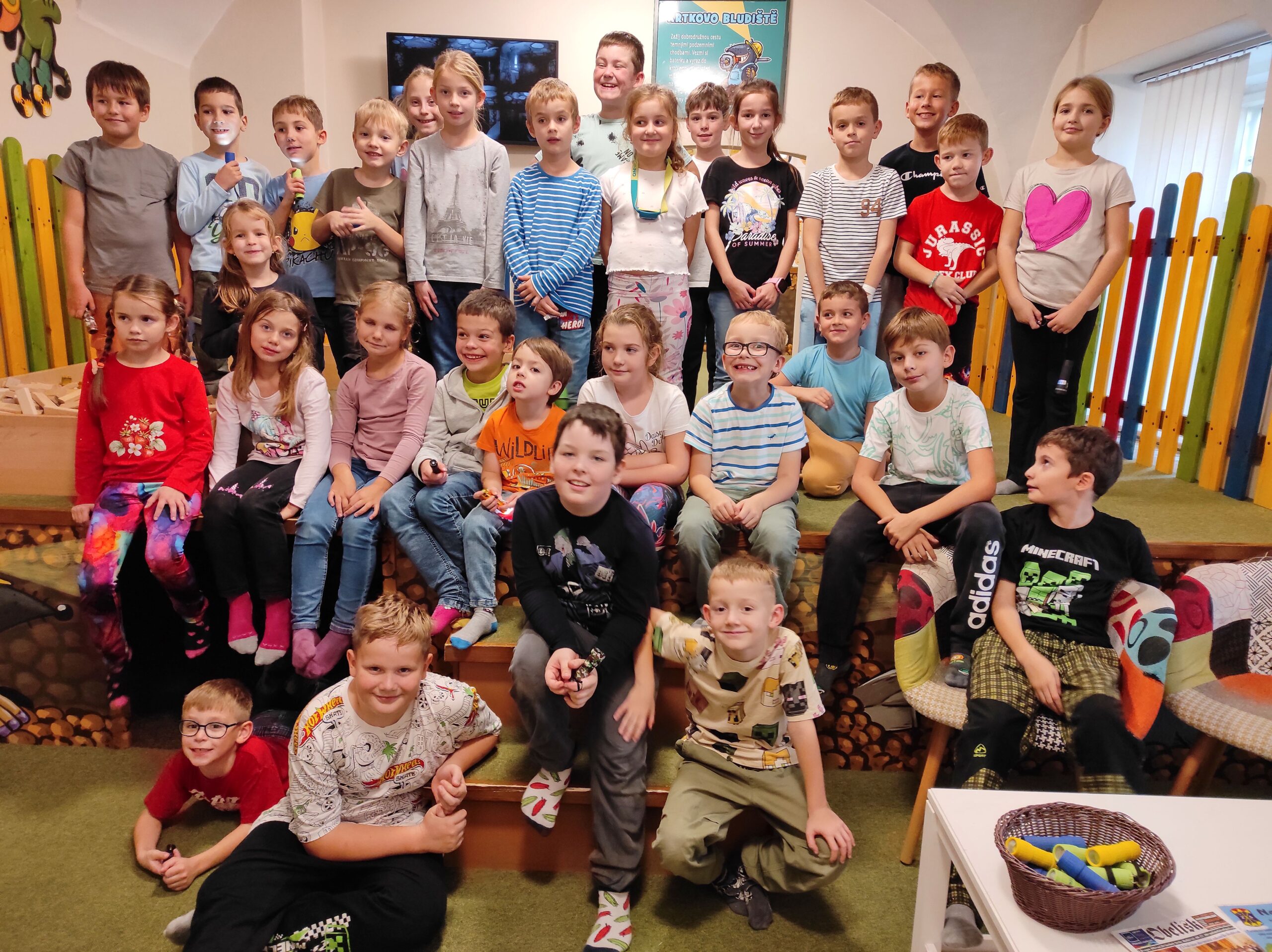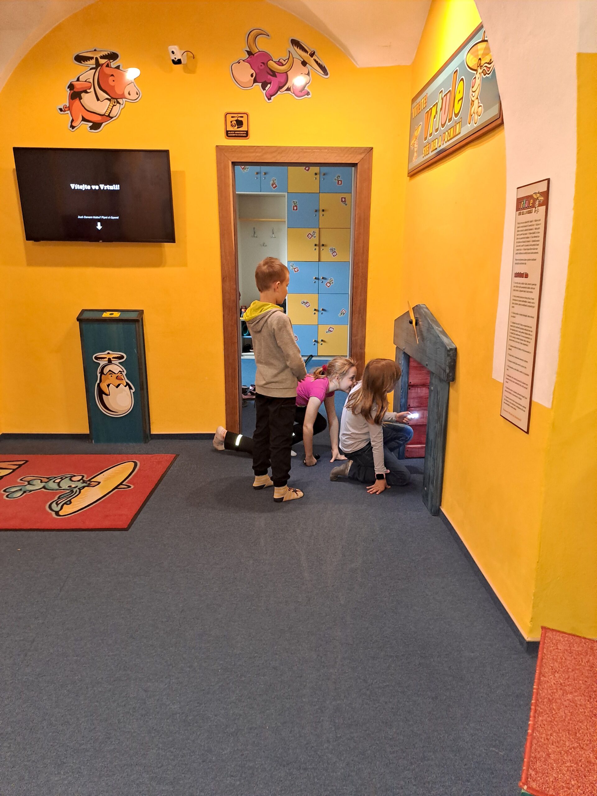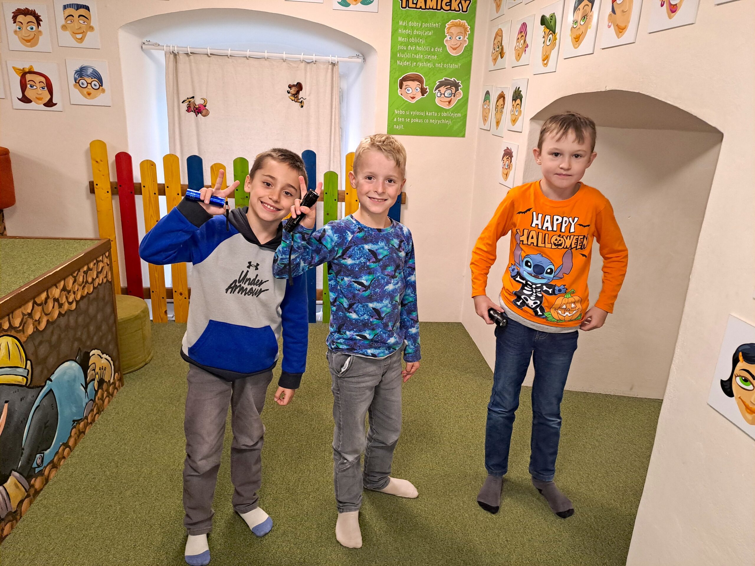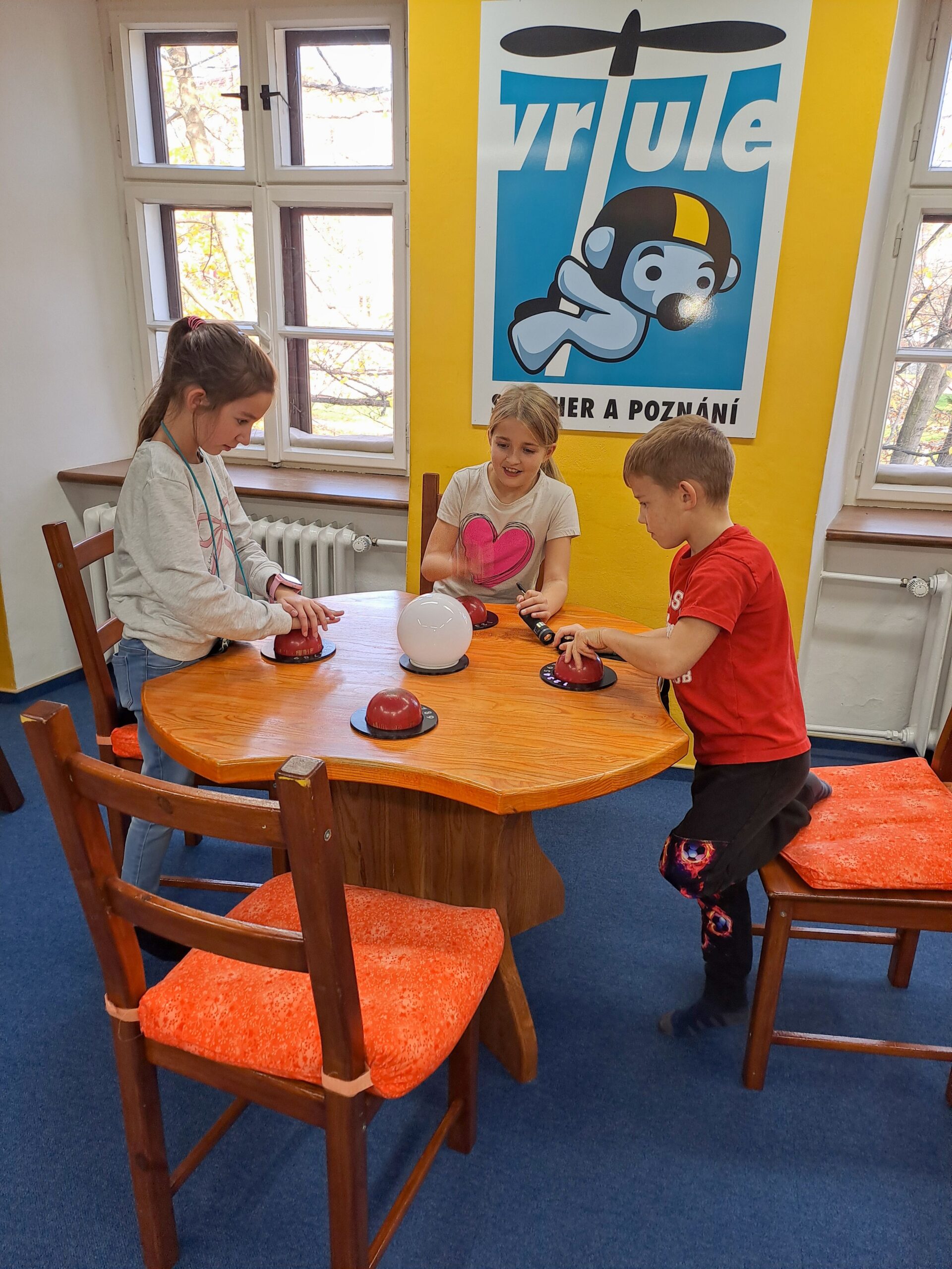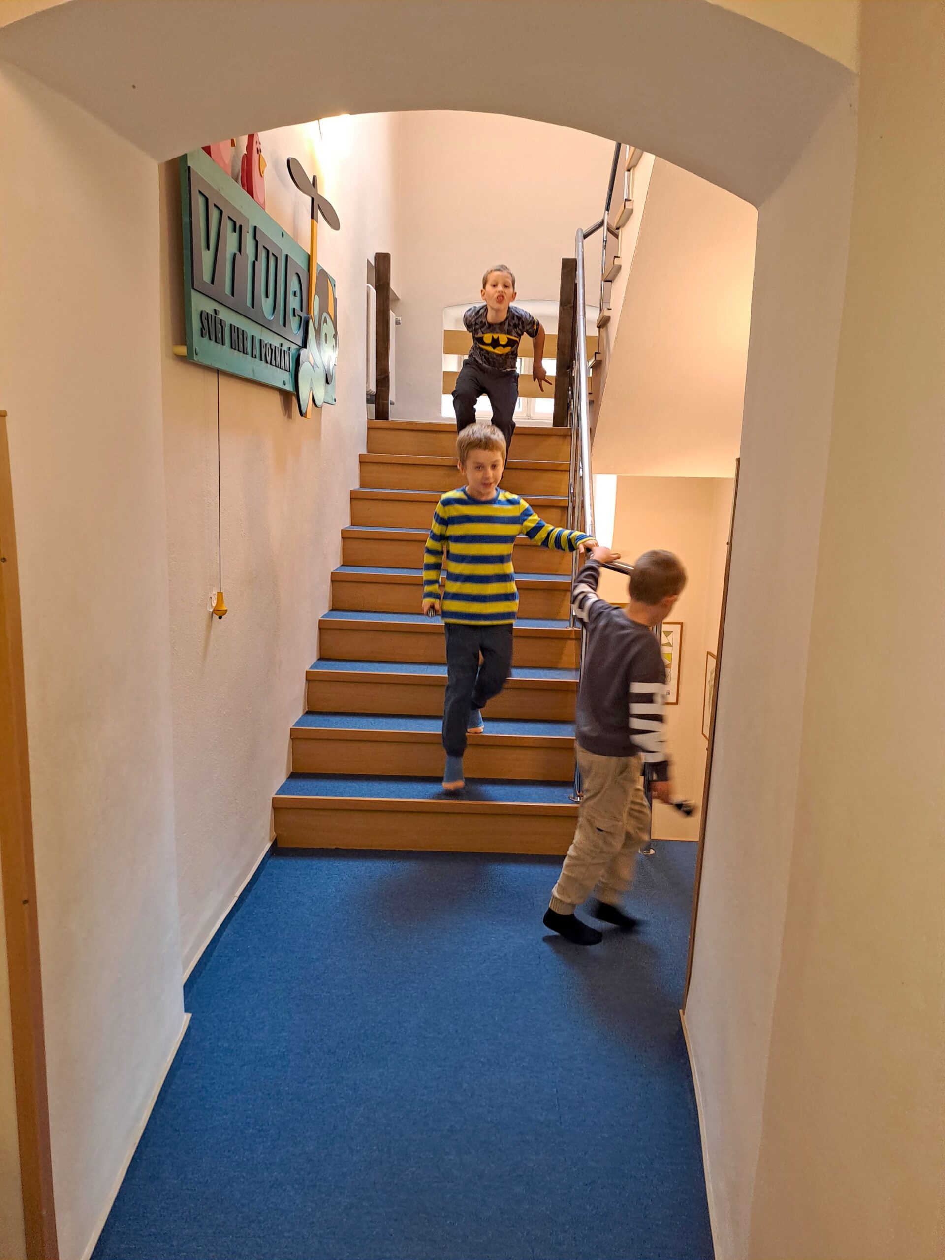 Po příjezdu do Vrtule se děti rozběhly po dvoupatrové budově, kde v každém patře měly k dispozici spoustu různých schovávaček, logických a zábavných her a také za pomoci baterky mohly prolézt tmavým komínem a krtkovým bludištěm. Možností bylo spoustu a proto nevěděly, co vyzkoušet jako první. Přebíhaly z jednoho patra do druhého a nechtěly žádnou hru vynechat. Všechno je zajímalo a vše si chtěly vyzkoušet. Zábavné odpoledne jsme zakončili společnou fotkou, drobným dárečkem a sladkostí. Děti si odpoledne ve Světě her a poznání moc užily.