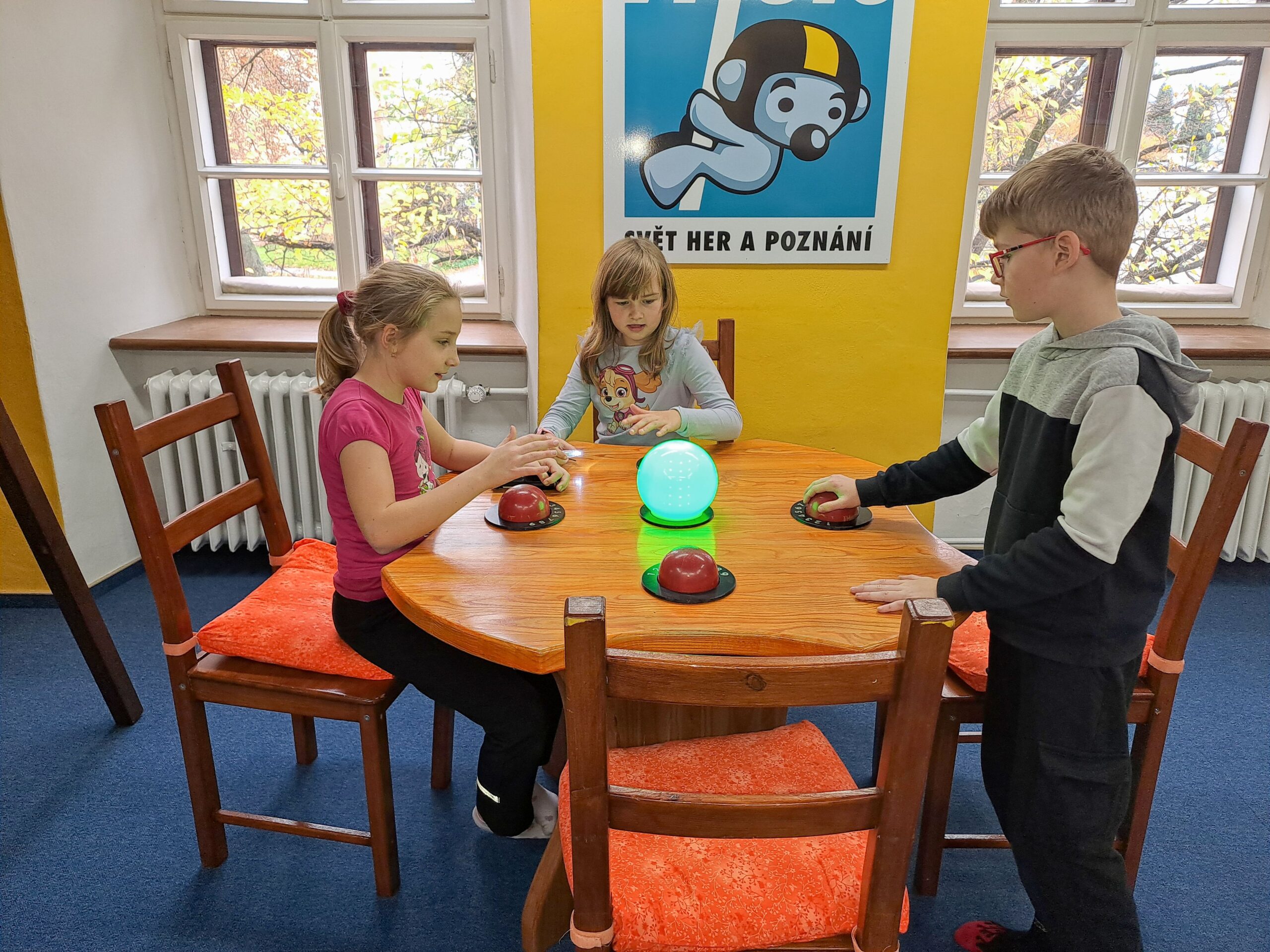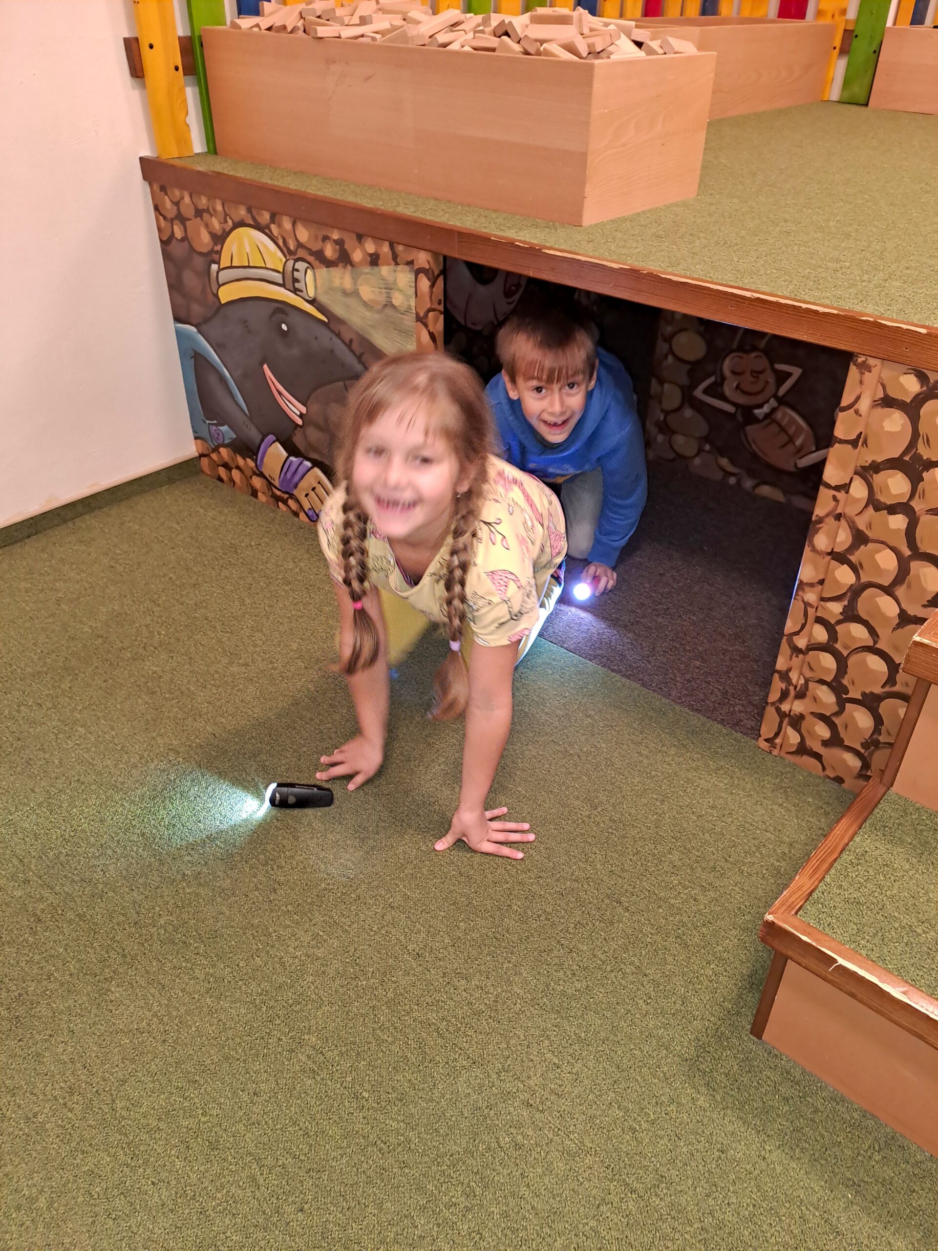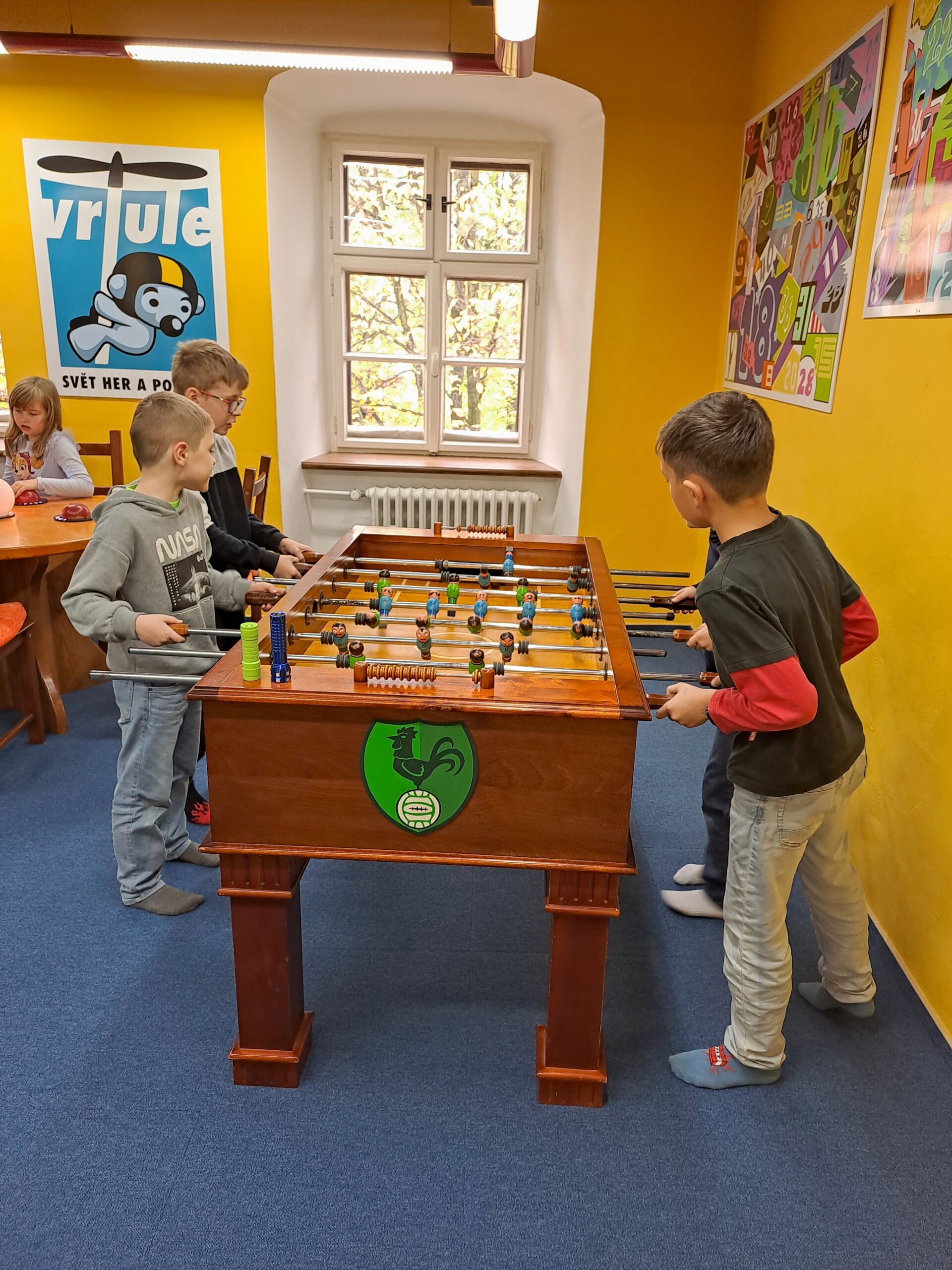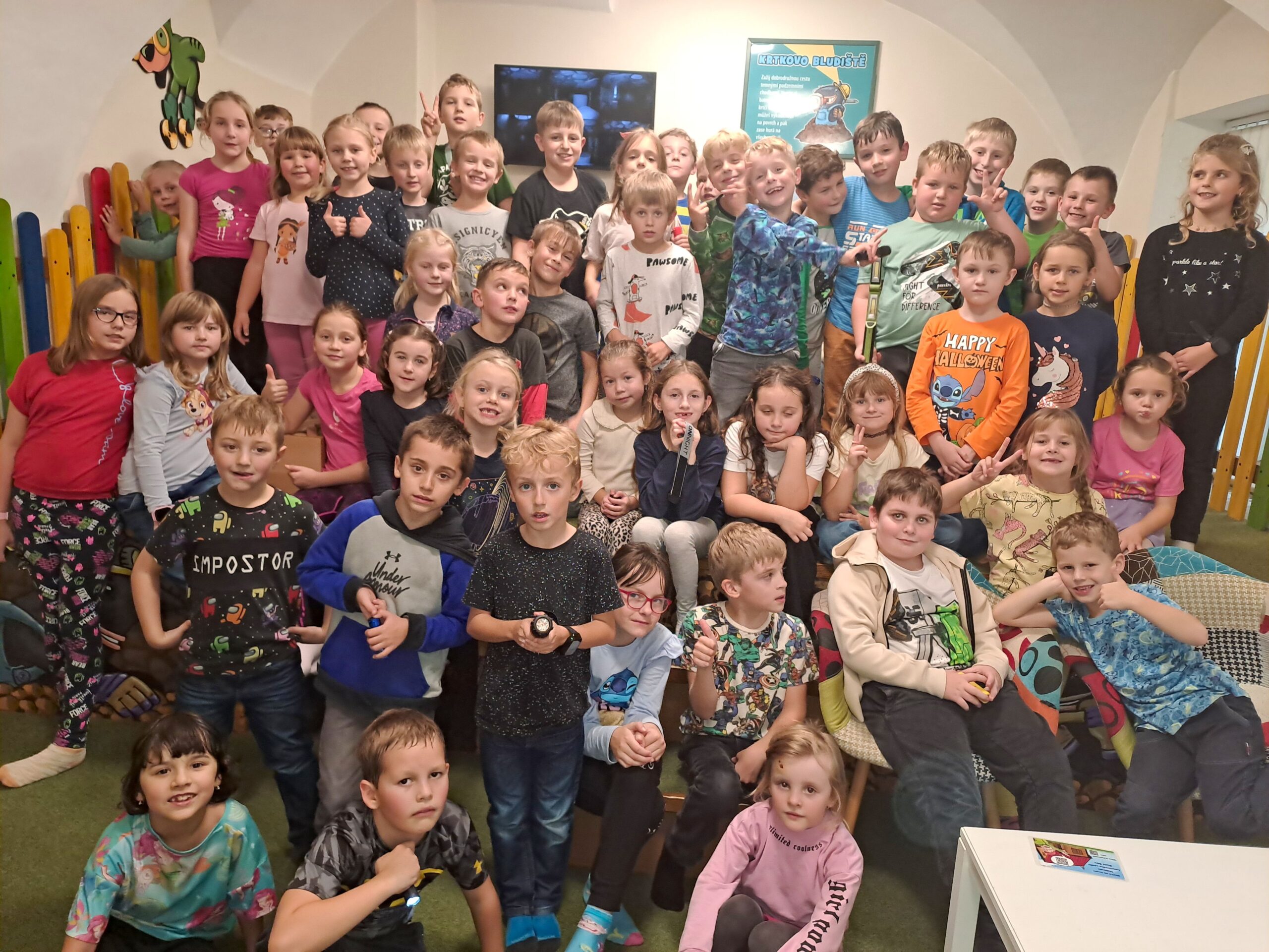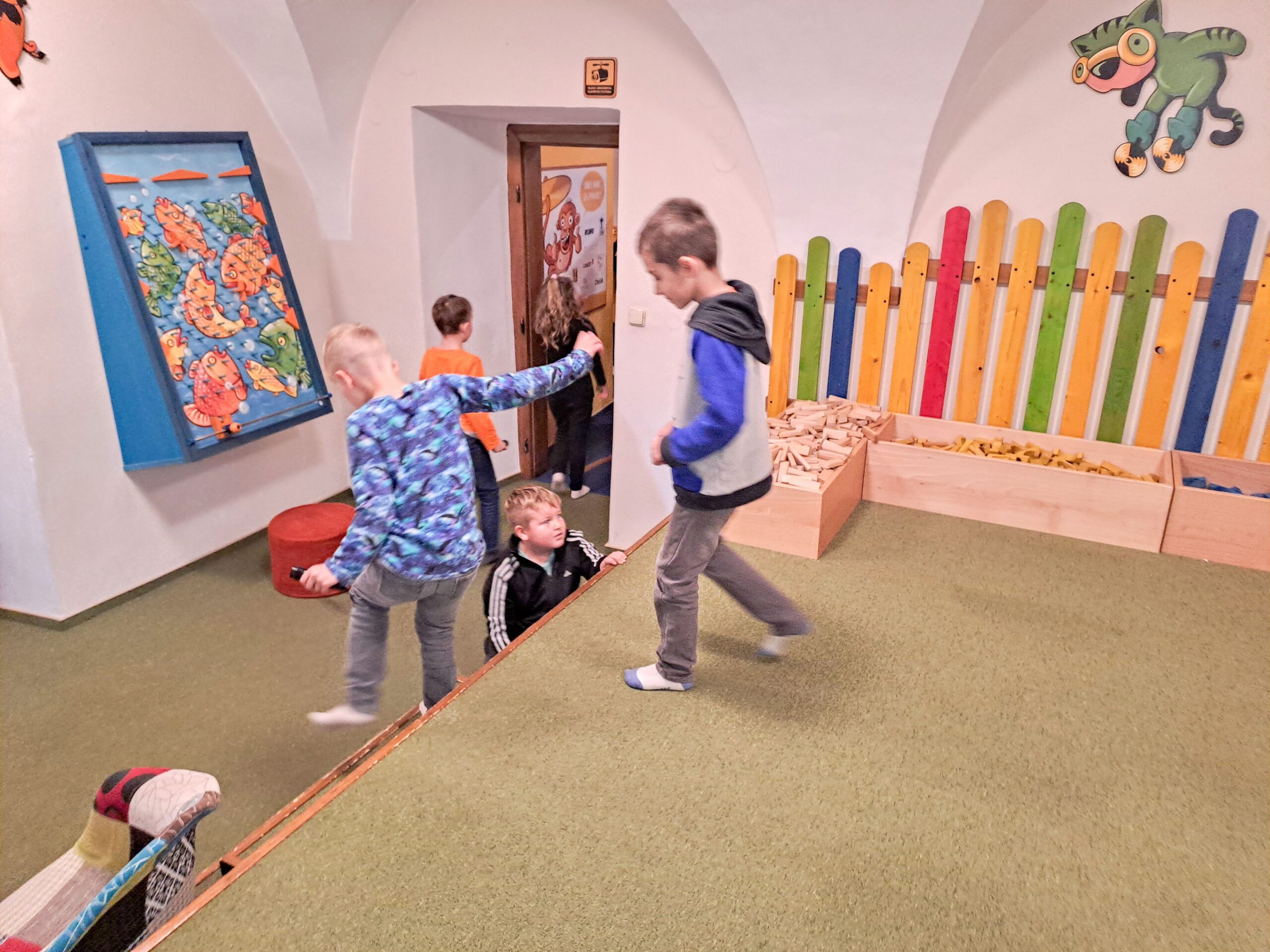 Po příjezdu do Vrtule se děti rozběhly po dvoupatrové budově, kde v každém patře měly k dispozici spoustu různých schovávaček, logických a zábavných her a také za pomoci baterky mohly prolézt tmavým komínem a krtkovým bludištěm. Možností bylo spoustu a proto nevěděly, co vyzkoušet jako první. Přebíhaly z jednoho patra do druhého a nechtěly žádnou hru vynechat. Všechno je zajímalo a vše si chtěly vyzkoušet. Zábavné odpoledne jsme zakončili společnou fotkou, drobným dárečkem a sladkostí. Děti si odpoledne ve Světě her a poznání moc užily.