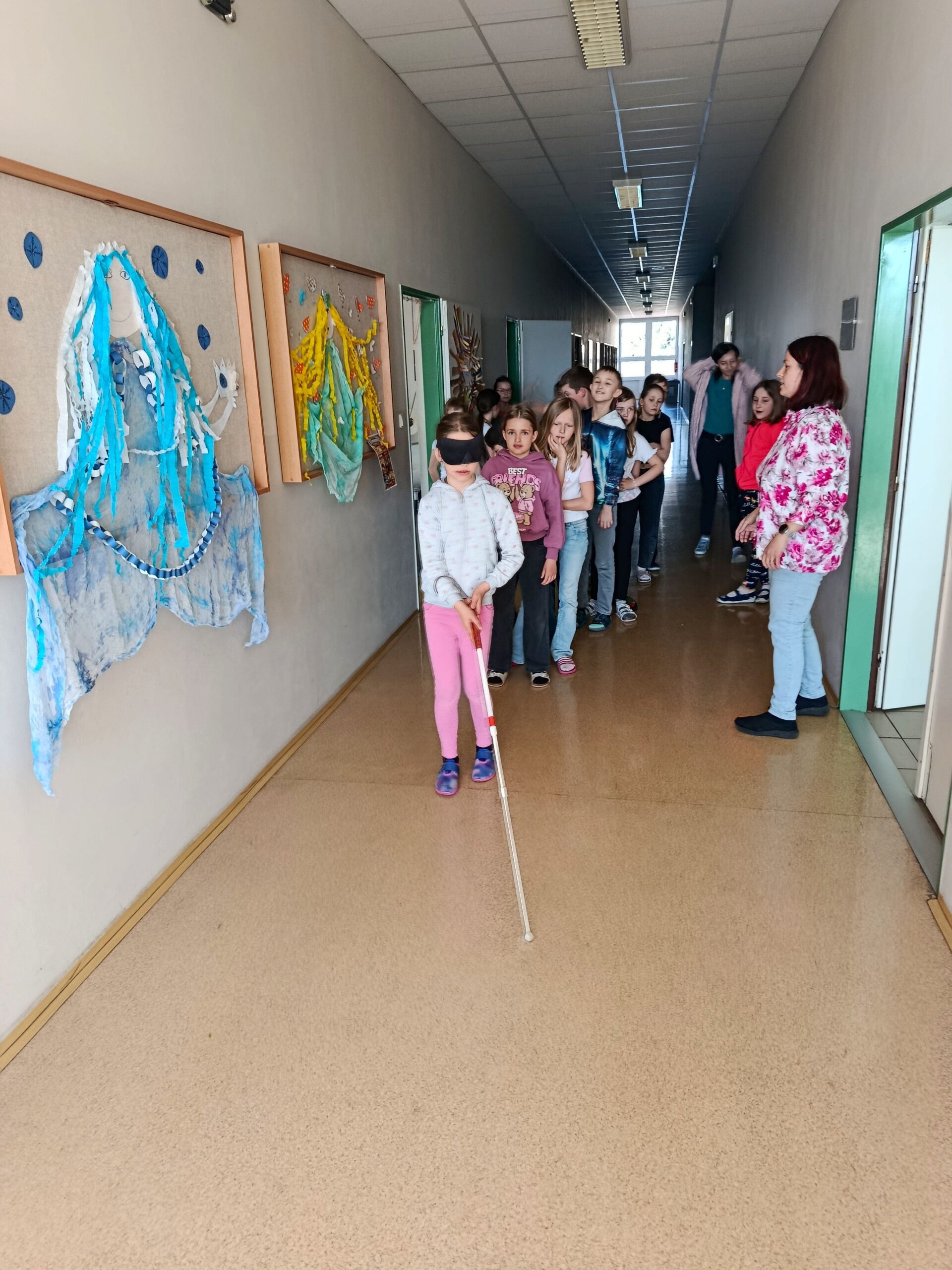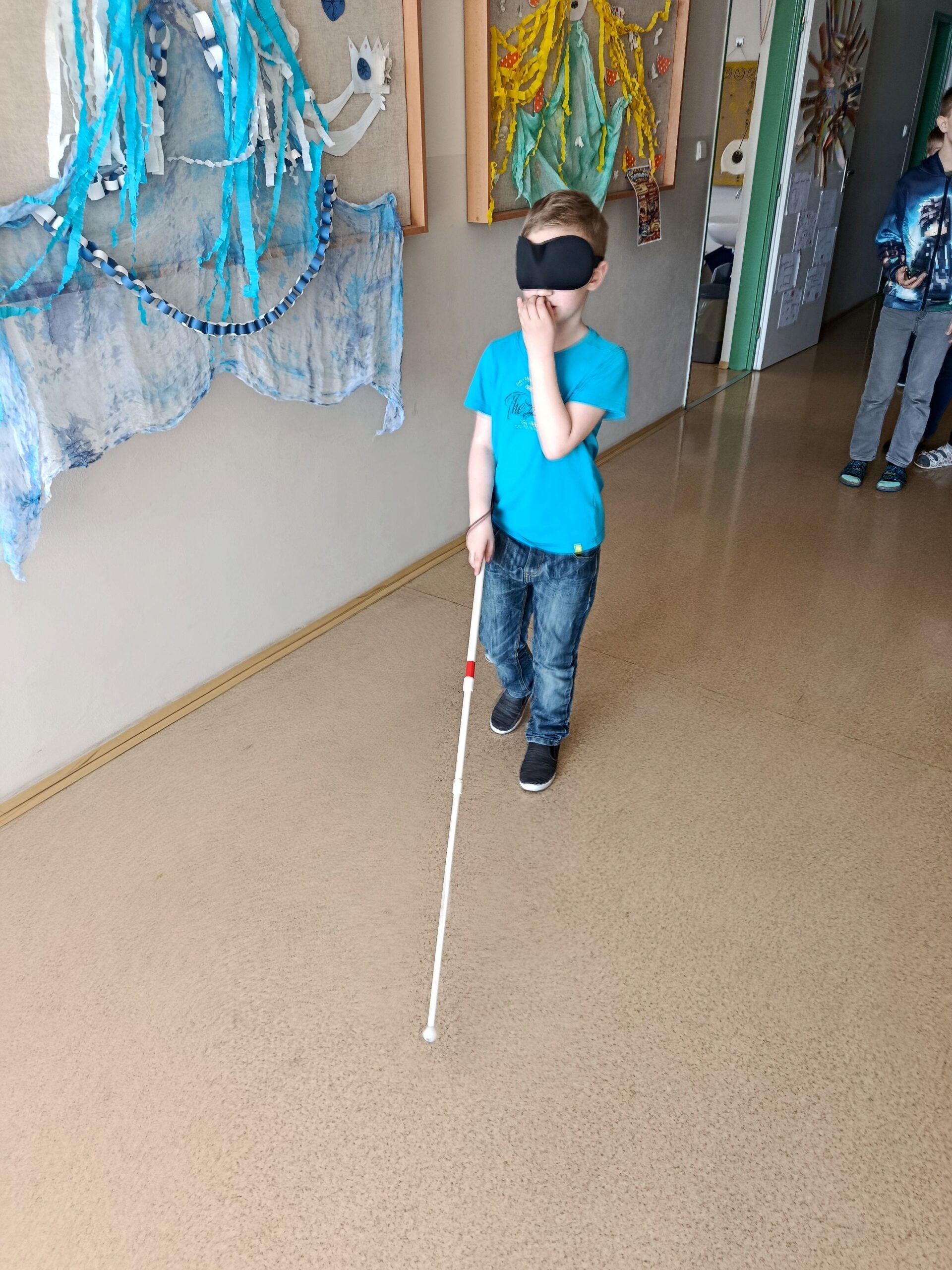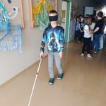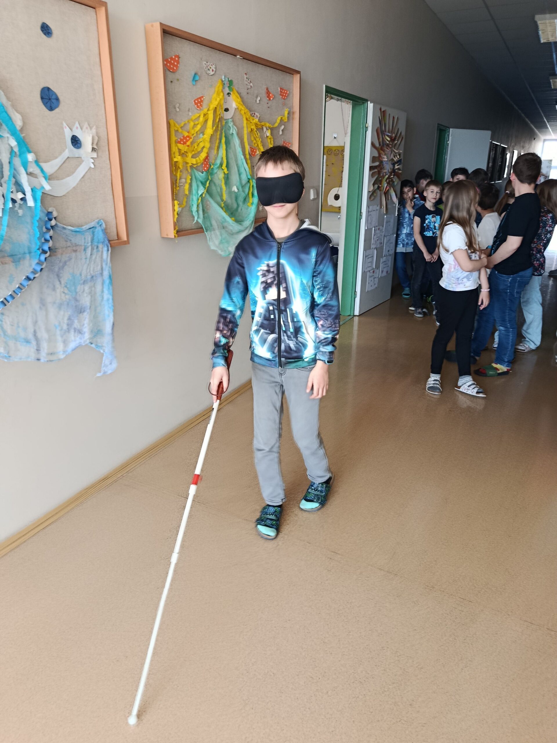 Žáci si vyzkoušeli chůzi s bílou holí, učili se, jak správně nabídnout pomoc nevidomému člověku, a zažili i svačinu v naprosté tmě. Seznámili se s Braillovým písmem, prohlédli si učebnice pro nevidomé, vyzkoušeli si speciální lupy i hry pro nevidomé a pomocí pomůcek i počítače si zkusili napsat své jméno.