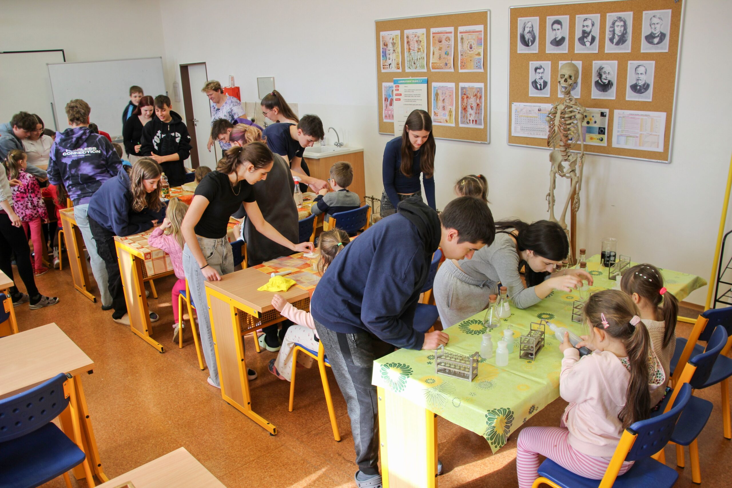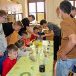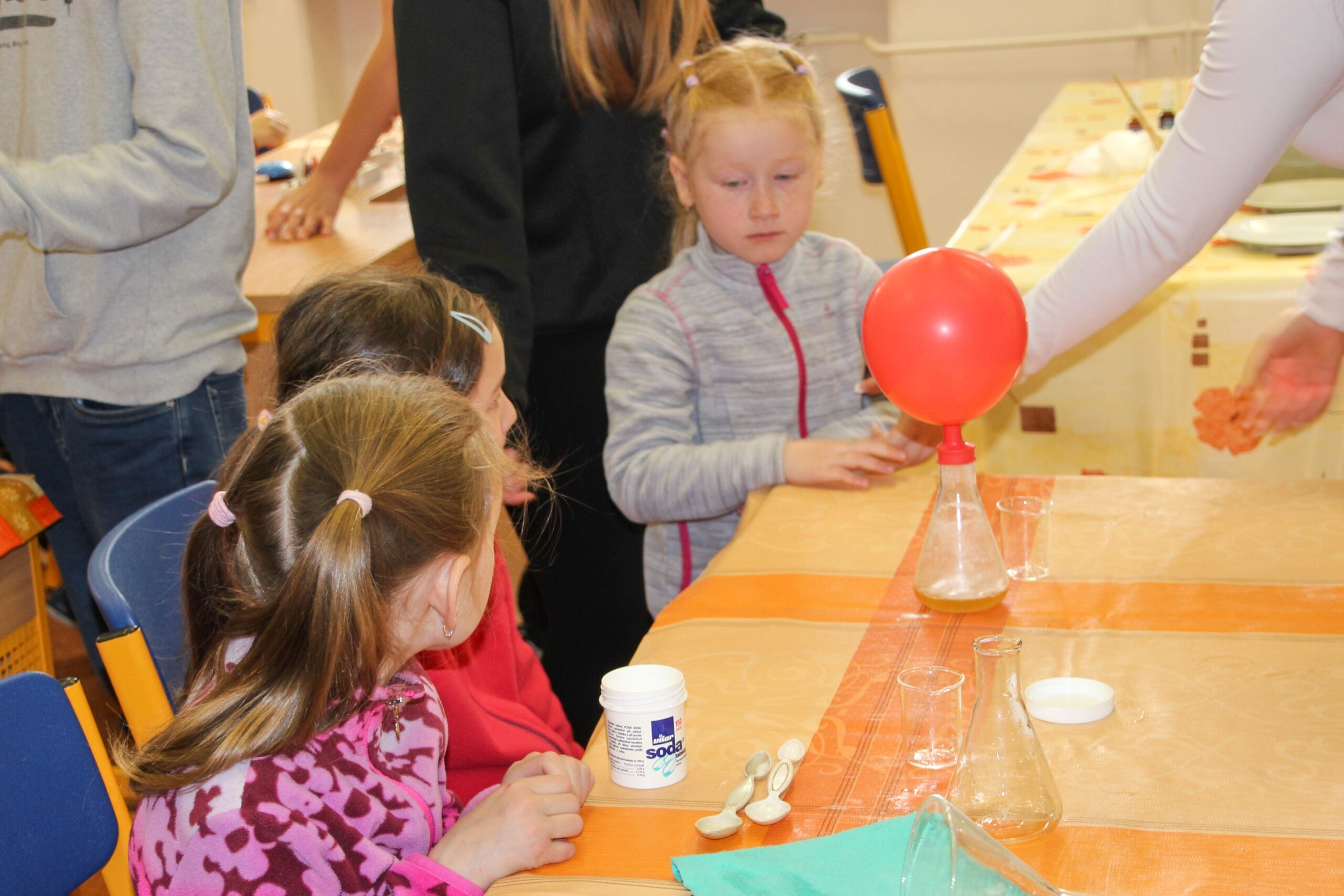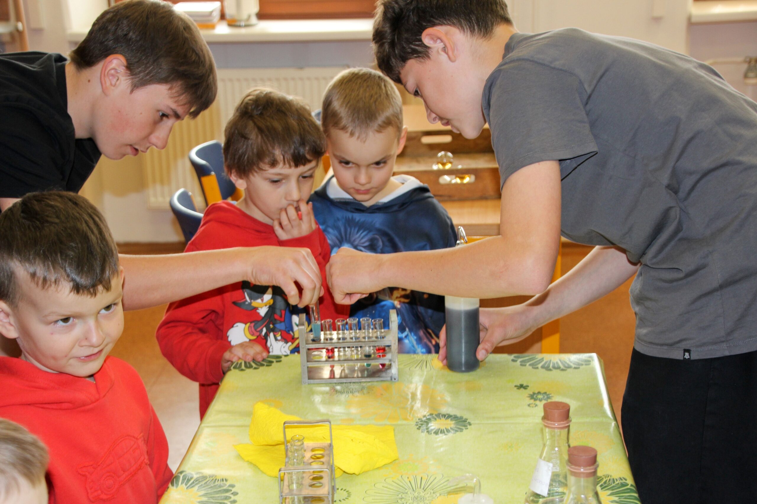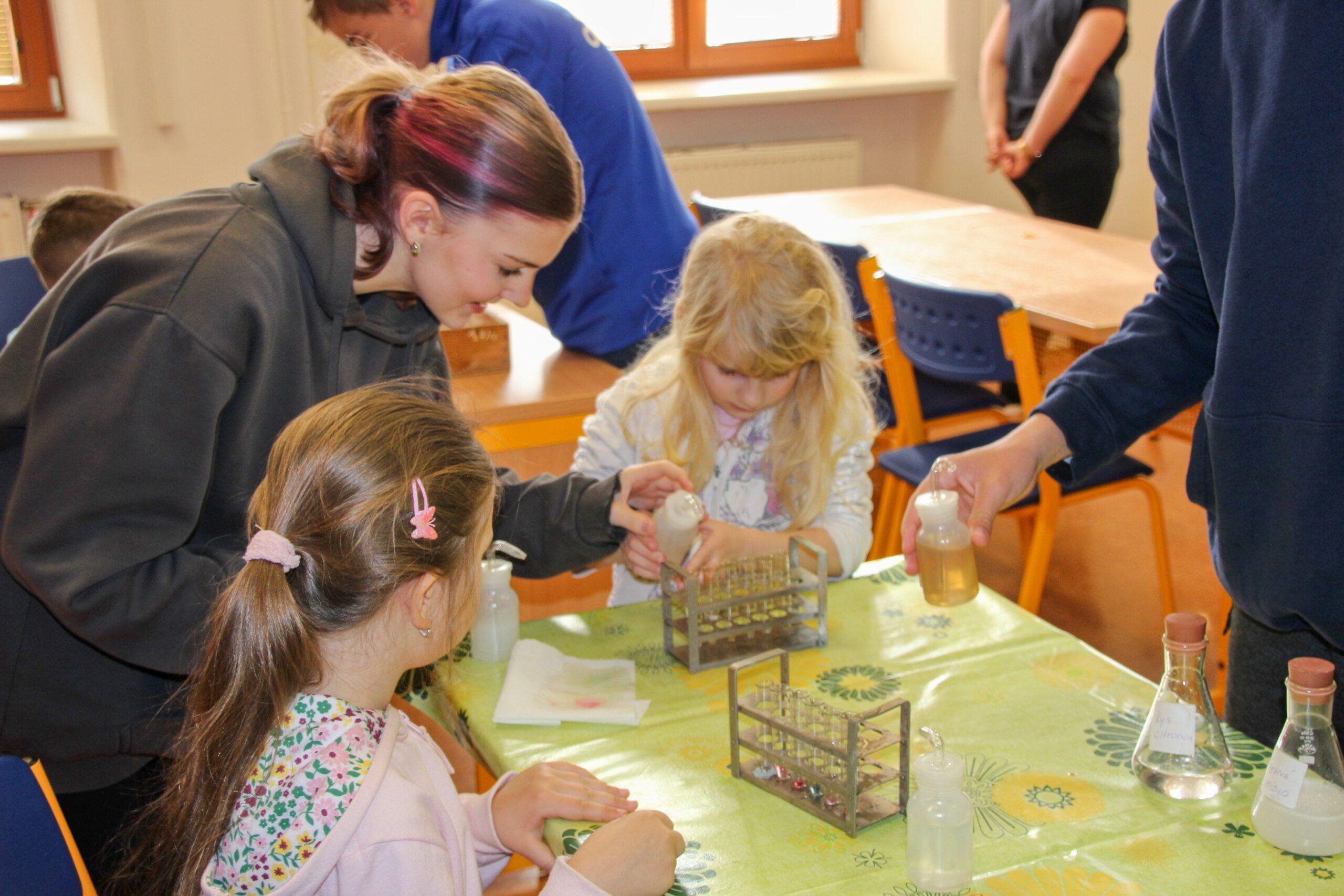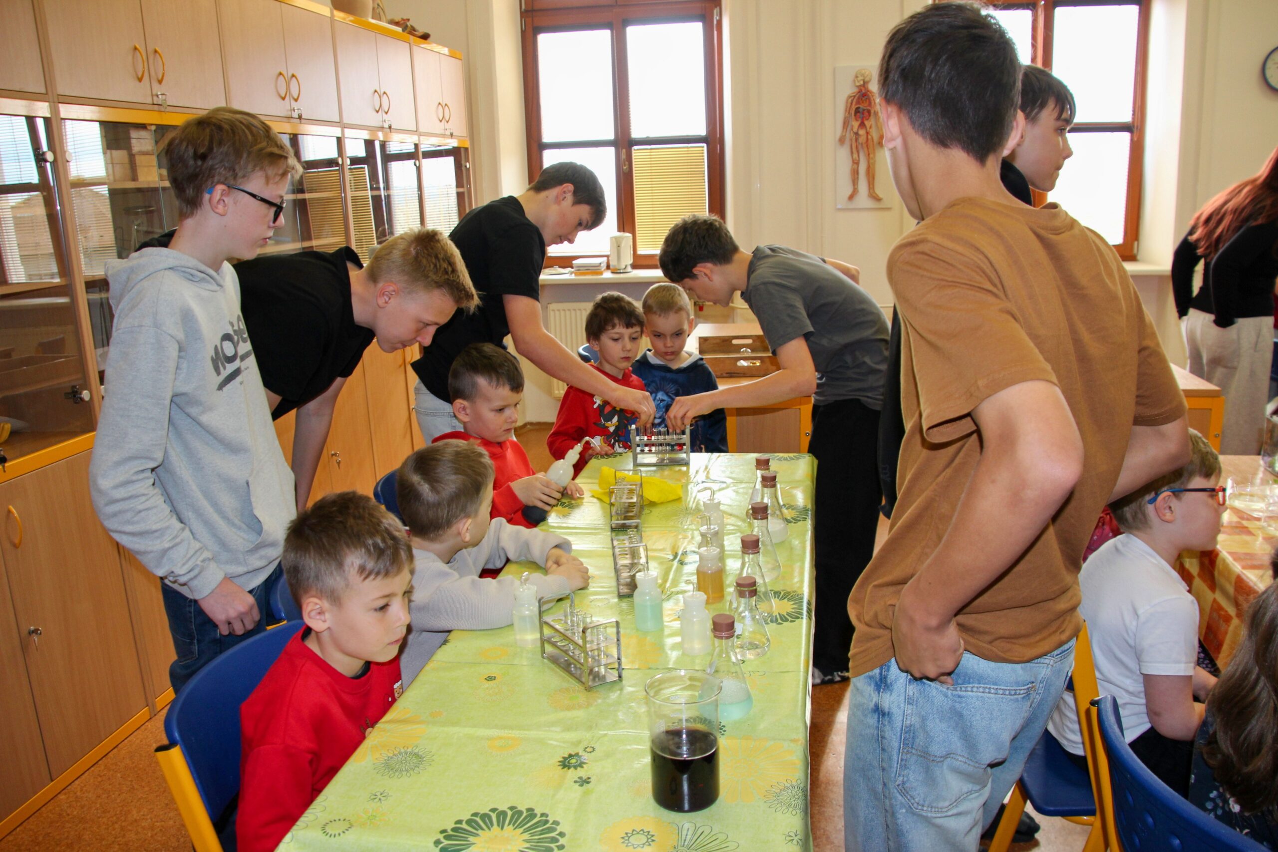 V úterý 14.4. 2026 jsme s žáky 8. třídy přivítali děti z oddělení Berušek Kelečské MŠ. Připravili jsme si pro ně mnoho pokusů, které mohly děti samy provádět. Letos si poprvé každý žáček školky vybral svého velkého kamaráda a ten ho provedl všemi pokusy. Asi to byla dobrá volba, protože každý věděl, jak a co dělat. Pokusy, které si mohli naši malí kamarádi vyzkoušet, musely být voleny tak, aby byly zcela bezpečné, takže jsme pracovali pouze s materiály, které lze najít v kuchyni (soda, ocet, kyselina citronová, mýdlo, červené zelí…). Děti nafukovaly balónky pomocí octu a sody, barvily roztok červeného zelí pomocí mýdla, octu nebo sody, sestavovaly elektrický obvod s žárovkou a zvonkem, měnily barvu kytiček sodou a kyselinou citronovou, pomocí železných pilin zobrazovali indukční čáry magnetu, kreslily barvami v mléce a podobně. Myslím si, že se u nás dětem líbilo, a rádi budeme v této spolupráci s MŠ pokračovat.