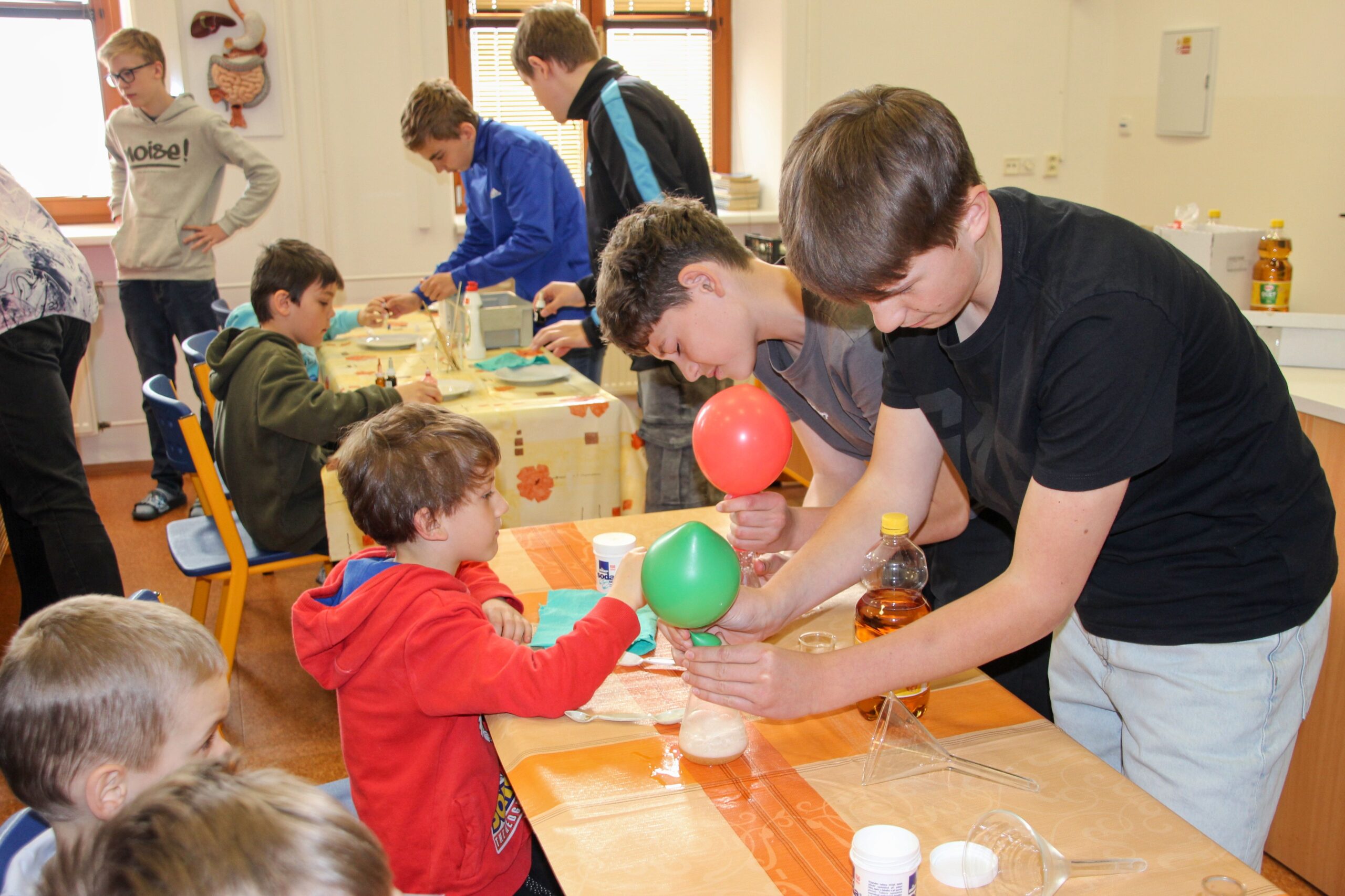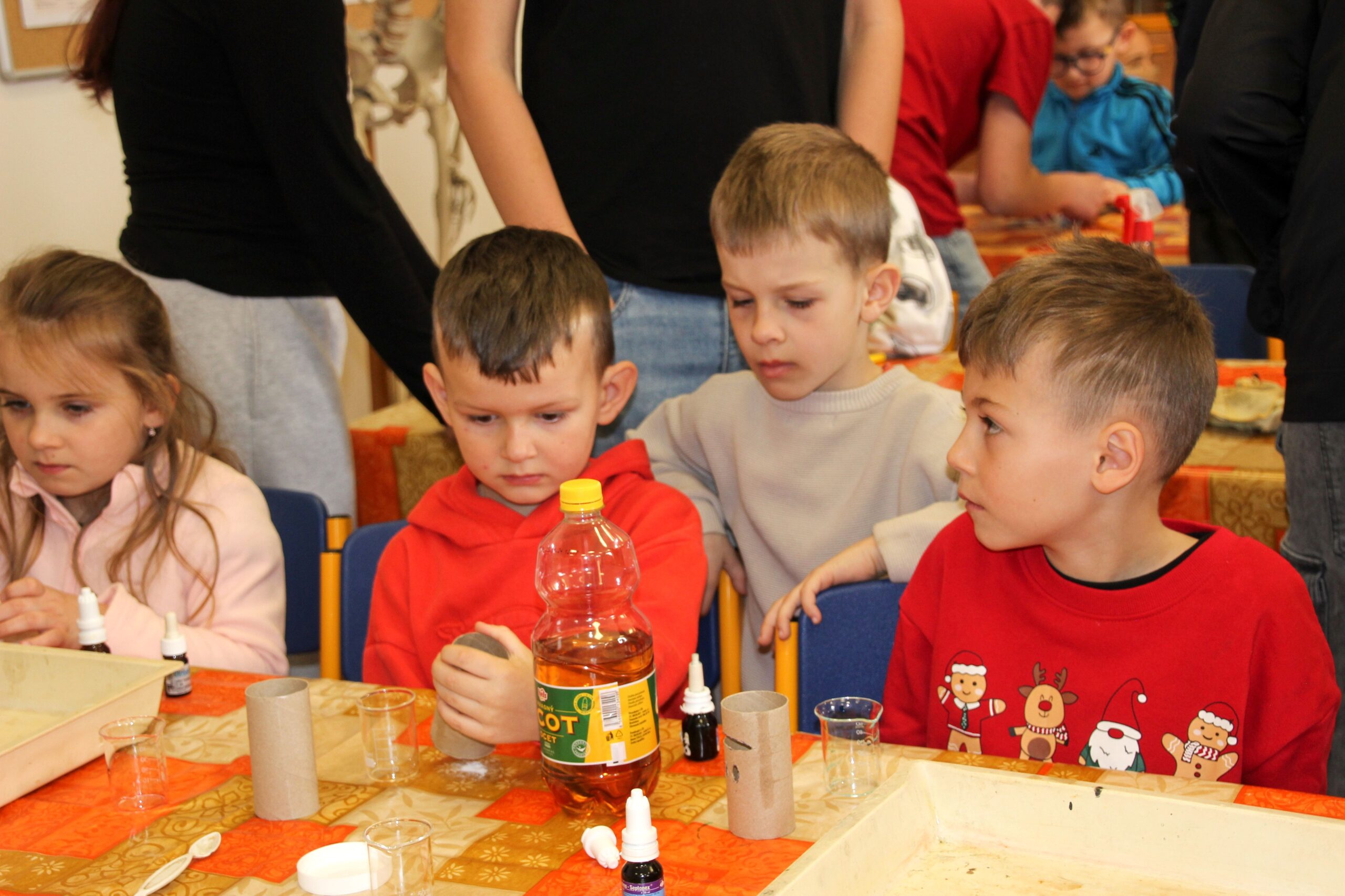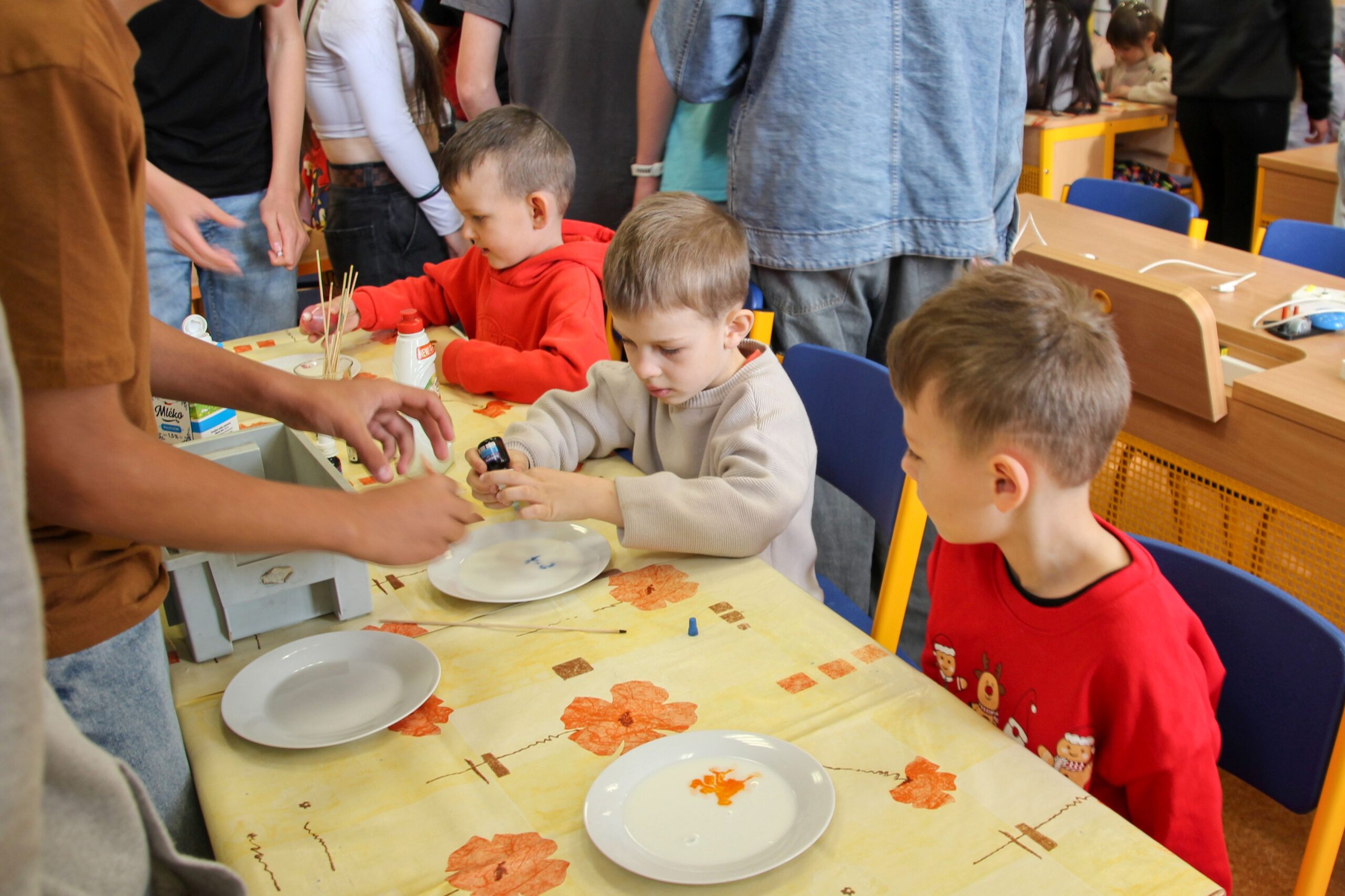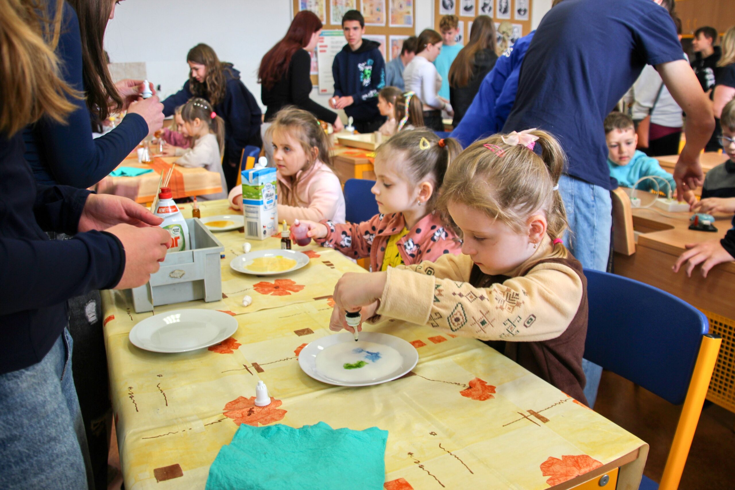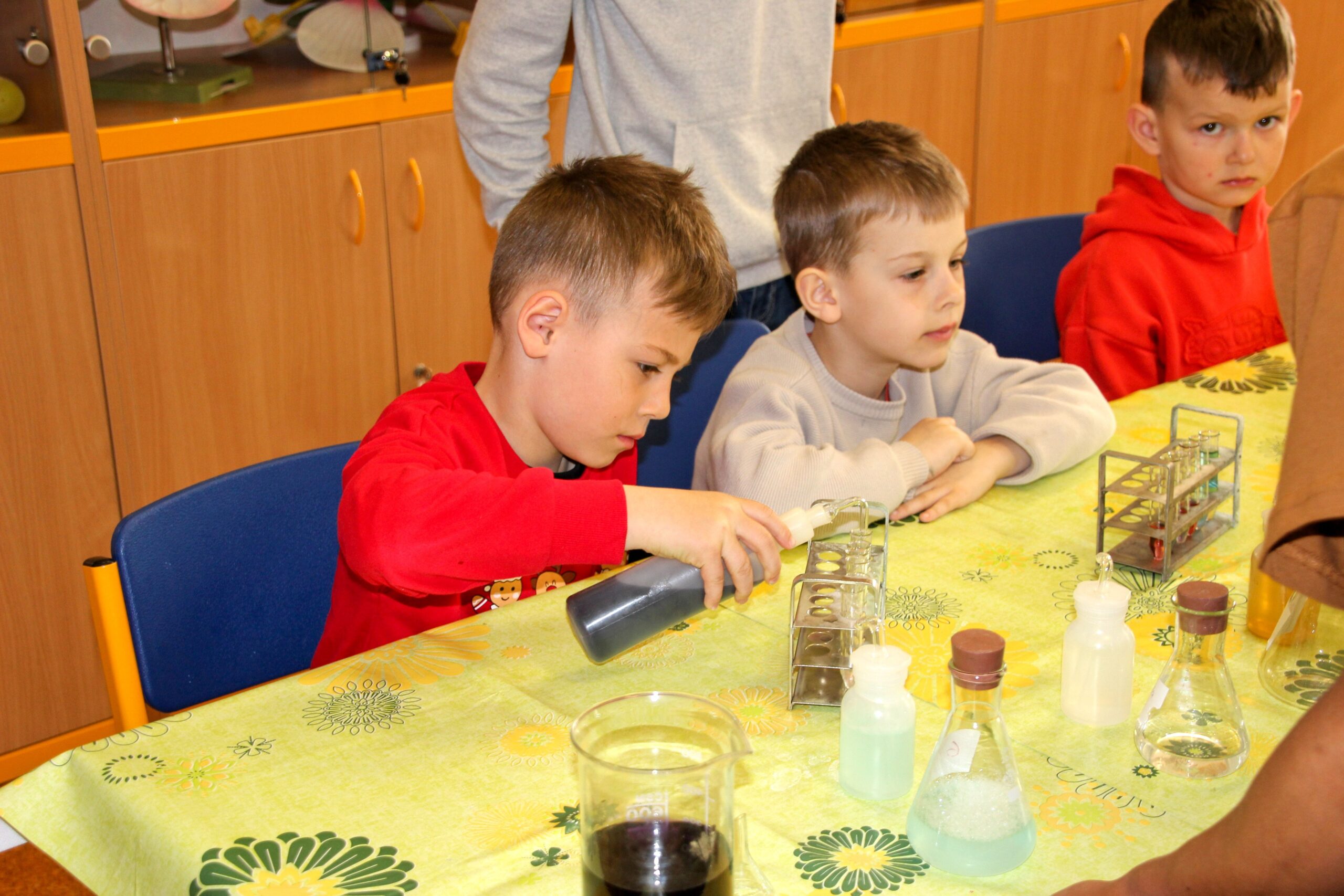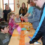 V úterý 14.4. 2026 jsme s žáky 8. třídy přivítali děti z oddělení Berušek Kelečské MŠ. Připravili jsme si pro ně mnoho pokusů, které mohly děti samy provádět. Letos si poprvé každý žáček školky vybral svého velkého kamaráda a ten ho provedl všemi pokusy. Asi to byla dobrá volba, protože každý věděl, jak a co dělat. Pokusy, které si mohli naši malí kamarádi vyzkoušet, musely být voleny tak, aby byly zcela bezpečné, takže jsme pracovali pouze s materiály, které lze najít v kuchyni (soda, ocet, kyselina citronová, mýdlo, červené zelí…). Děti nafukovaly balónky pomocí octu a sody, barvily roztok červeného zelí pomocí mýdla, octu nebo sody, sestavovaly elektrický obvod s žárovkou a zvonkem, měnily barvu kytiček sodou a kyselinou citronovou, pomocí železných pilin zobrazovali indukční čáry magnetu, kreslily barvami v mléce a podobně. Myslím si, že se u nás dětem líbilo, a rádi budeme v této spolupráci s MŠ pokračovat.