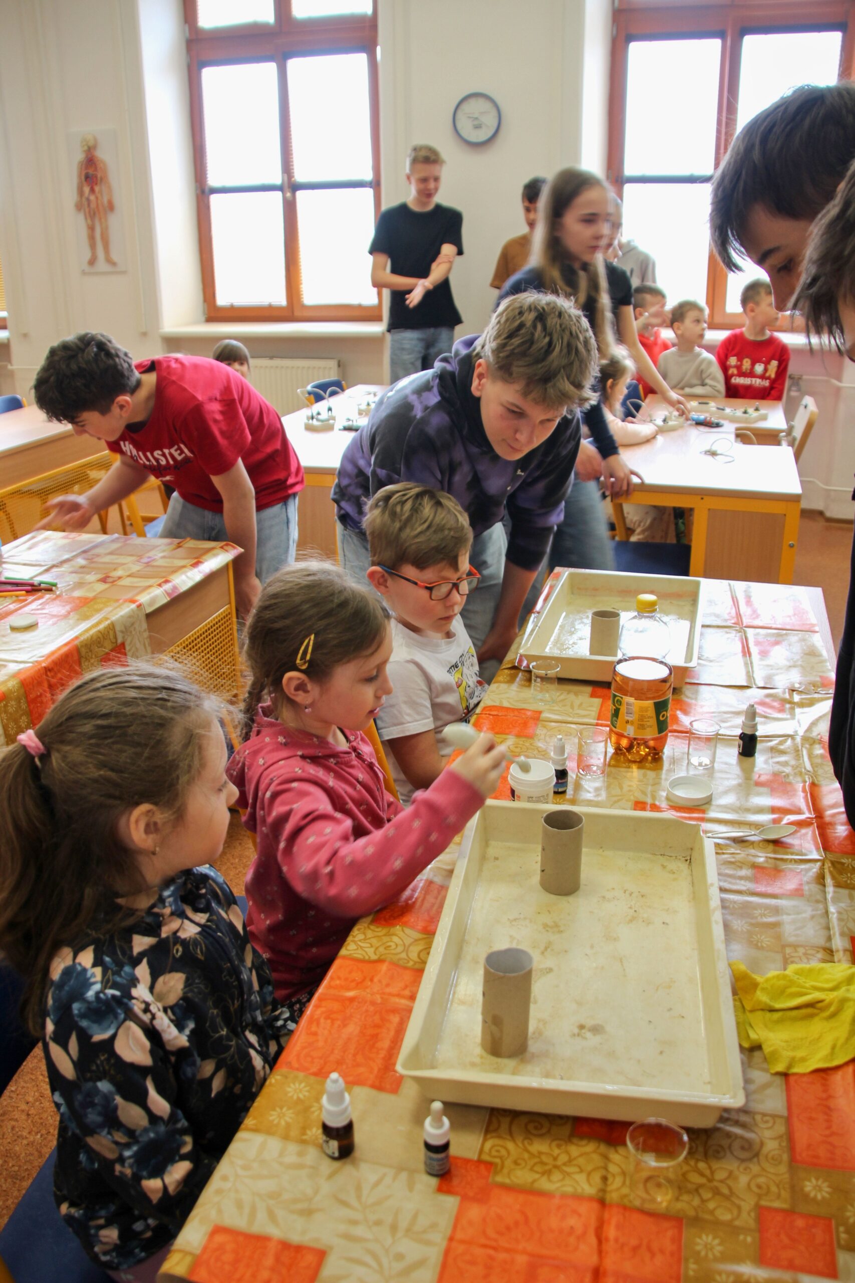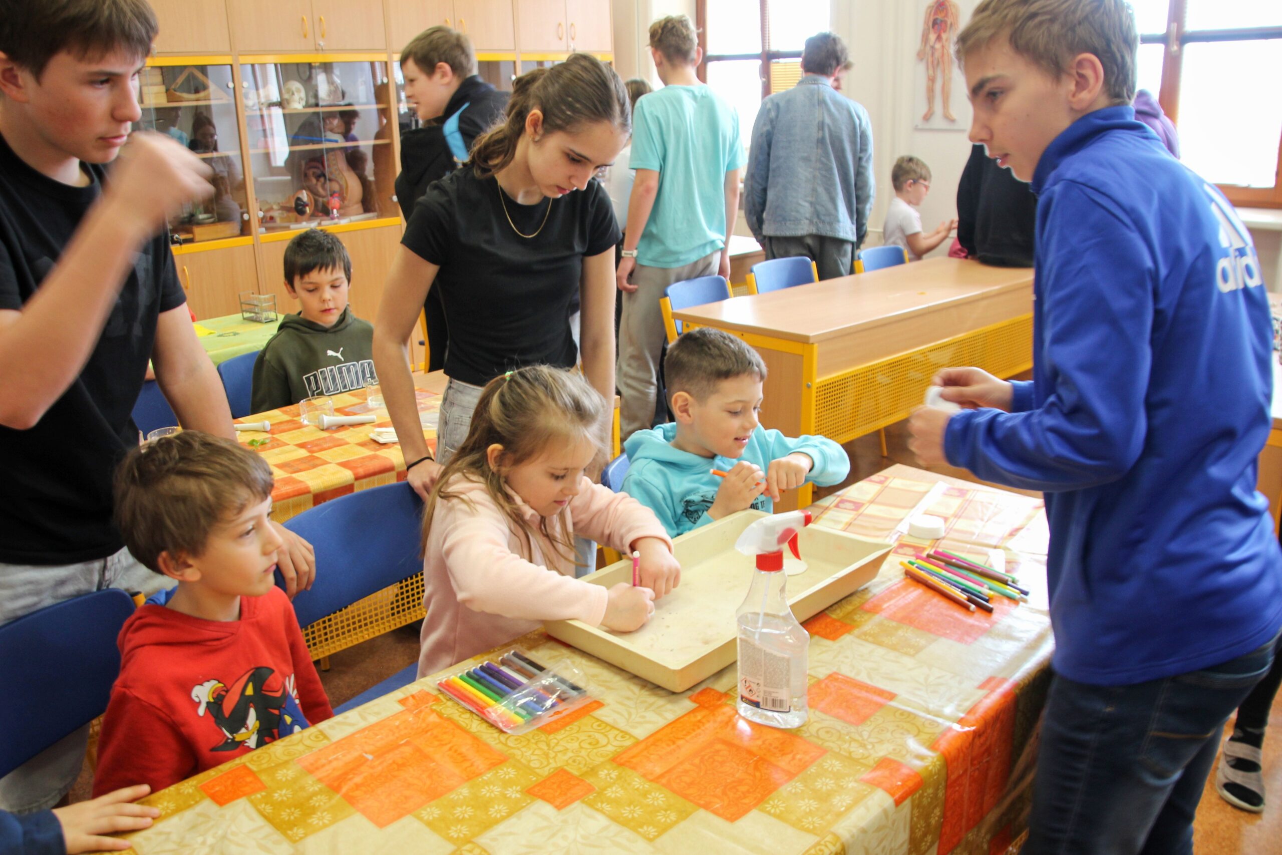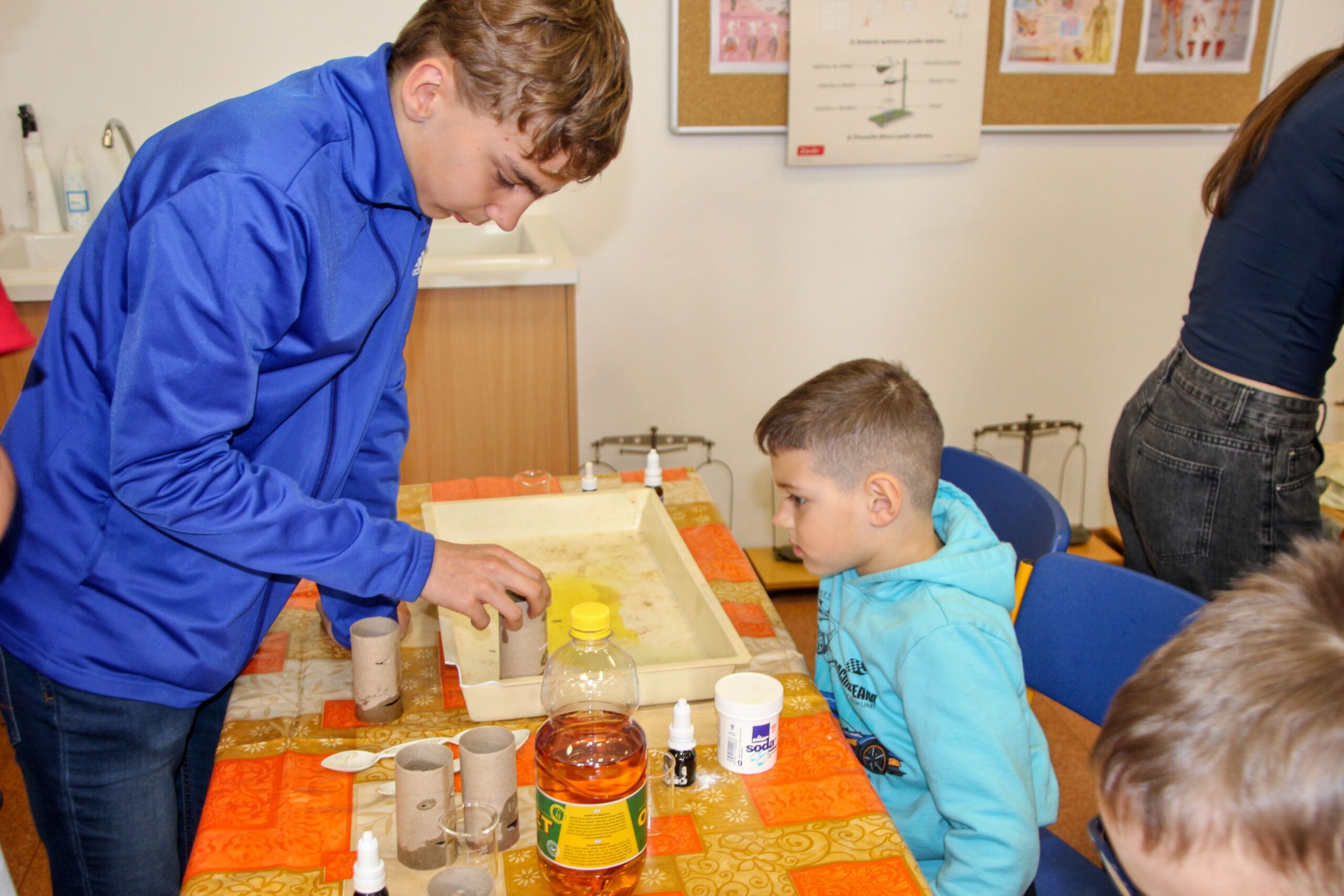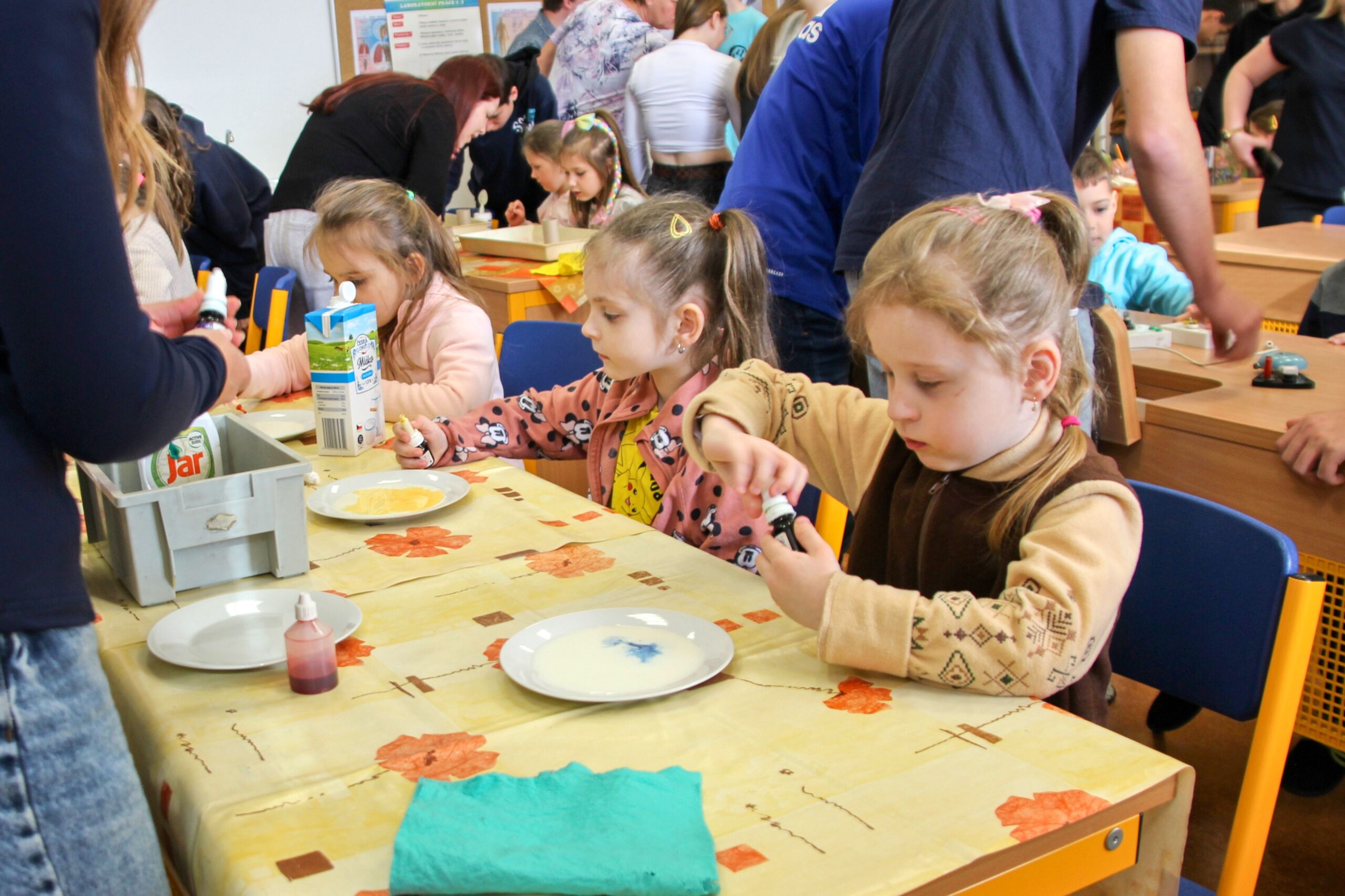 V úterý 14.4. 2026 jsme s žáky 8. třídy přivítali děti z oddělení Berušek Kelečské MŠ. Připravili jsme si pro ně mnoho pokusů, které mohly děti samy provádět. Letos si poprvé každý žáček školky vybral svého velkého kamaráda a ten ho provedl všemi pokusy. Asi to byla dobrá volba, protože každý věděl, jak a co dělat. Pokusy, které si mohli naši malí kamarádi vyzkoušet, musely být voleny tak, aby byly zcela bezpečné, takže jsme pracovali pouze s materiály, které lze najít v kuchyni (soda, ocet, kyselina citronová, mýdlo, červené zelí…). Děti nafukovaly balónky pomocí octu a sody, barvily roztok červeného zelí pomocí mýdla, octu nebo sody, sestavovaly elektrický obvod s žárovkou a zvonkem, měnily barvu kytiček sodou a kyselinou citronovou, pomocí železných pilin zobrazovali indukční čáry magnetu, kreslily barvami v mléce a podobně. Myslím si, že se u nás dětem líbilo, a rádi budeme v této spolupráci s MŠ pokračovat.