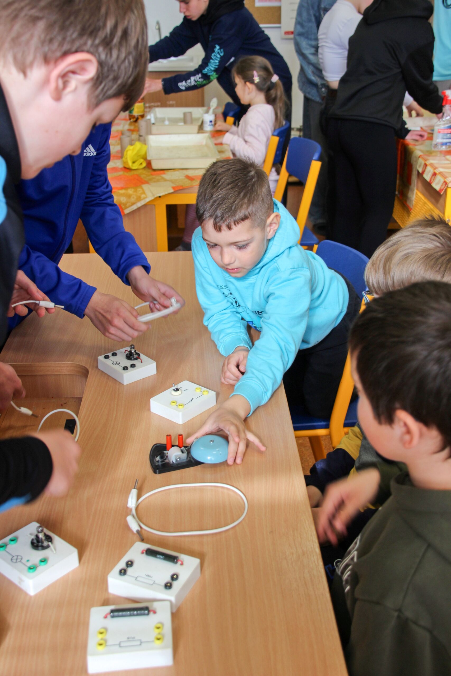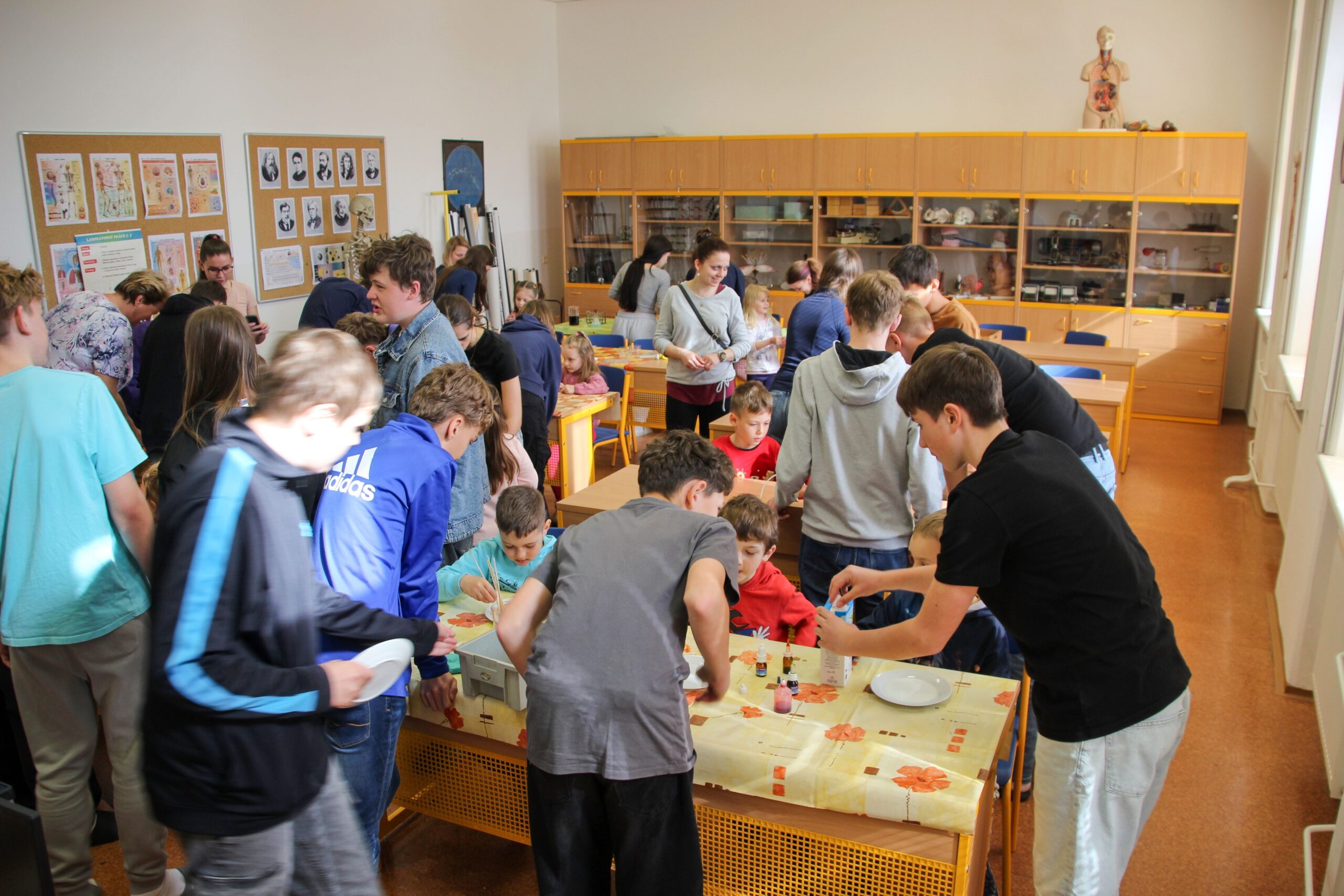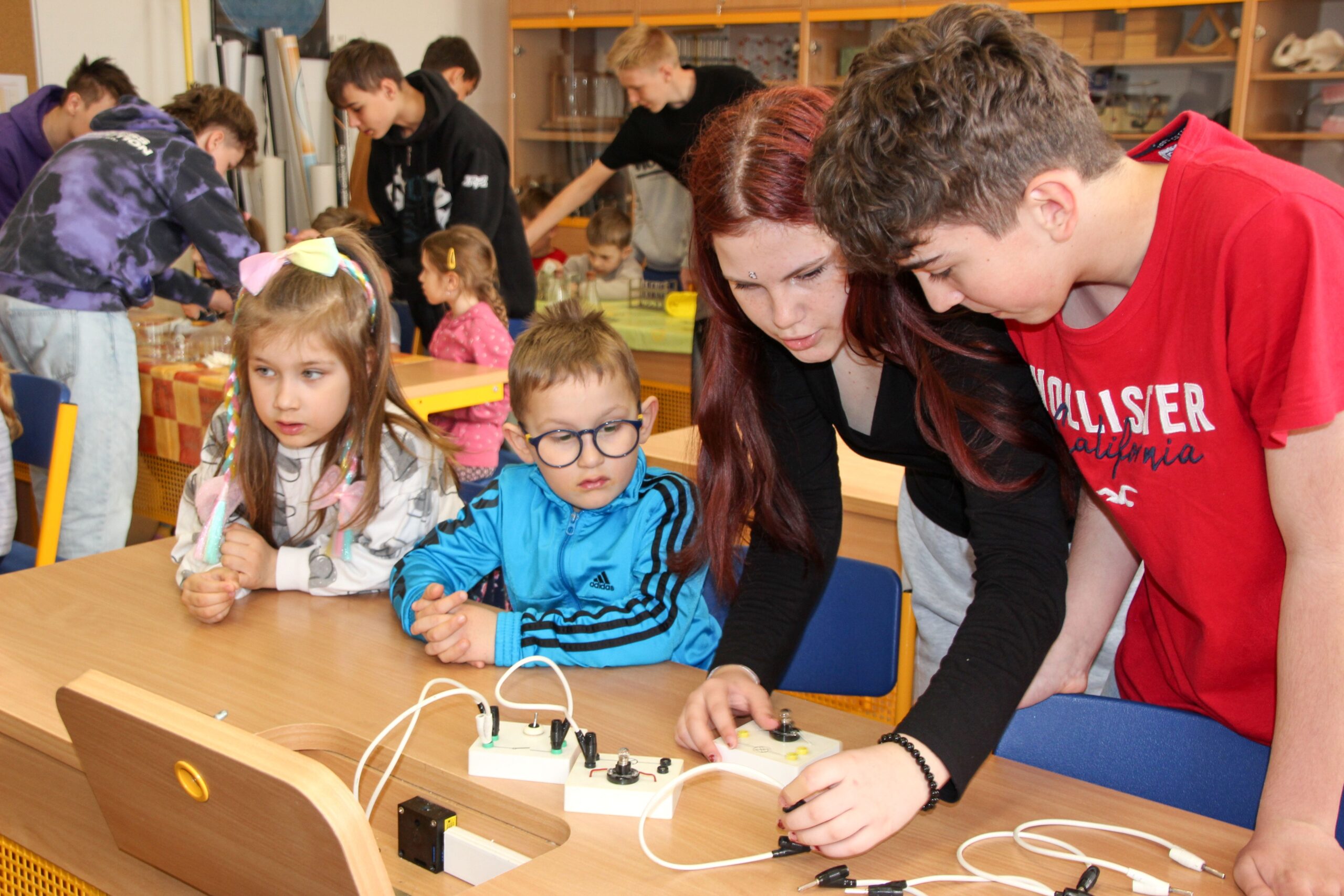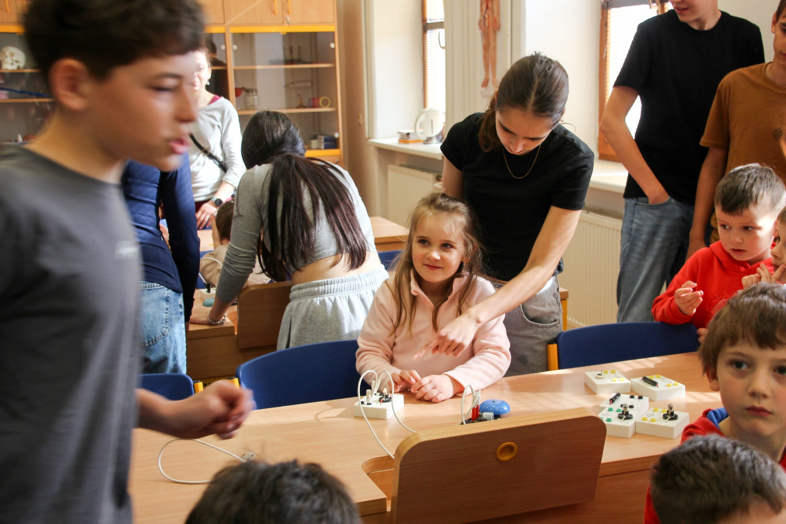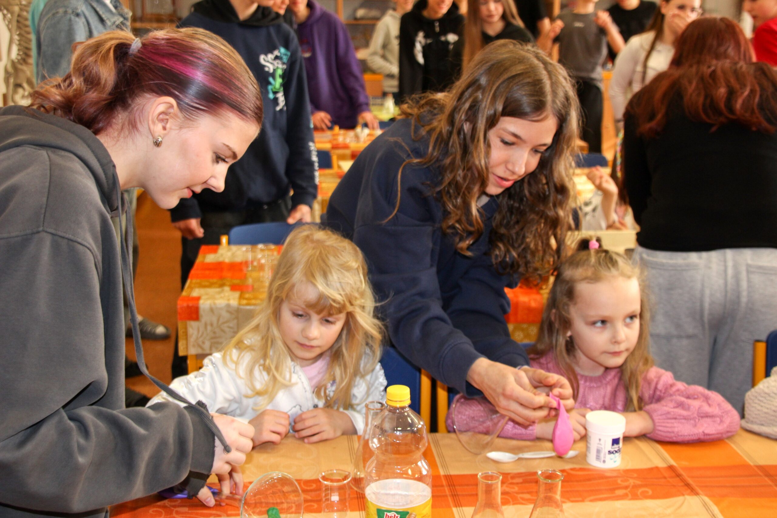 V úterý 14.4. 2026 jsme s žáky 8. třídy přivítali děti z oddělení Berušek Kelečské MŠ. Připravili jsme si pro ně mnoho pokusů, které mohly děti samy provádět. Letos si poprvé každý žáček školky vybral svého velkého kamaráda a ten ho provedl všemi pokusy. Asi to byla dobrá volba, protože každý věděl, jak a co dělat. Pokusy, které si mohli naši malí kamarádi vyzkoušet, musely být voleny tak, aby byly zcela bezpečné, takže jsme pracovali pouze s materiály, které lze najít v kuchyni (soda, ocet, kyselina citronová, mýdlo, červené zelí…). Děti nafukovaly balónky pomocí octu a sody, barvily roztok červeného zelí pomocí mýdla, octu nebo sody, sestavovaly elektrický obvod s žárovkou a zvonkem, měnily barvu kytiček sodou a kyselinou citronovou, pomocí železných pilin zobrazovali indukční čáry magnetu, kreslily barvami v mléce a podobně. Myslím si, že se u nás dětem líbilo, a rádi budeme v této spolupráci s MŠ pokračovat.