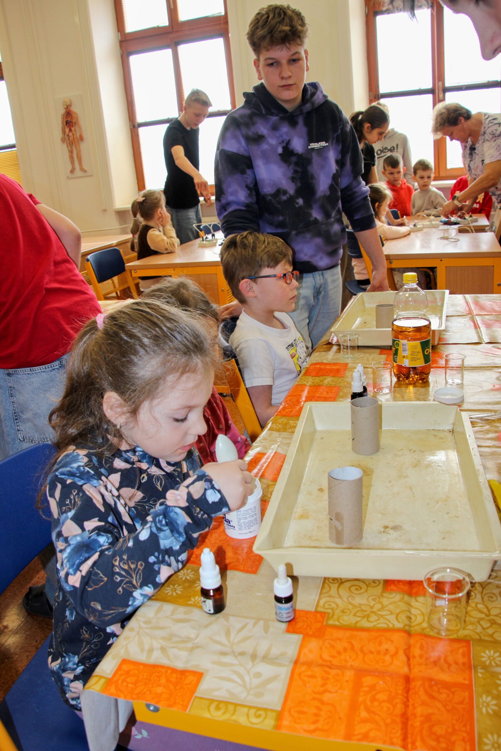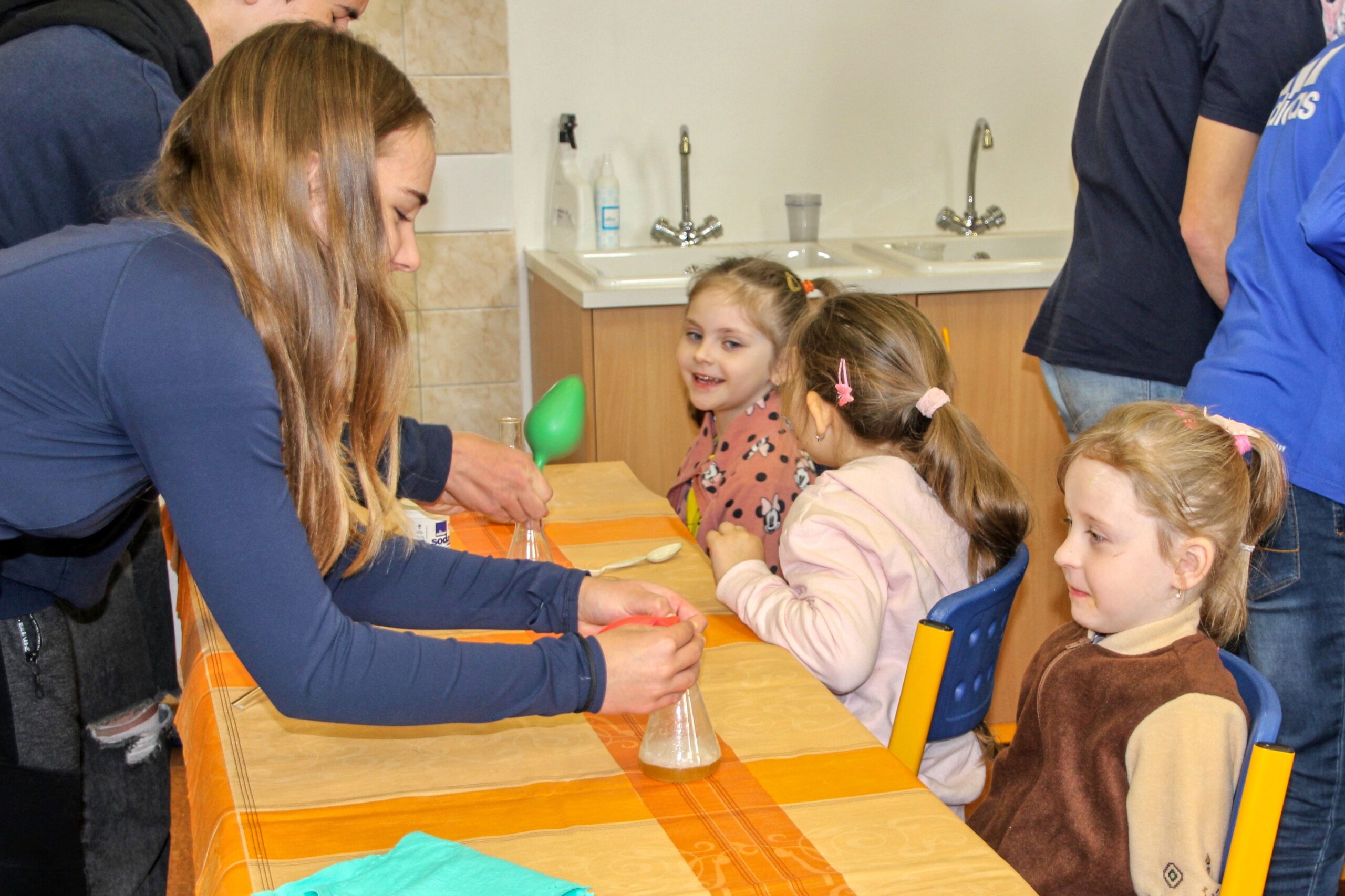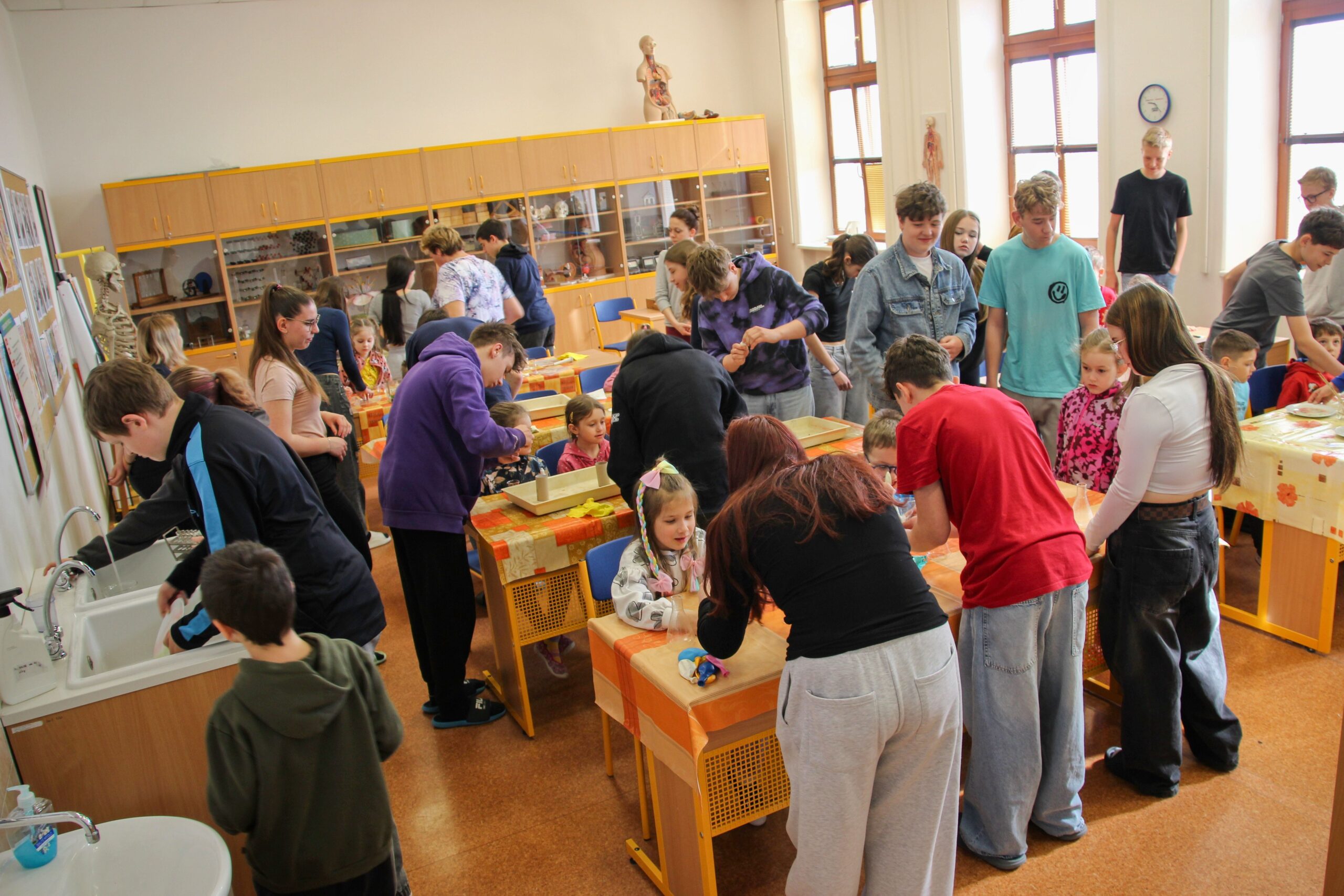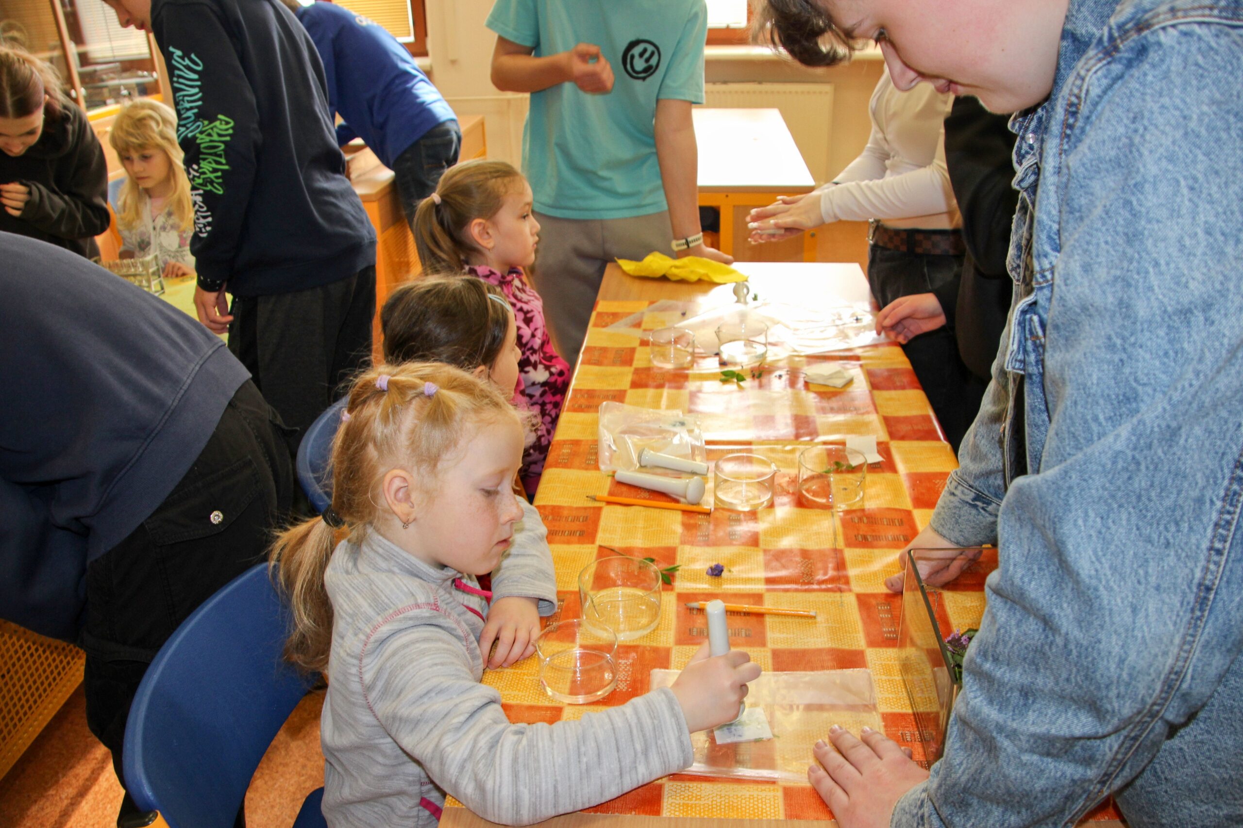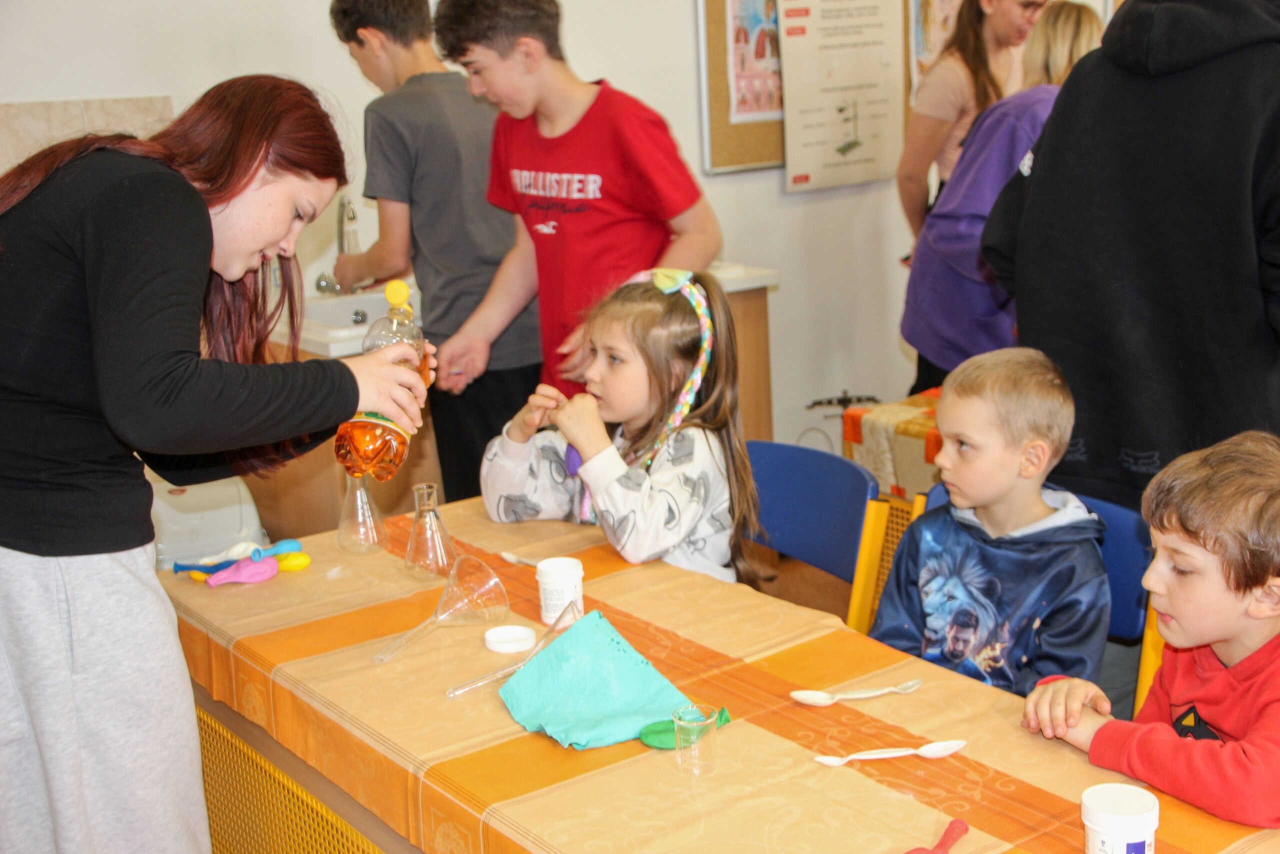 V úterý 14.4. 2026 jsme s žáky 8. třídy přivítali děti z oddělení Berušek Kelečské MŠ. Připravili jsme si pro ně mnoho pokusů, které mohly děti samy provádět. Letos si poprvé každý žáček školky vybral svého velkého kamaráda a ten ho provedl všemi pokusy. Asi to byla dobrá volba, protože každý věděl, jak a co dělat. Pokusy, které si mohli naši malí kamarádi vyzkoušet, musely být voleny tak, aby byly zcela bezpečné, takže jsme pracovali pouze s materiály, které lze najít v kuchyni (soda, ocet, kyselina citronová, mýdlo, červené zelí…). Děti nafukovaly balónky pomocí octu a sody, barvily roztok červeného zelí pomocí mýdla, octu nebo sody, sestavovaly elektrický obvod s žárovkou a zvonkem, měnily barvu kytiček sodou a kyselinou citronovou, pomocí železných pilin zobrazovali indukční čáry magnetu, kreslily barvami v mléce a podobně. Myslím si, že se u nás dětem líbilo, a rádi budeme v této spolupráci s MŠ pokračovat.