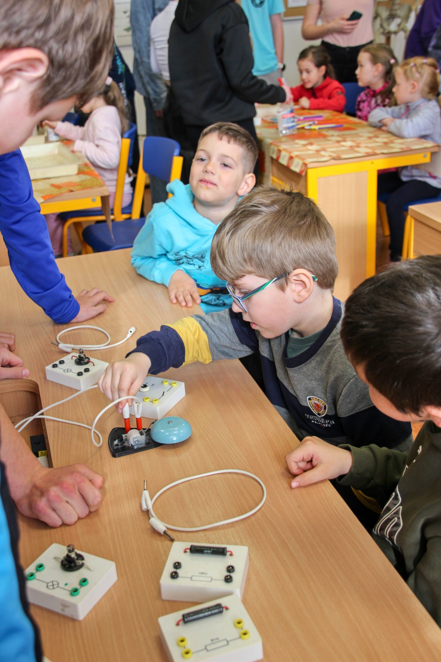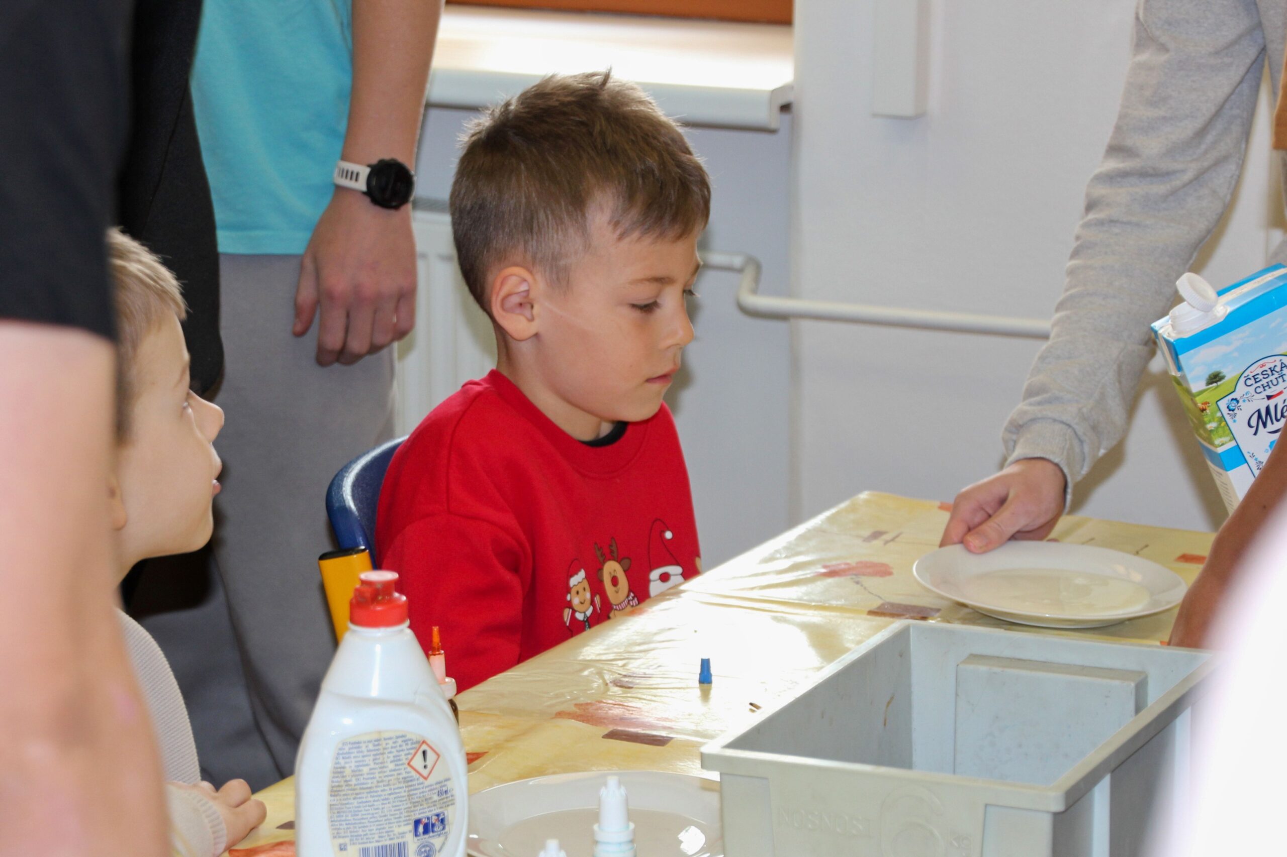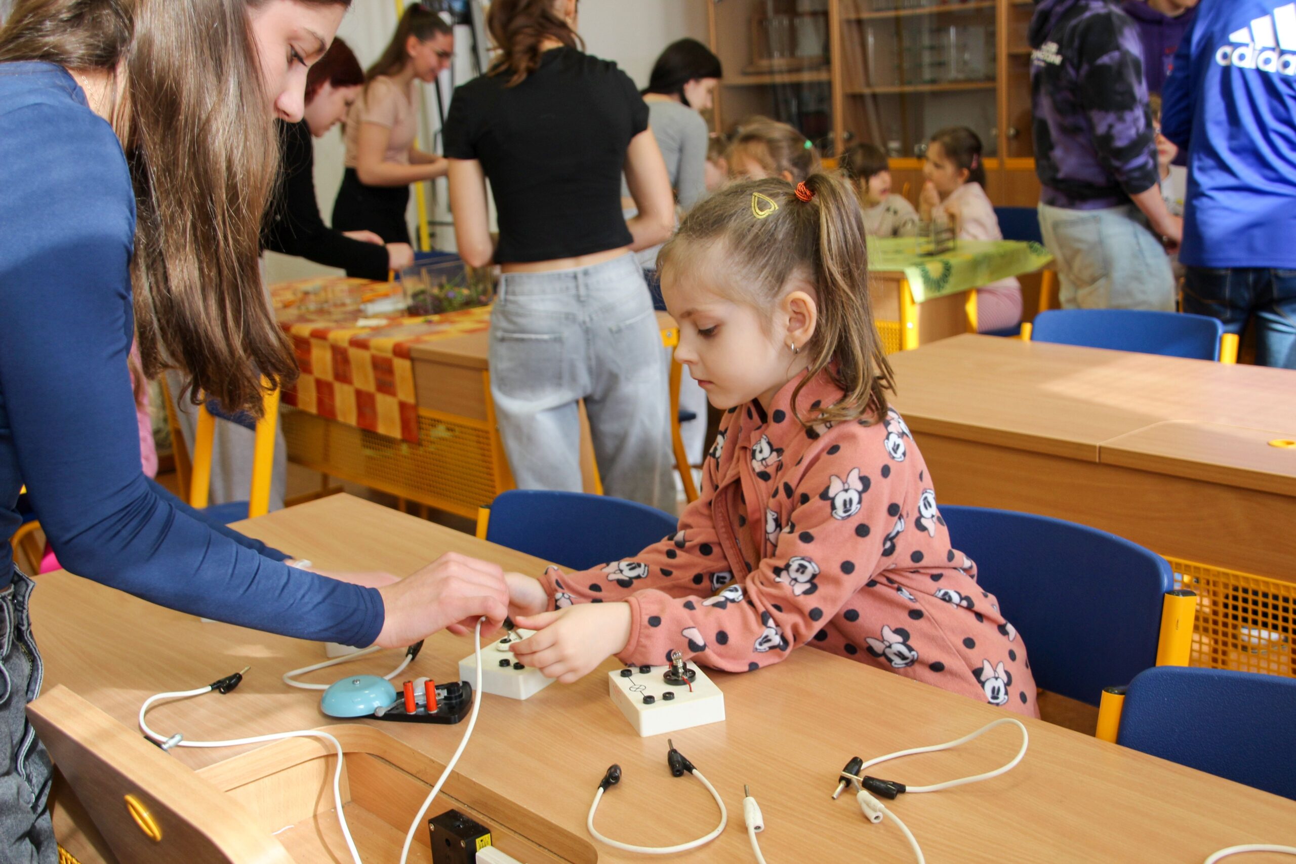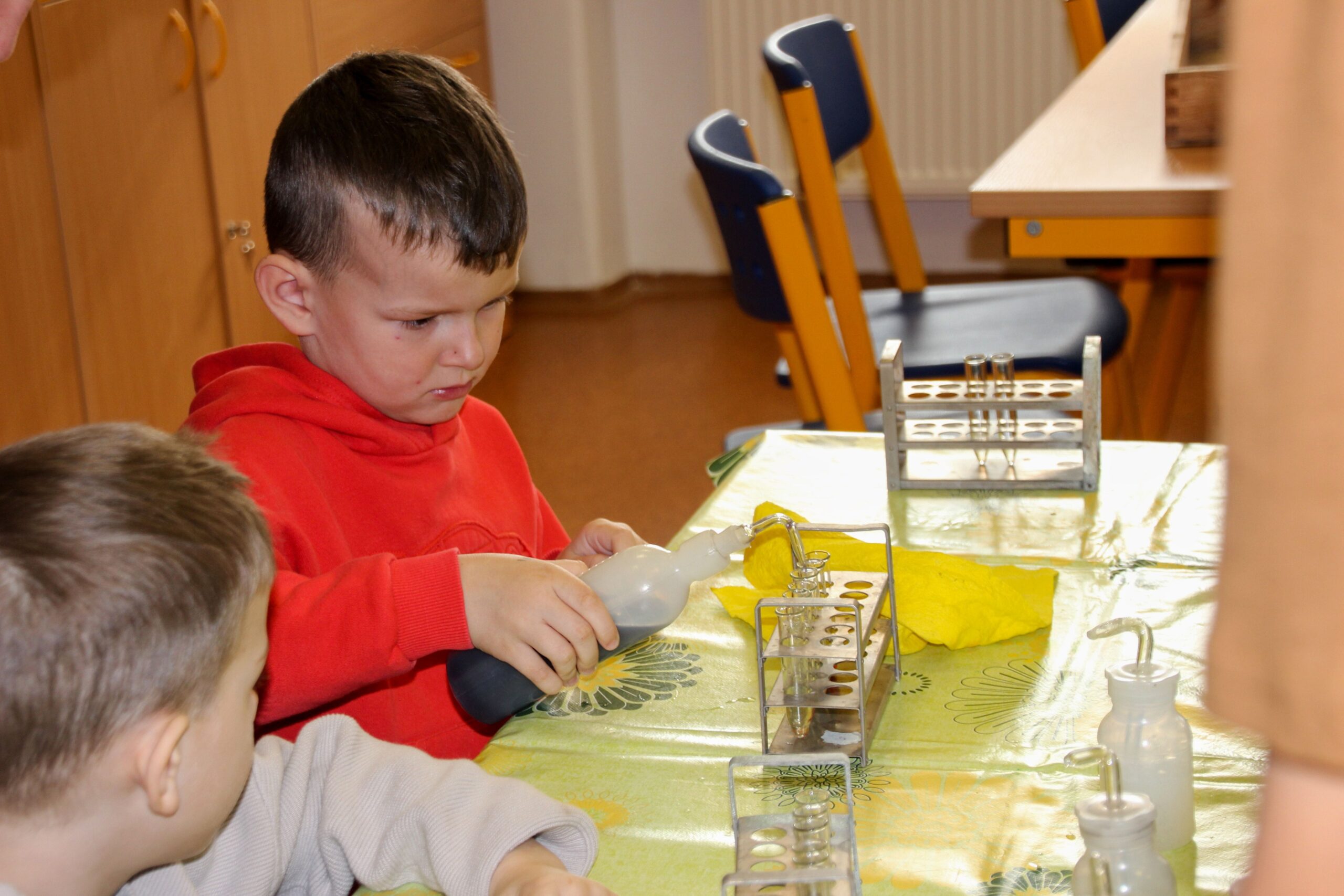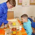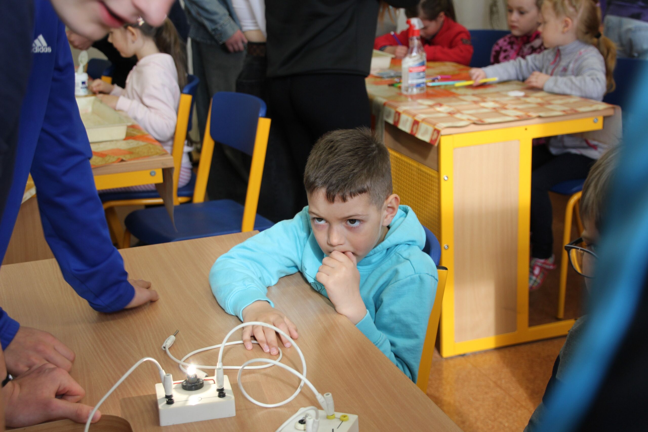 V úterý 14.4. 2026 jsme s žáky 8. třídy přivítali děti z oddělení Berušek Kelečské MŠ. Připravili jsme si pro ně mnoho pokusů, které mohly děti samy provádět. Letos si poprvé každý žáček školky vybral svého velkého kamaráda a ten ho provedl všemi pokusy. Asi to byla dobrá volba, protože každý věděl, jak a co dělat. Pokusy, které si mohli naši malí kamarádi vyzkoušet, musely být voleny tak, aby byly zcela bezpečné, takže jsme pracovali pouze s materiály, které lze najít v kuchyni (soda, ocet, kyselina citronová, mýdlo, červené zelí…). Děti nafukovaly balónky pomocí octu a sody, barvily roztok červeného zelí pomocí mýdla, octu nebo sody, sestavovaly elektrický obvod s žárovkou a zvonkem, měnily barvu kytiček sodou a kyselinou citronovou, pomocí železných pilin zobrazovali indukční čáry magnetu, kreslily barvami v mléce a podobně. Myslím si, že se u nás dětem líbilo, a rádi budeme v této spolupráci s MŠ pokračovat.