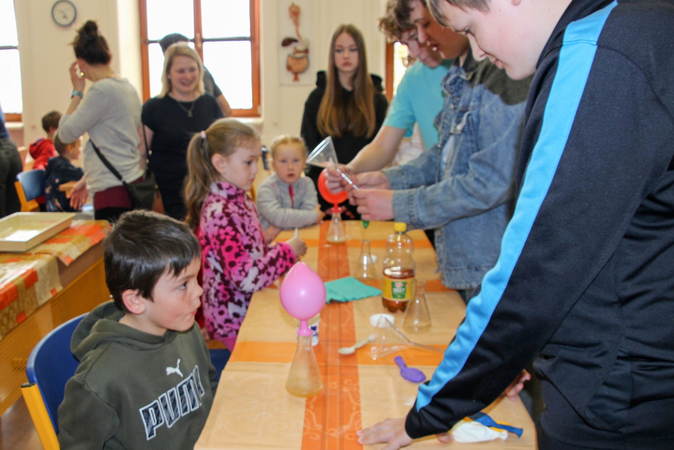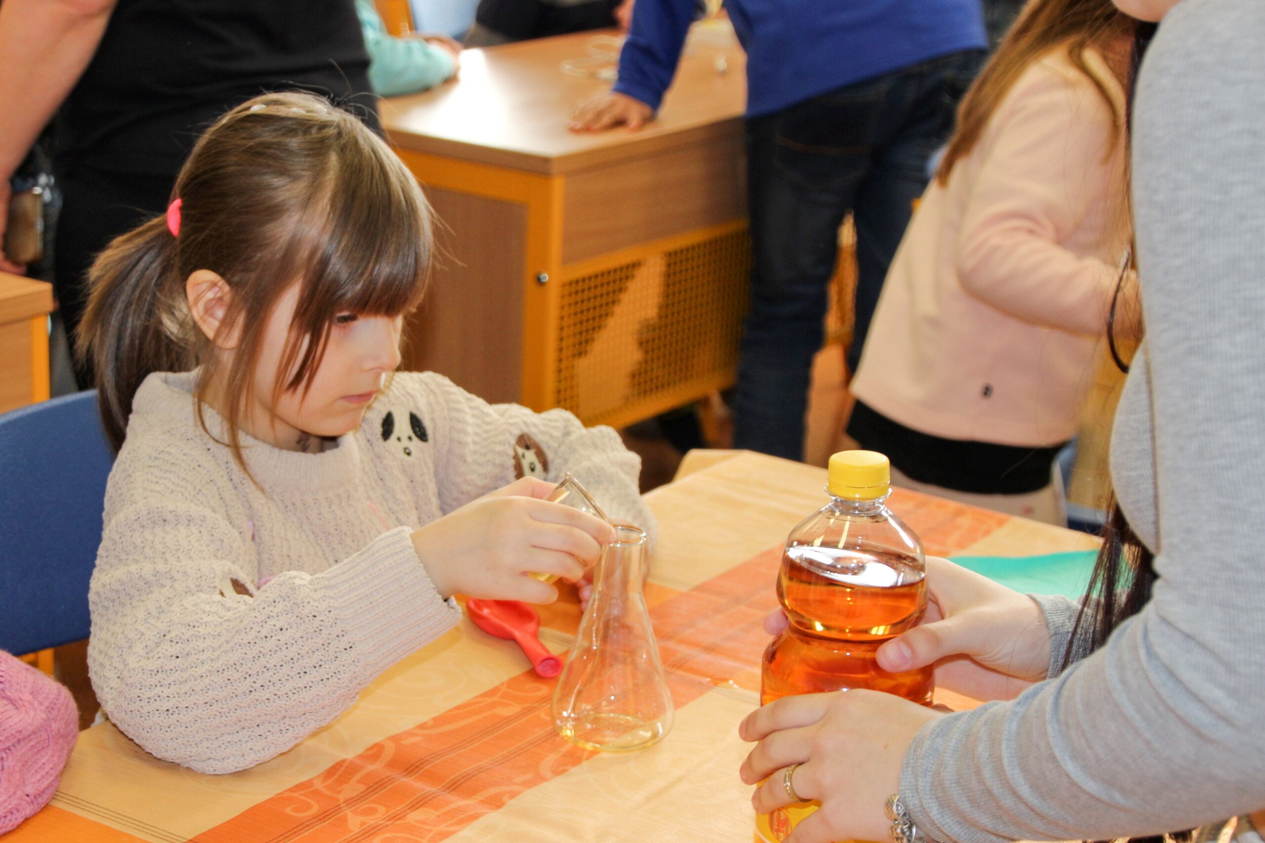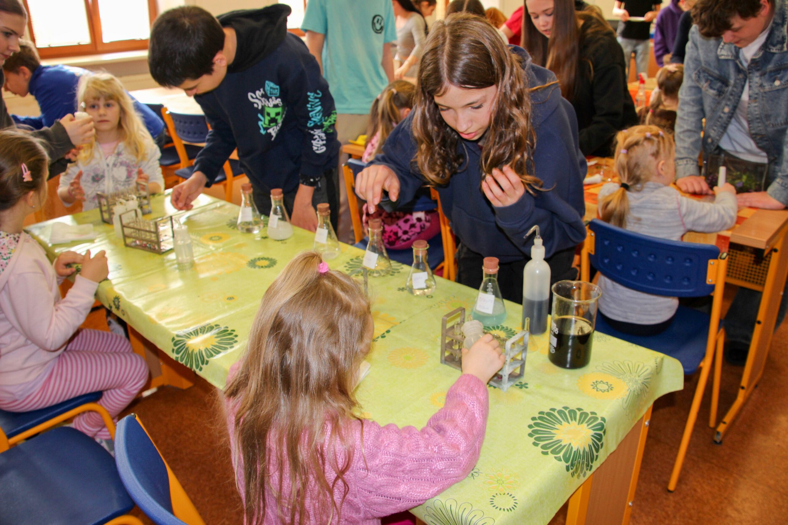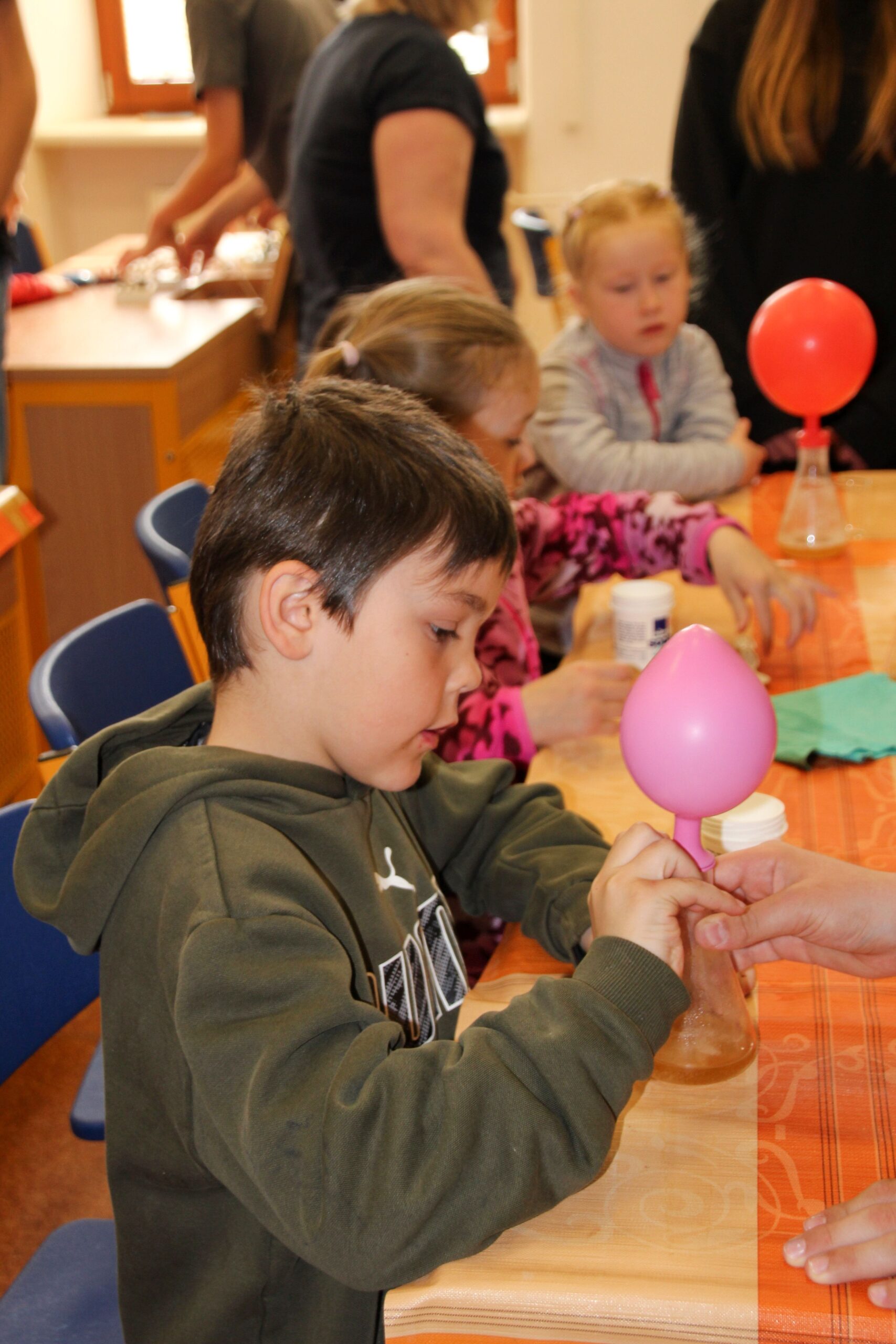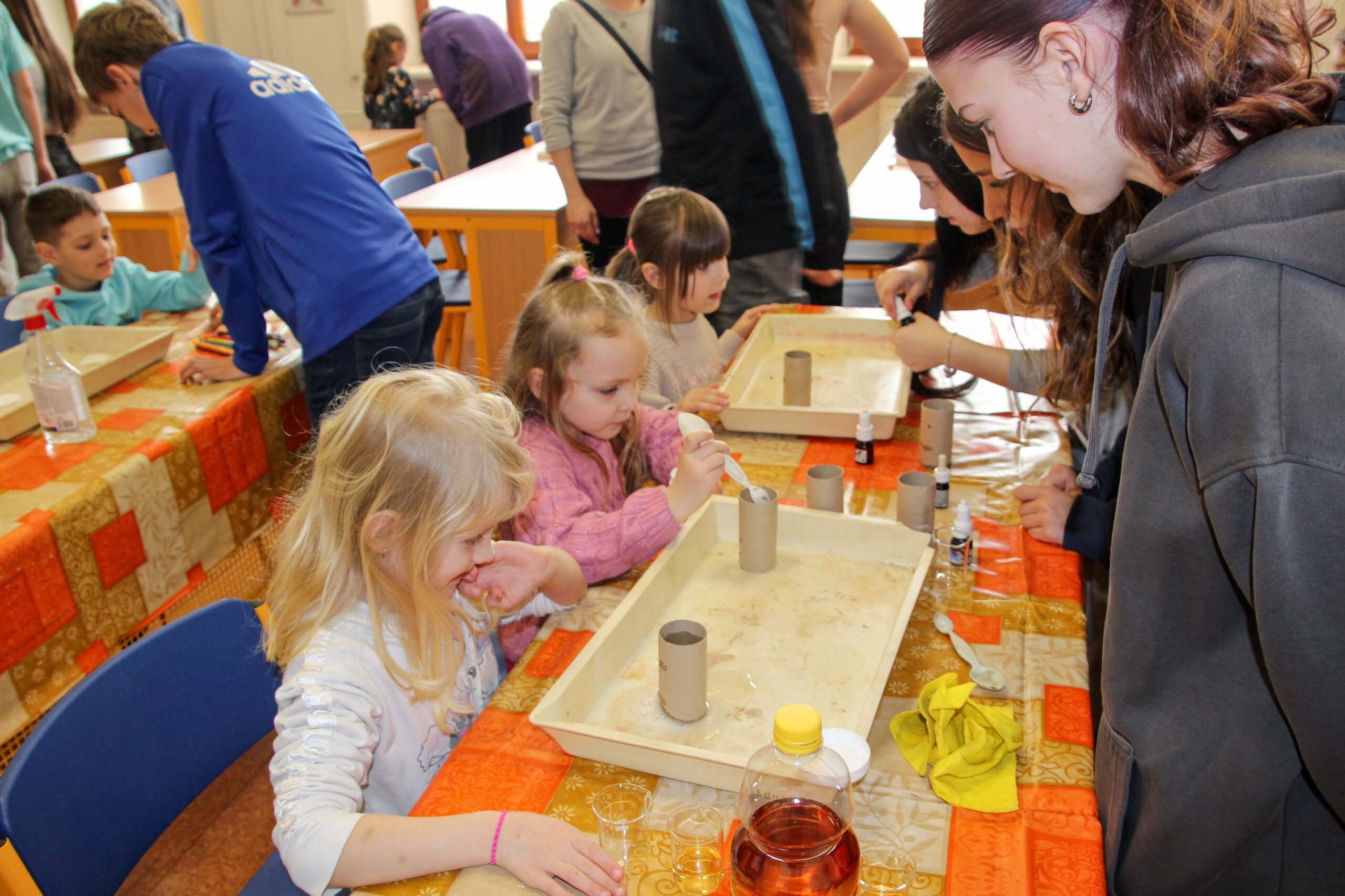 V úterý 14.4. 2026 jsme s žáky 8. třídy přivítali děti z oddělení Berušek Kelečské MŠ. Připravili jsme si pro ně mnoho pokusů, které mohly děti samy provádět. Letos si poprvé každý žáček školky vybral svého velkého kamaráda a ten ho provedl všemi pokusy. Asi to byla dobrá volba, protože každý věděl, jak a co dělat. Pokusy, které si mohli naši malí kamarádi vyzkoušet, musely být voleny tak, aby byly zcela bezpečné, takže jsme pracovali pouze s materiály, které lze najít v kuchyni (soda, ocet, kyselina citronová, mýdlo, červené zelí…). Děti nafukovaly balónky pomocí octu a sody, barvily roztok červeného zelí pomocí mýdla, octu nebo sody, sestavovaly elektrický obvod s žárovkou a zvonkem, měnily barvu kytiček sodou a kyselinou citronovou, pomocí železných pilin zobrazovali indukční čáry magnetu, kreslily barvami v mléce a podobně. Myslím si, že se u nás dětem líbilo, a rádi budeme v této spolupráci s MŠ pokračovat.