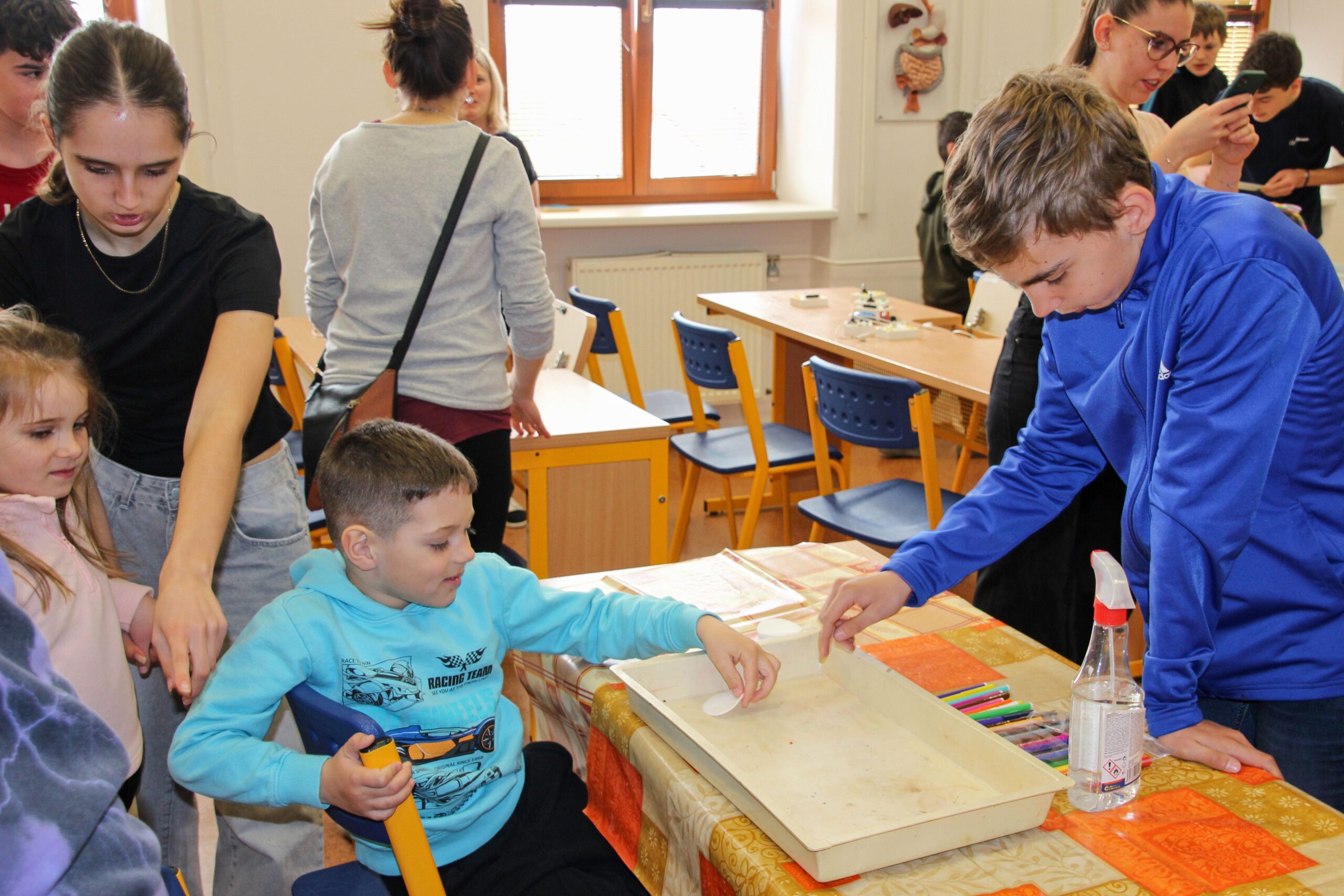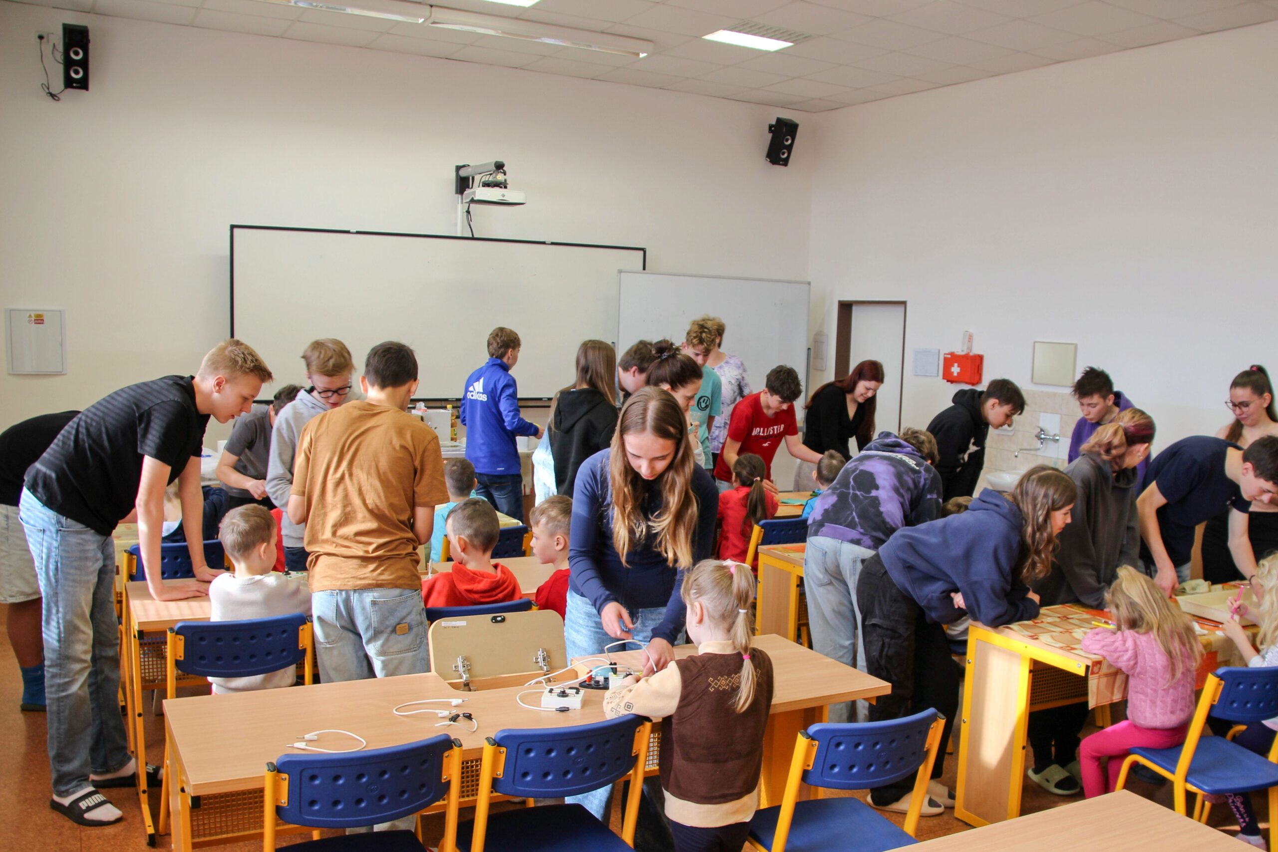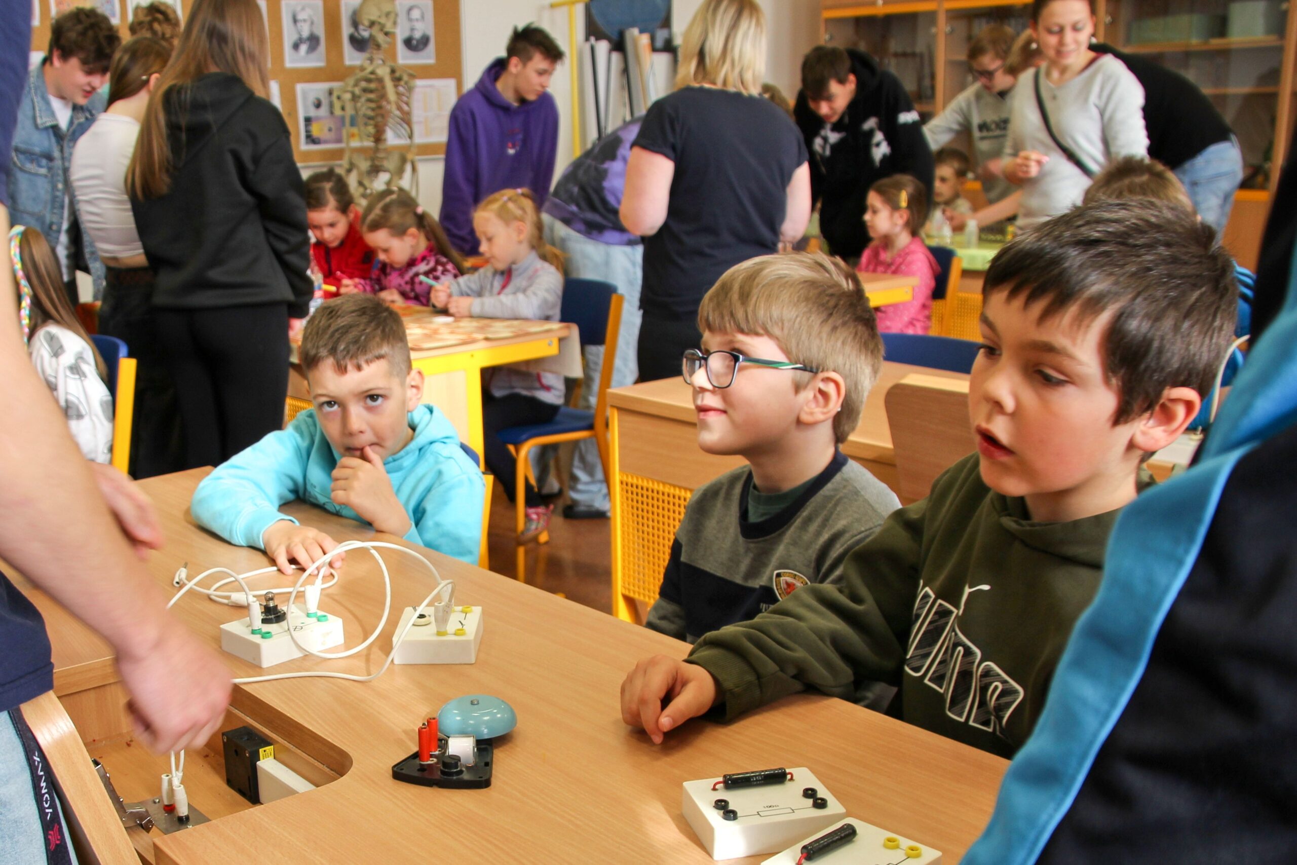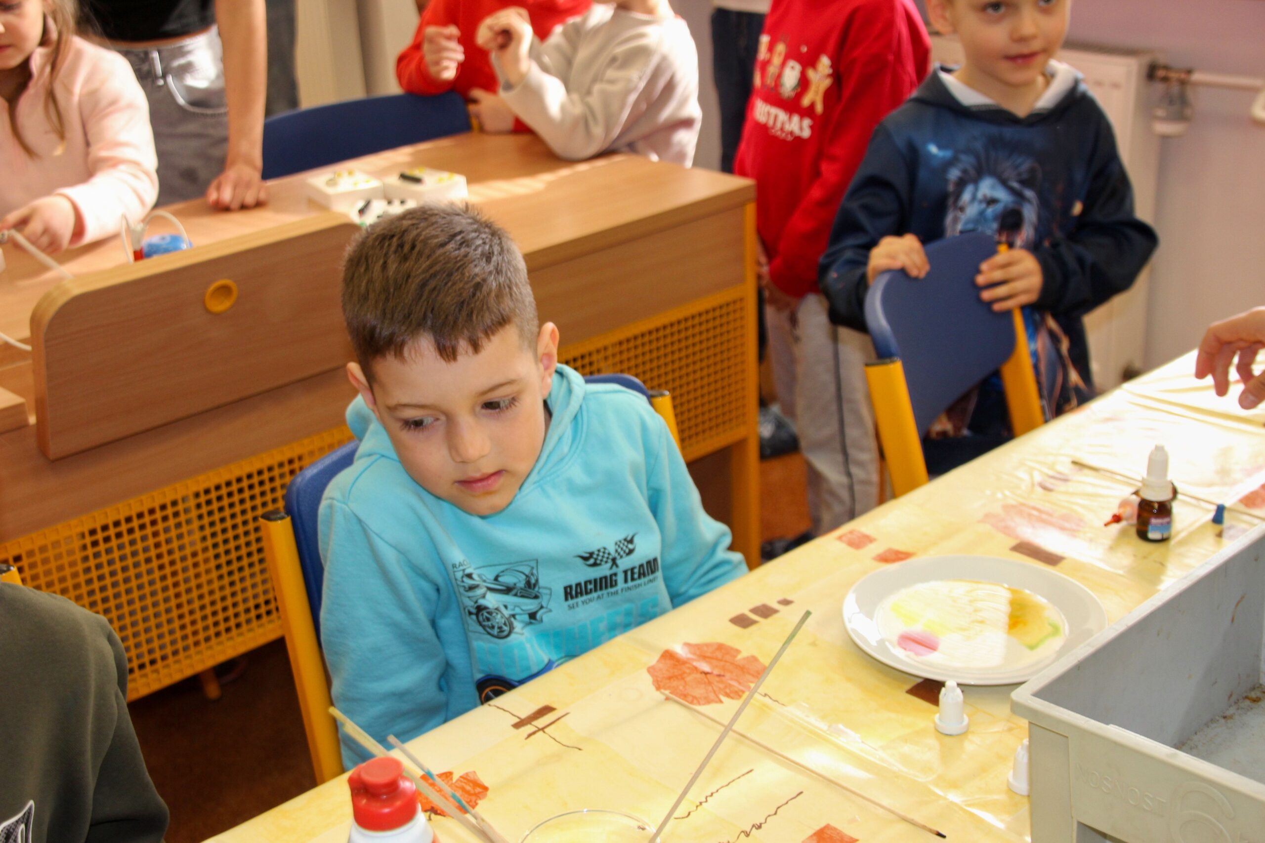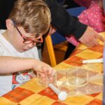 V úterý 14.4. 2026 jsme s žáky 8. třídy přivítali děti z oddělení Berušek Kelečské MŠ. Připravili jsme si pro ně mnoho pokusů, které mohly děti samy provádět. Letos si poprvé každý žáček školky vybral svého velkého kamaráda a ten ho provedl všemi pokusy. Asi to byla dobrá volba, protože každý věděl, jak a co dělat. Pokusy, které si mohli naši malí kamarádi vyzkoušet, musely být voleny tak, aby byly zcela bezpečné, takže jsme pracovali pouze s materiály, které lze najít v kuchyni (soda, ocet, kyselina citronová, mýdlo, červené zelí…). Děti nafukovaly balónky pomocí octu a sody, barvily roztok červeného zelí pomocí mýdla, octu nebo sody, sestavovaly elektrický obvod s žárovkou a zvonkem, měnily barvu kytiček sodou a kyselinou citronovou, pomocí železných pilin zobrazovali indukční čáry magnetu, kreslily barvami v mléce a podobně. Myslím si, že se u nás dětem líbilo, a rádi budeme v této spolupráci s MŠ pokračovat.