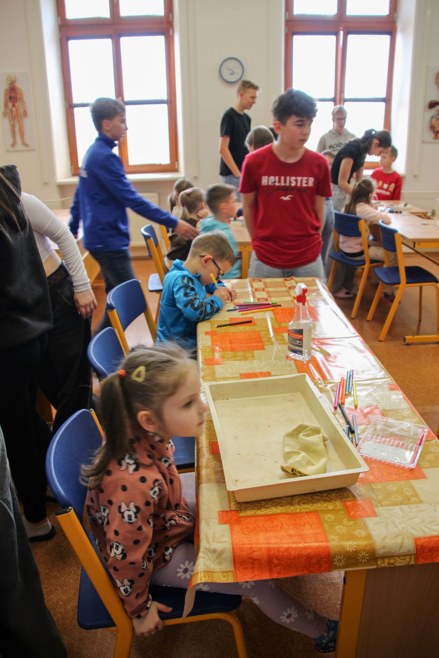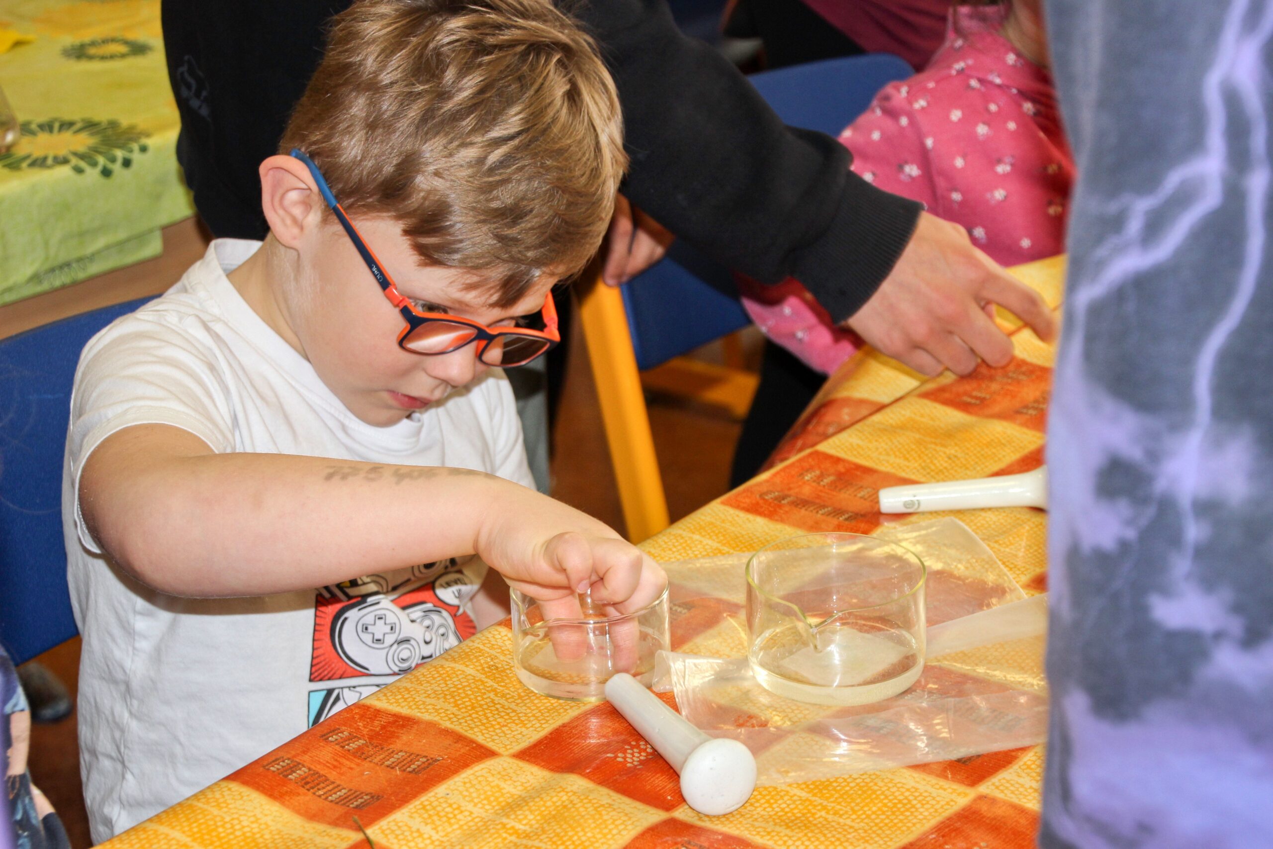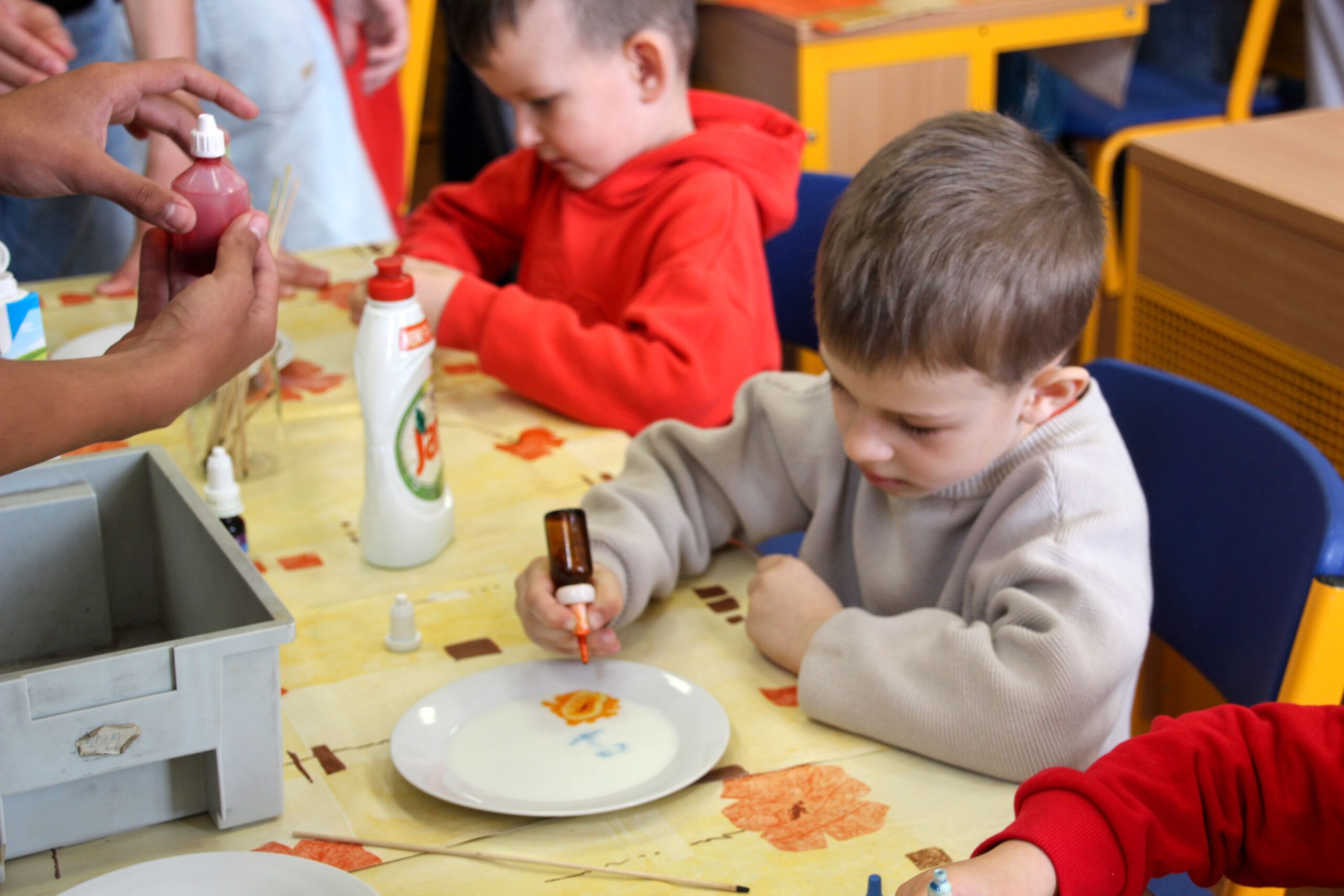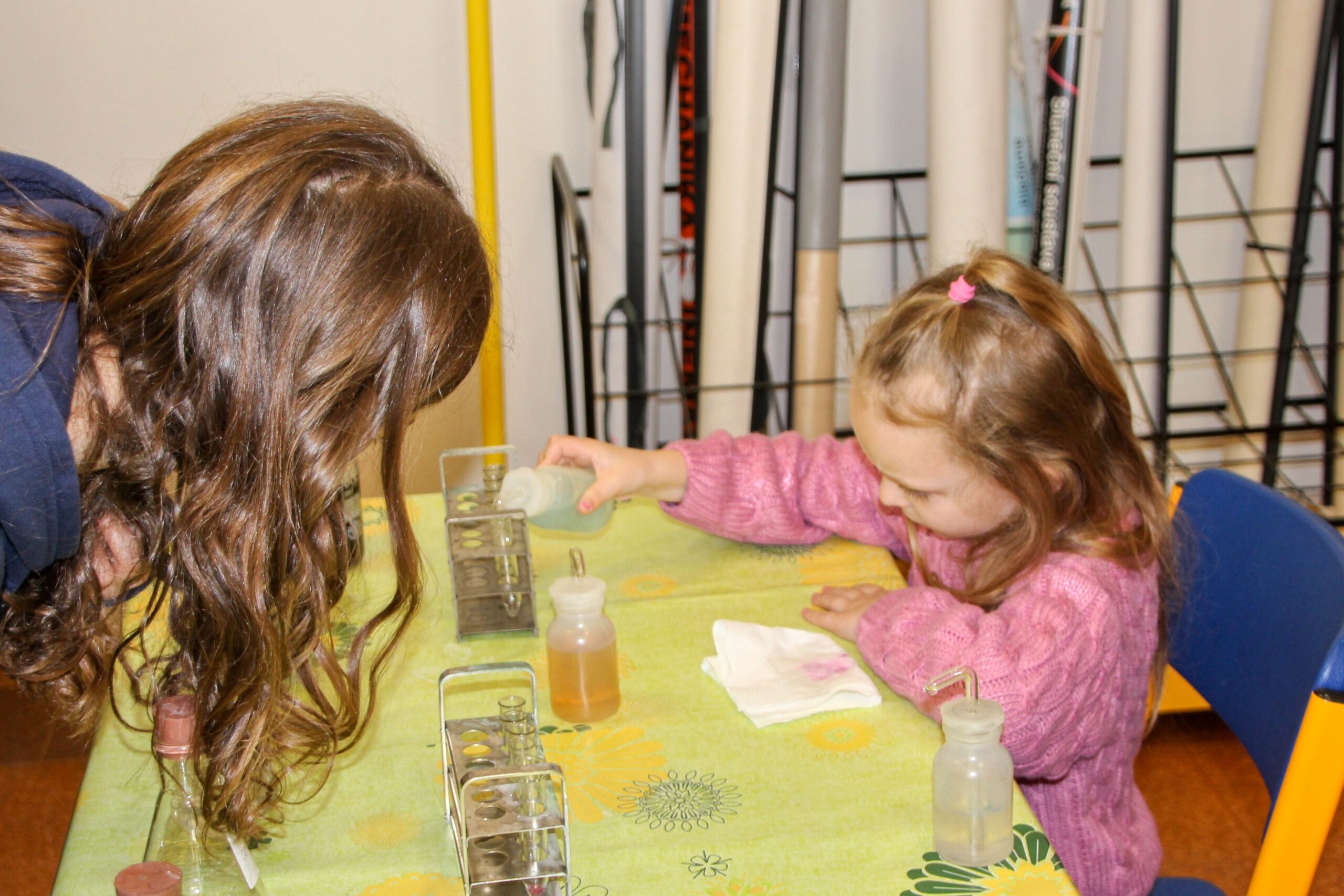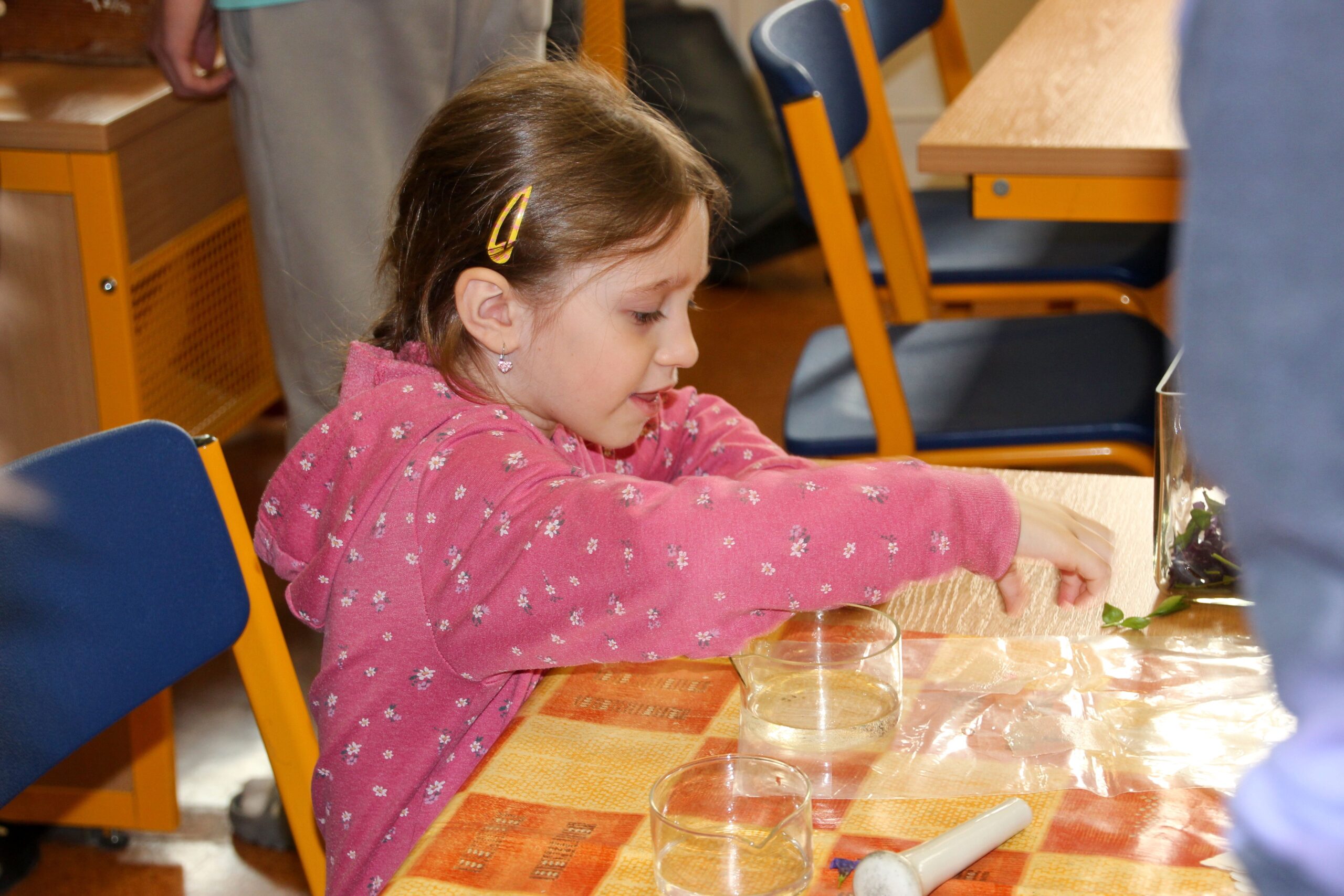 V úterý 14.4. 2026 jsme s žáky 8. třídy přivítali děti z oddělení Berušek Kelečské MŠ. Připravili jsme si pro ně mnoho pokusů, které mohly děti samy provádět. Letos si poprvé každý žáček školky vybral svého velkého kamaráda a ten ho provedl všemi pokusy. Asi to byla dobrá volba, protože každý věděl, jak a co dělat. Pokusy, které si mohli naši malí kamarádi vyzkoušet, musely být voleny tak, aby byly zcela bezpečné, takže jsme pracovali pouze s materiály, které lze najít v kuchyni (soda, ocet, kyselina citronová, mýdlo, červené zelí…). Děti nafukovaly balónky pomocí octu a sody, barvily roztok červeného zelí pomocí mýdla, octu nebo sody, sestavovaly elektrický obvod s žárovkou a zvonkem, měnily barvu kytiček sodou a kyselinou citronovou, pomocí železných pilin zobrazovali indukční čáry magnetu, kreslily barvami v mléce a podobně. Myslím si, že se u nás dětem líbilo, a rádi budeme v této spolupráci s MŠ pokračovat.