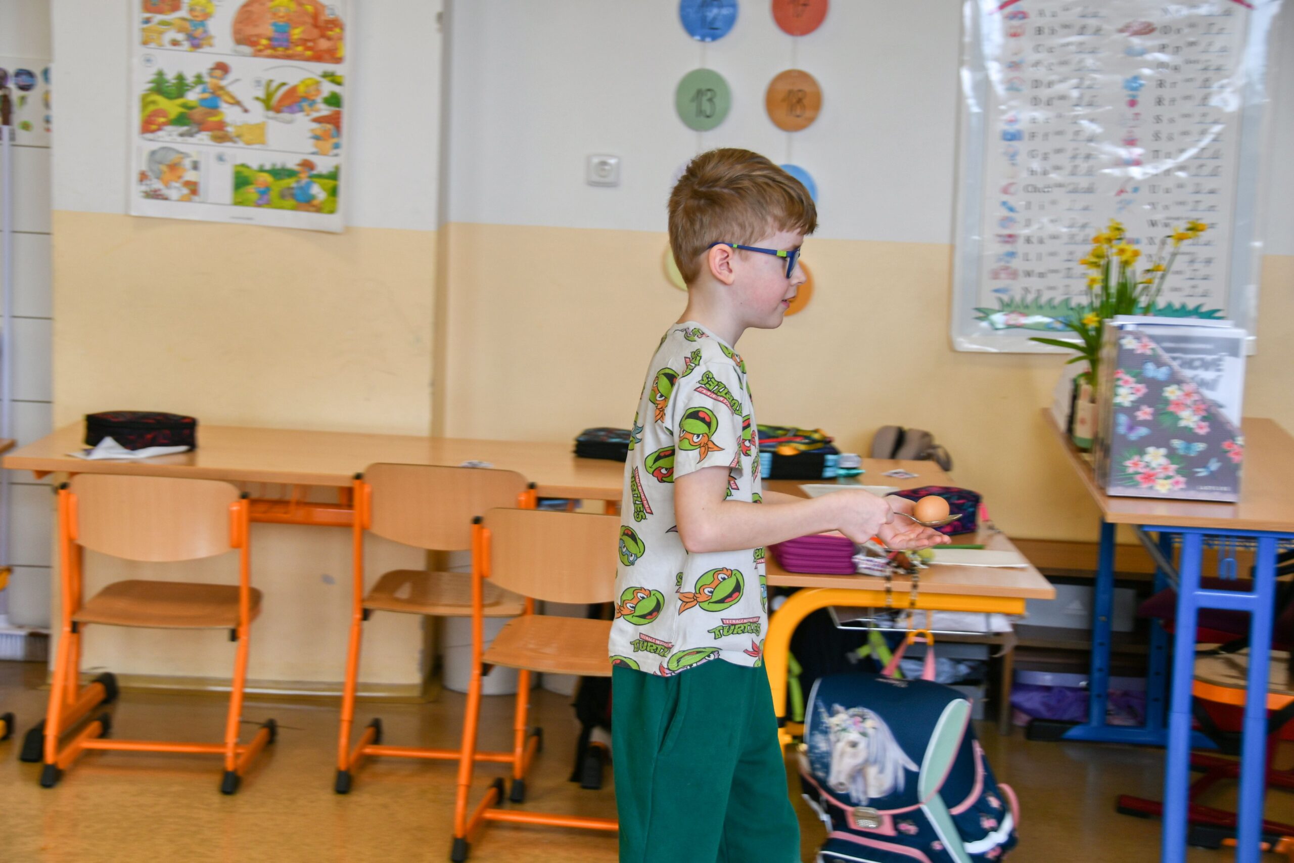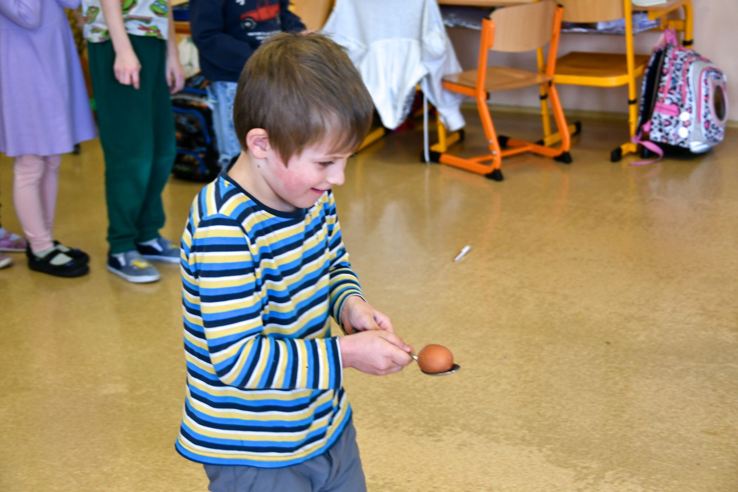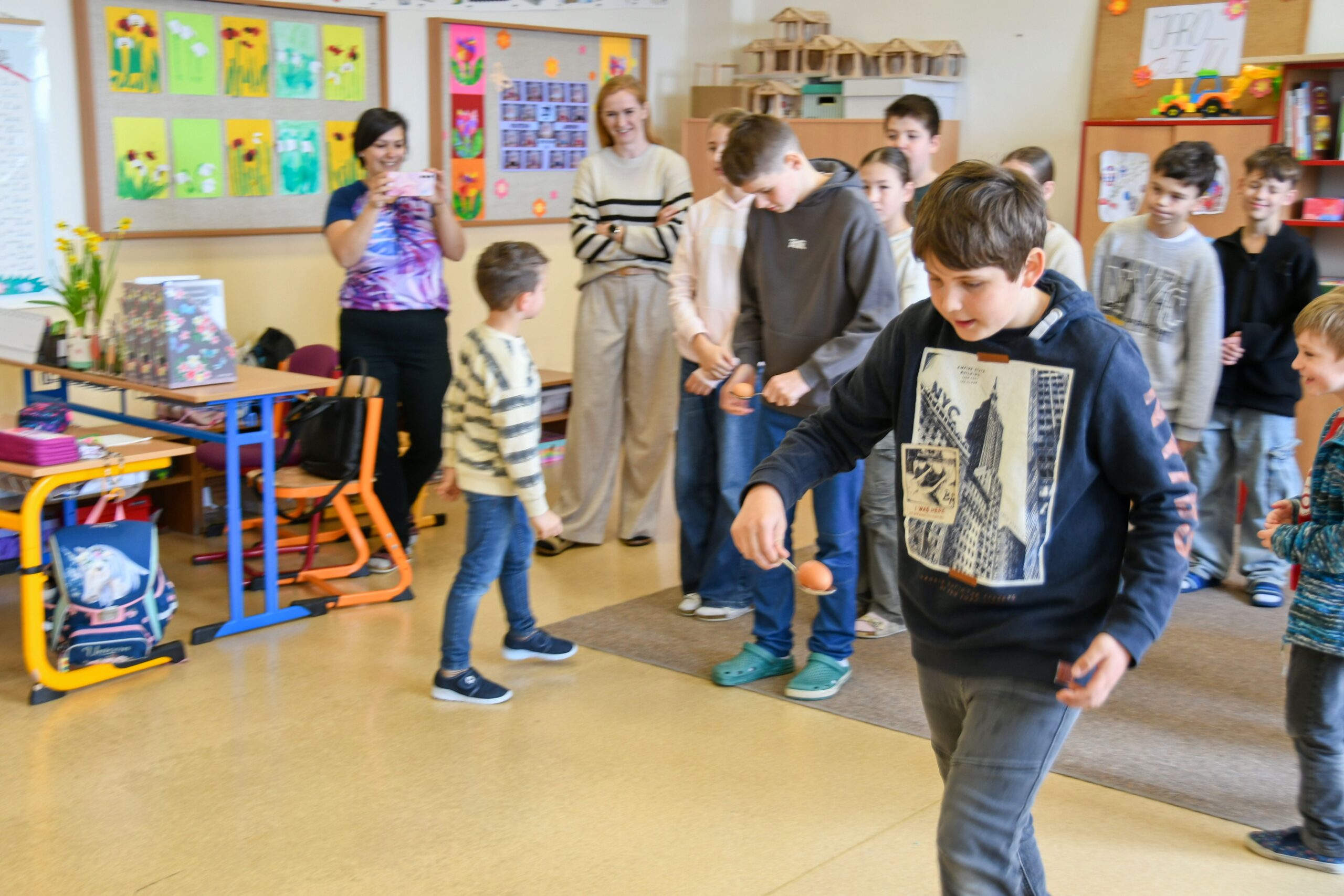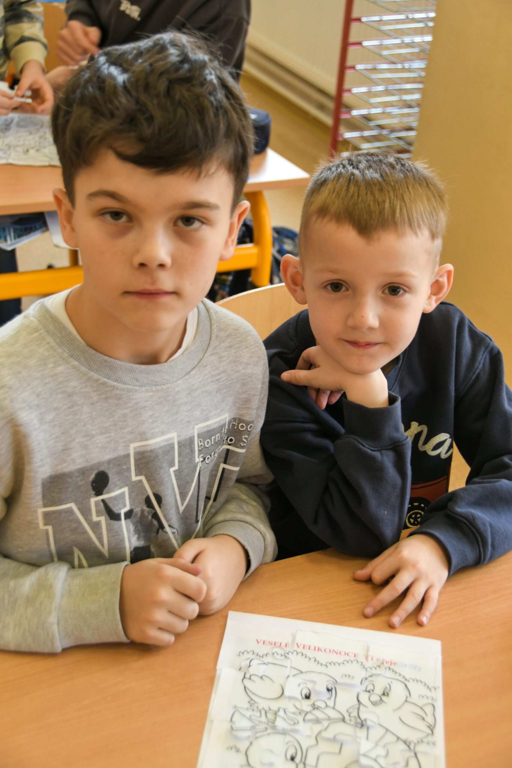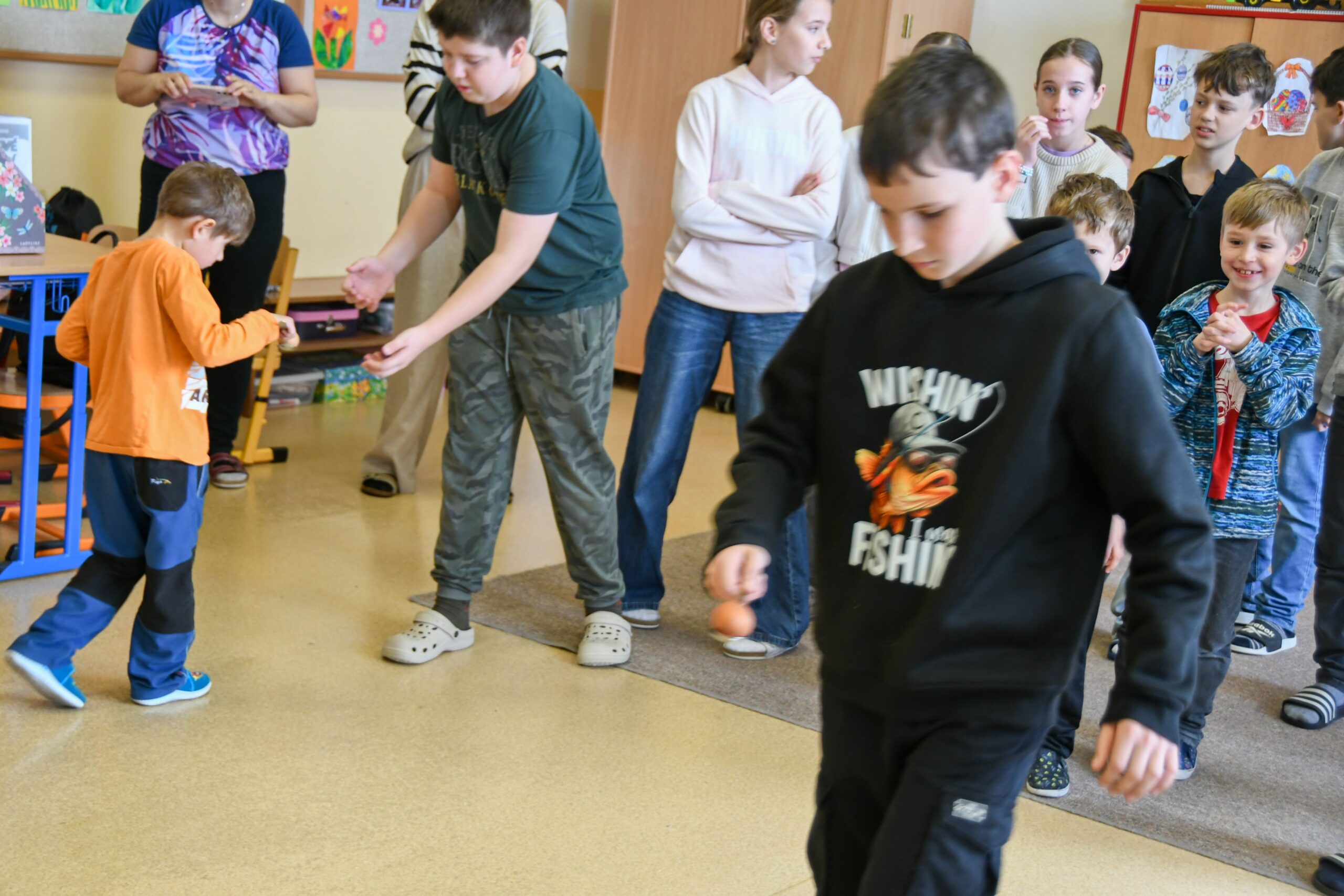 Velkým zážitkem bylo hledání velikonočních vajíček, do kterého se všichni s nadšením zapojili. Prvňáčci hledali a šesťáci počítali získané body. Nechyběly ani zábavné aktivity jako přenášení vajíček na lžičce, posílání vajíčka tunelem nebo skládání puzzlí, které šesťáci sami pro své mladší kamarády připravili.